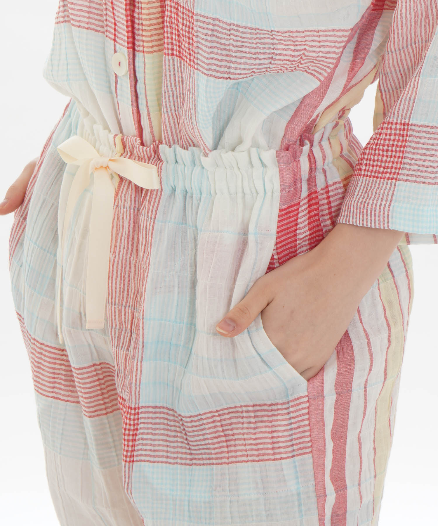 初春から秋口まで着用出来る7分袖、くるぶし丈(9分丈)の前開きセットアップ。
