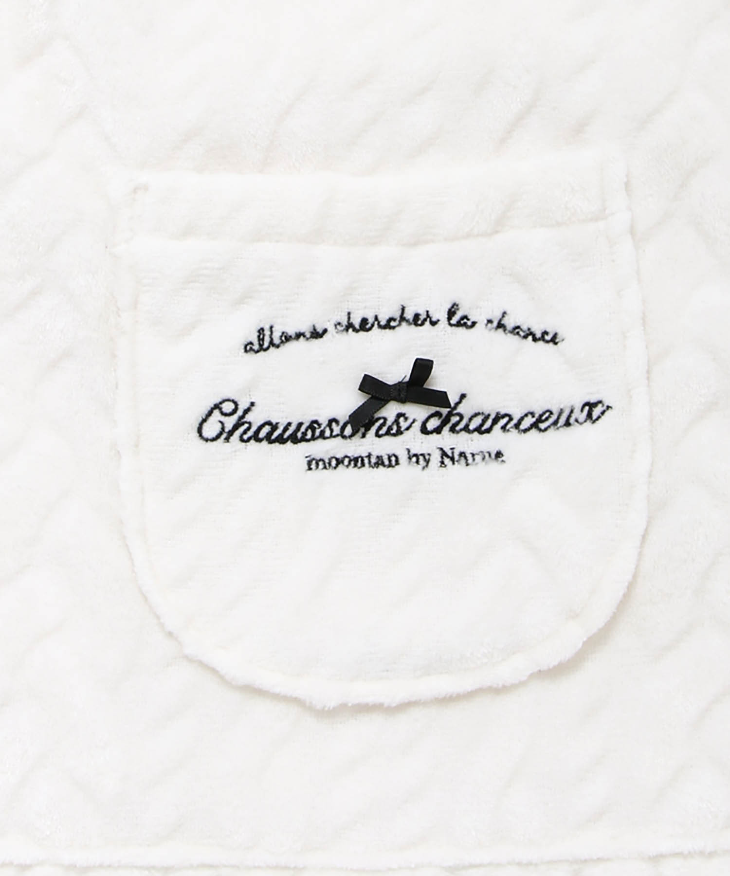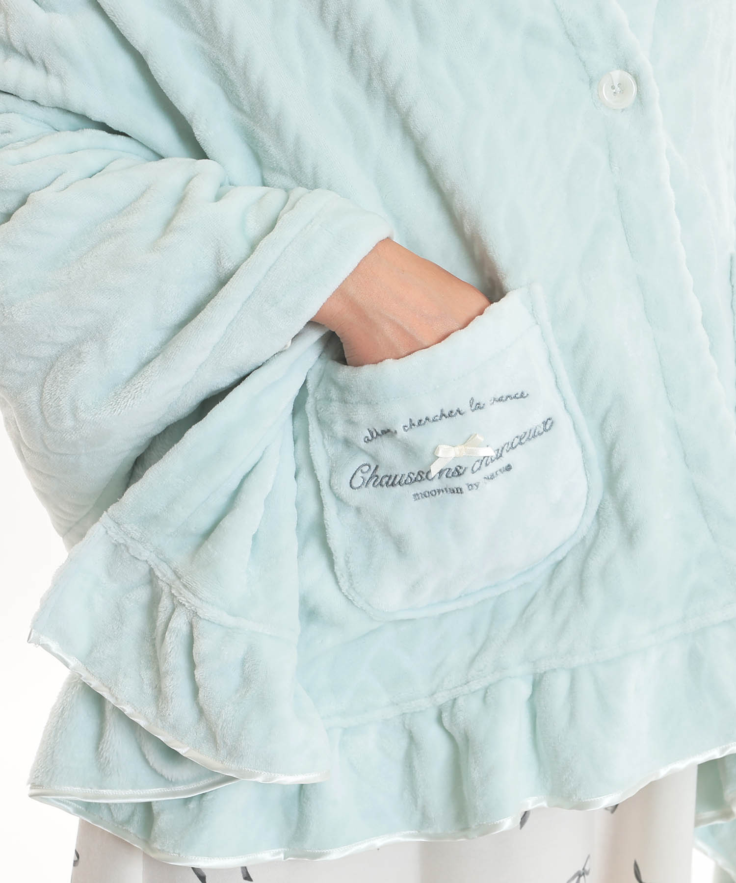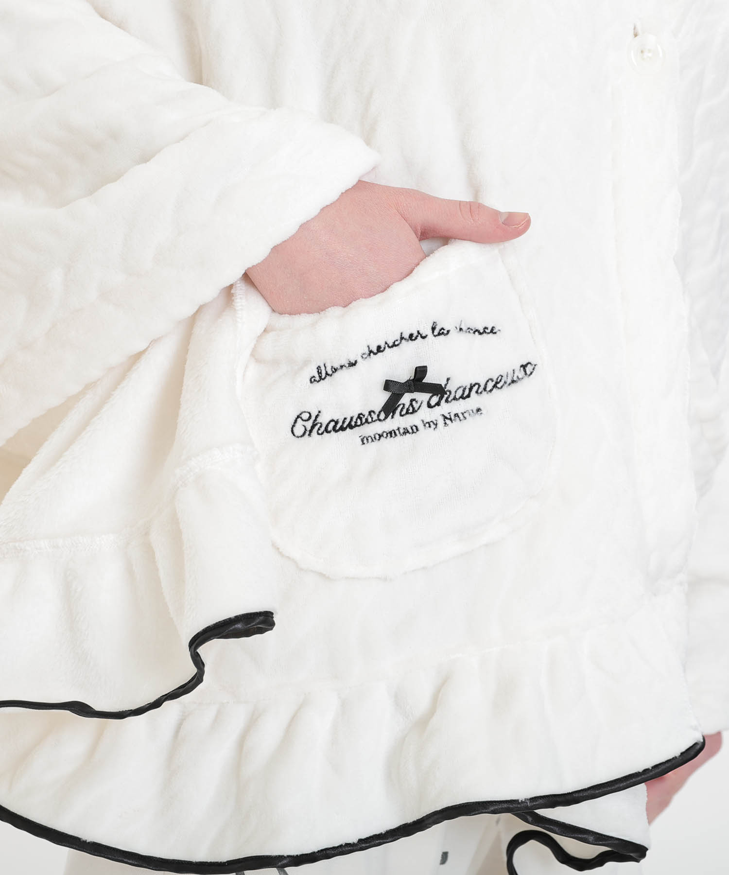 さりげないポケットのロゴ刺繍と、フリル端の光沢が綺麗なサテンのトリミングで上品な印象に。