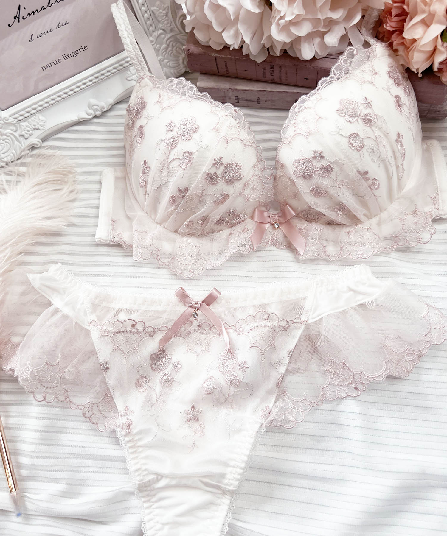 デコラティブで繊細なレースに甘いカラー展開を組み合わせたランジェリーシリーズ。全体の透け感やシルエットが女性らしいフェミニンなデザインです。