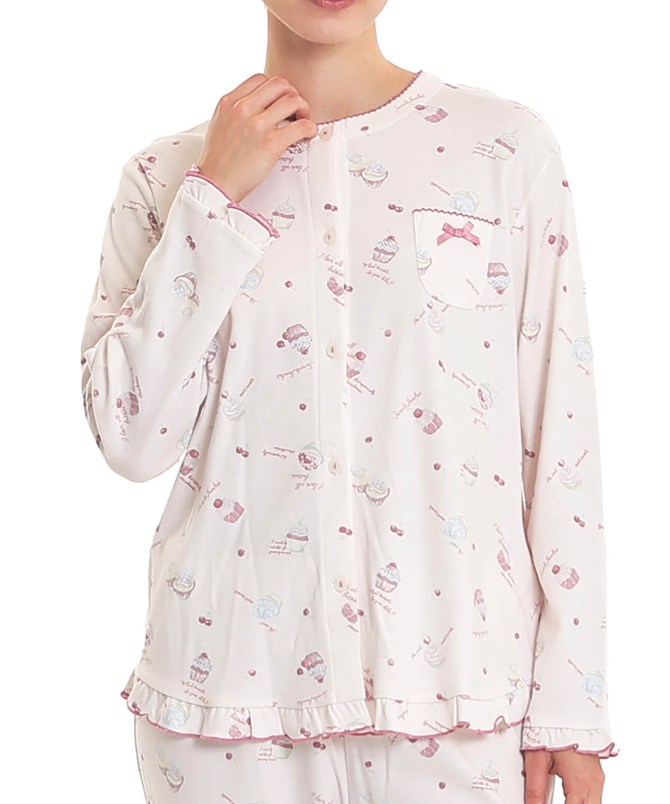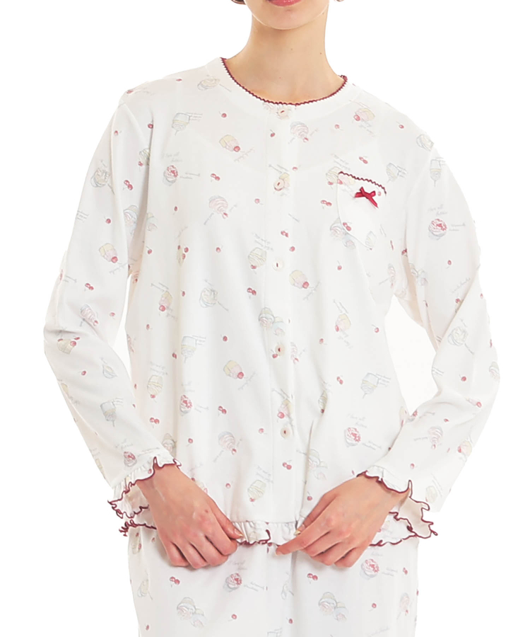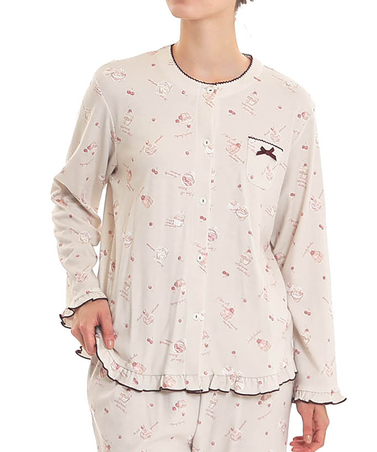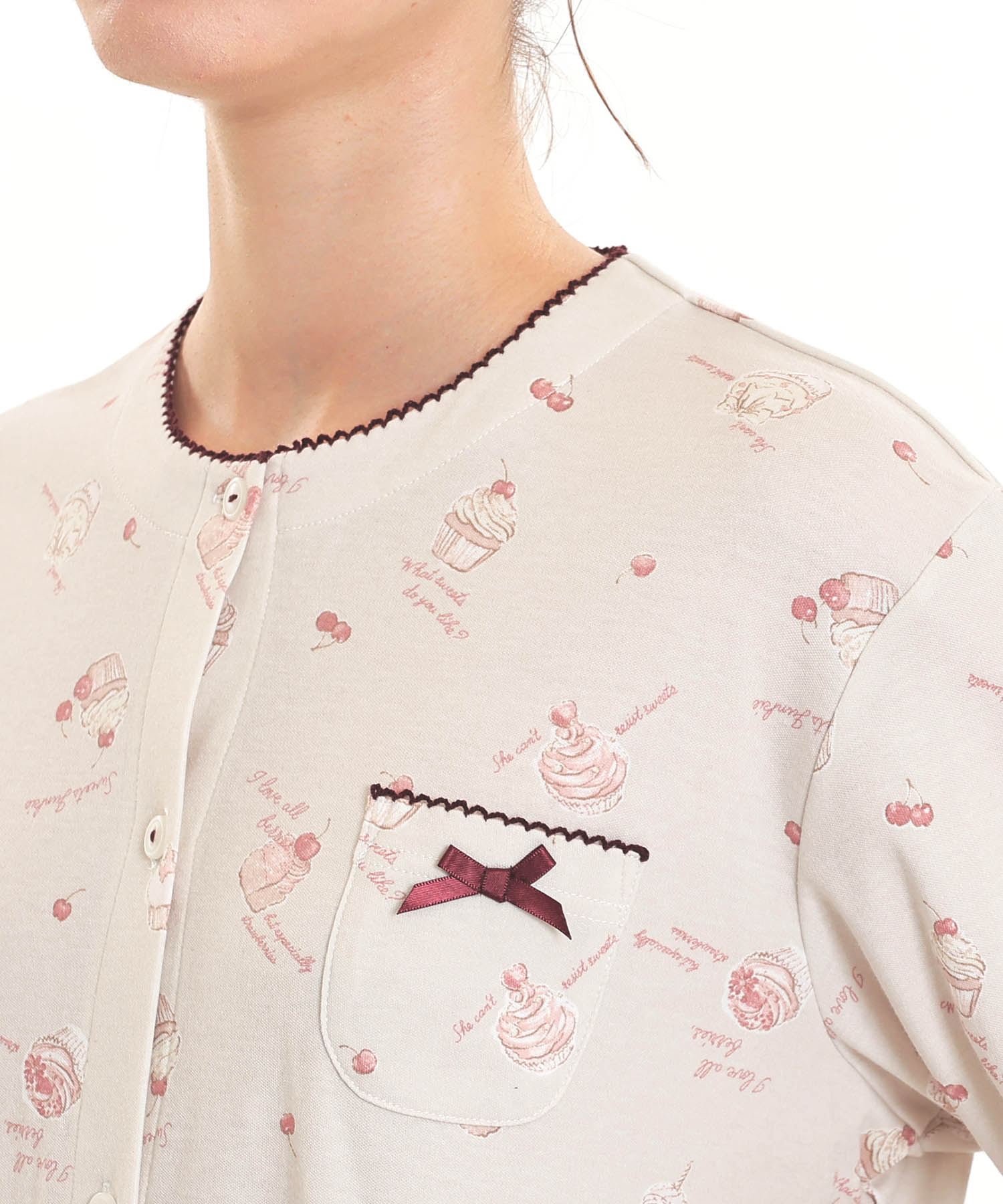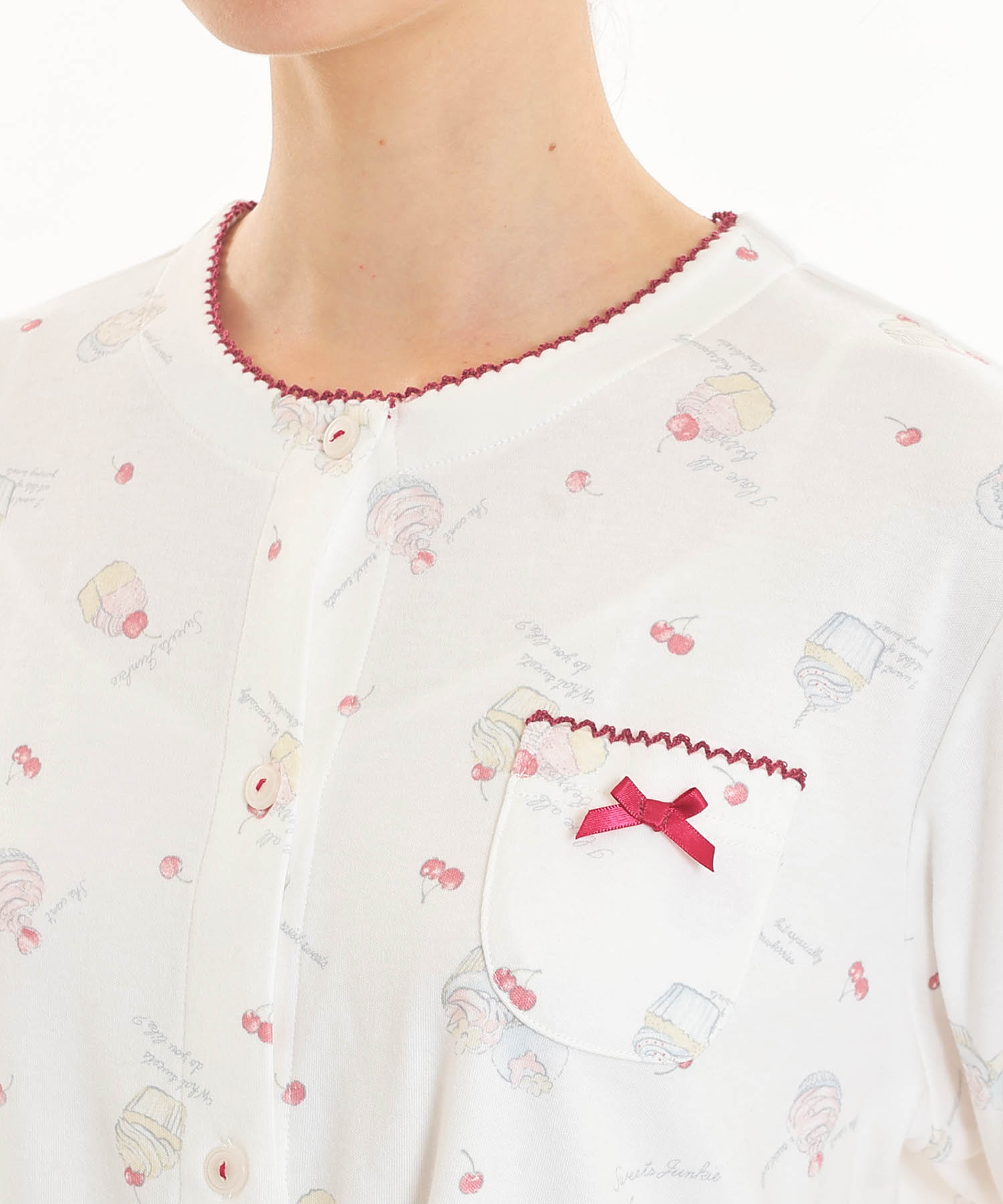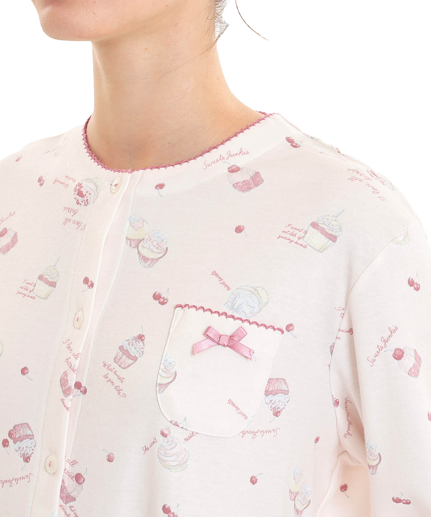 襟なしのクルーネックで首回りがすっきりとしている、前開きパジャマ。