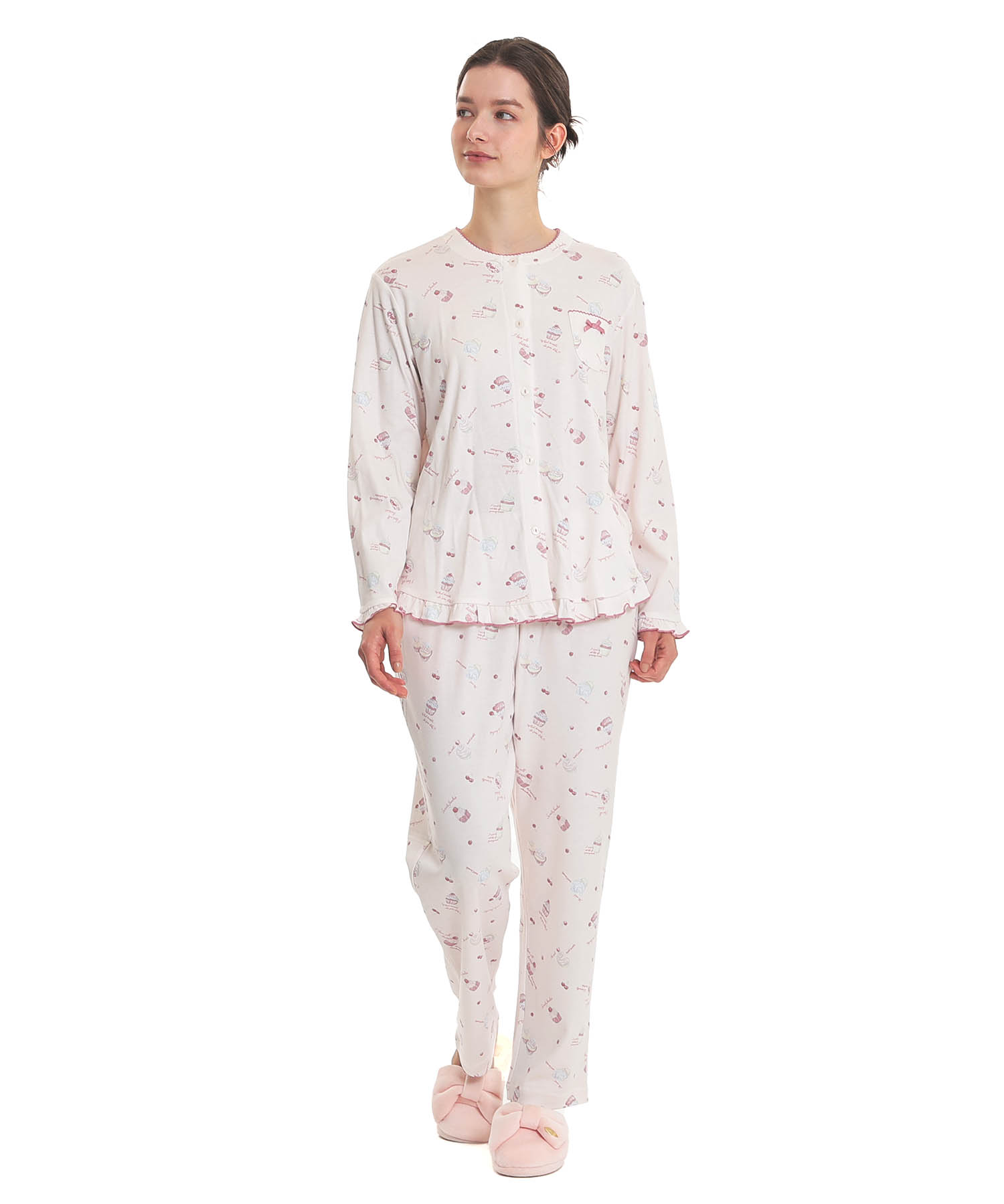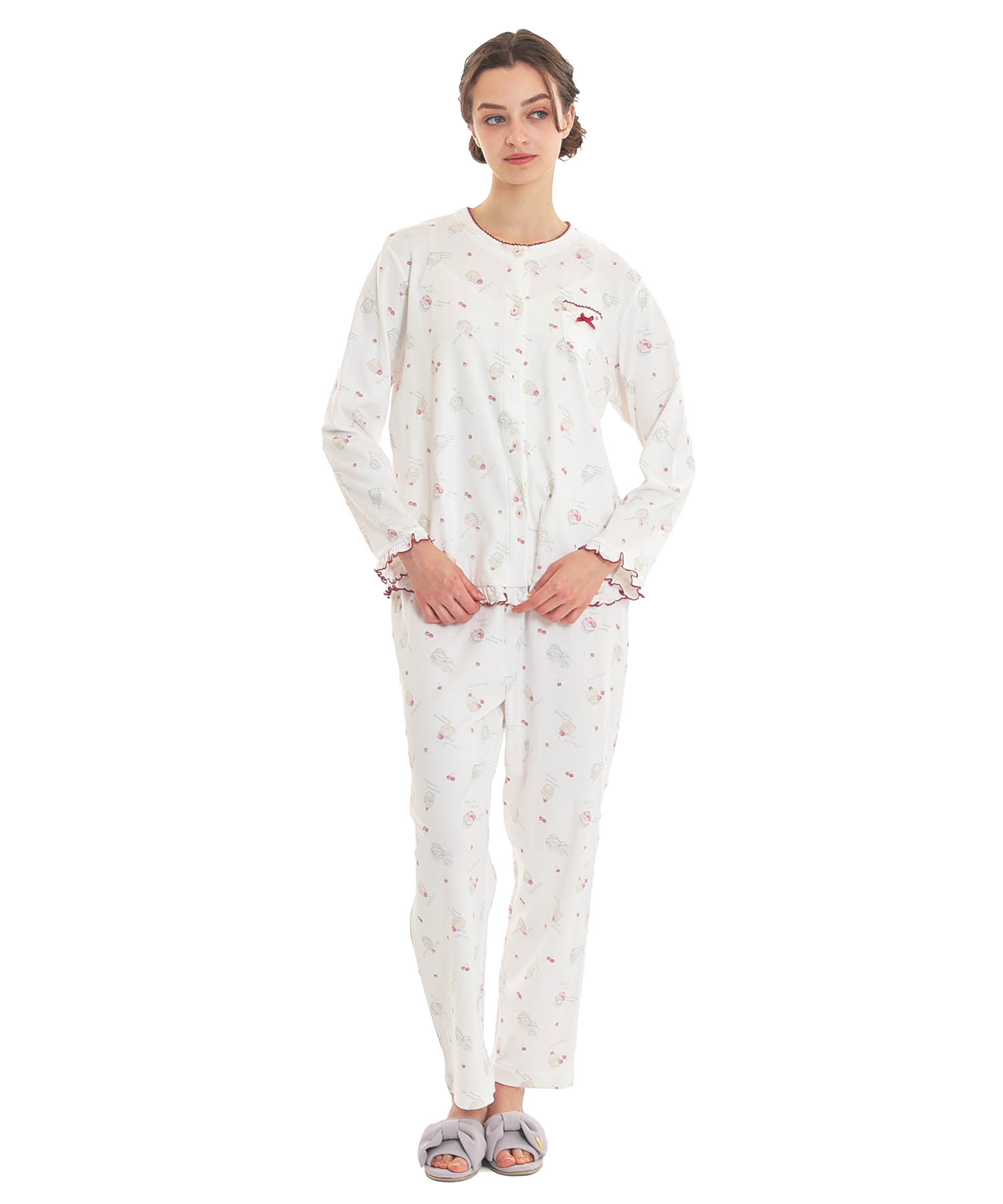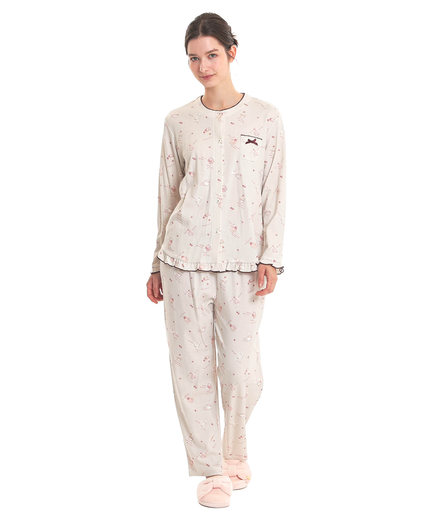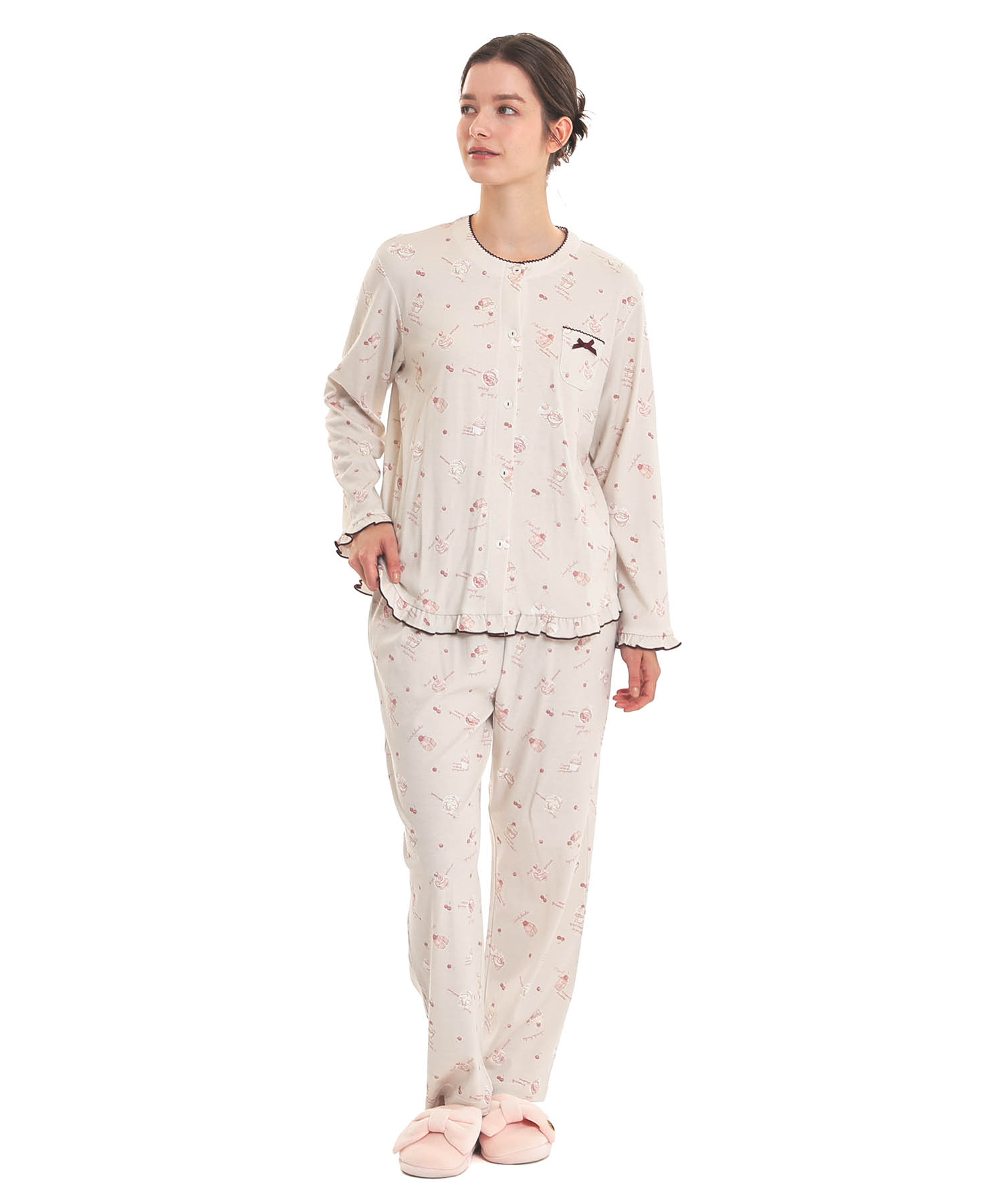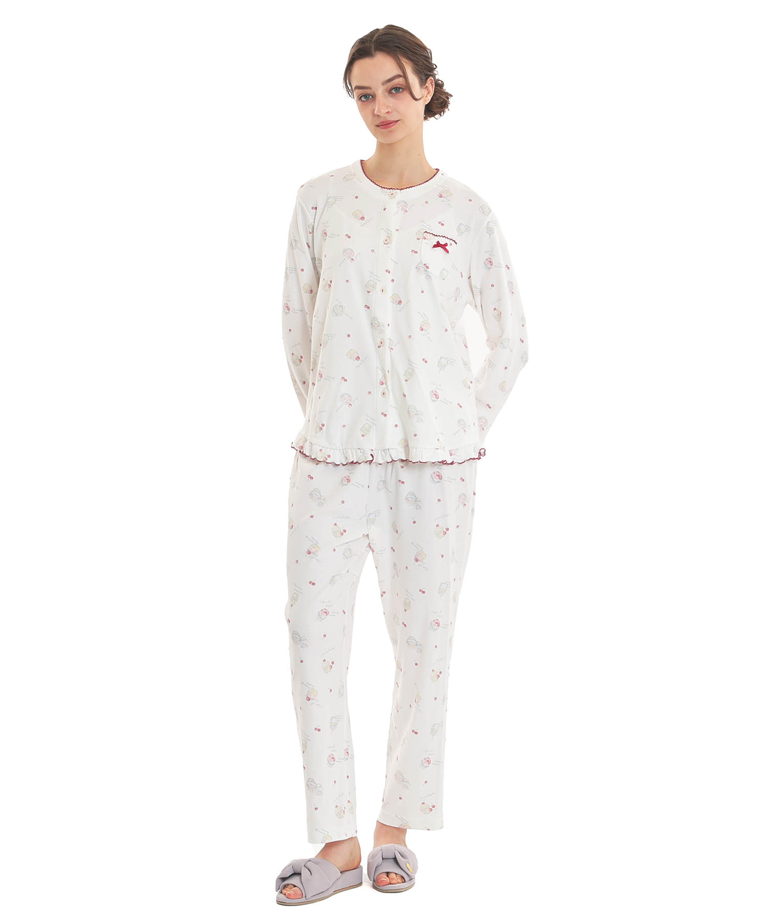 襟なしのクルーネックで首回りがすっきりとしている、前開きパジャマ。