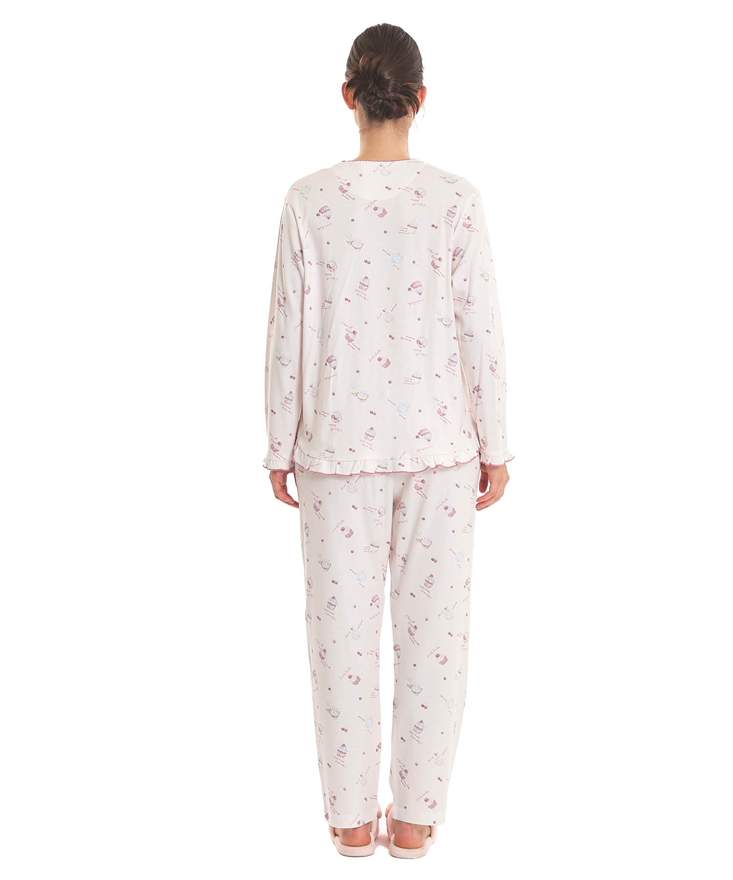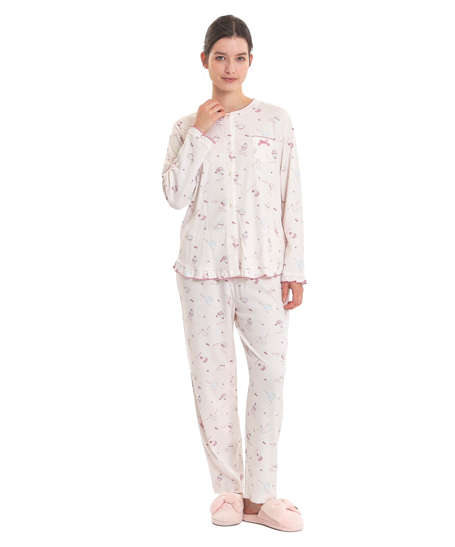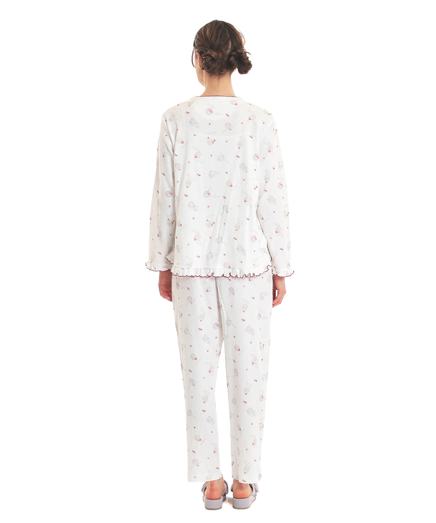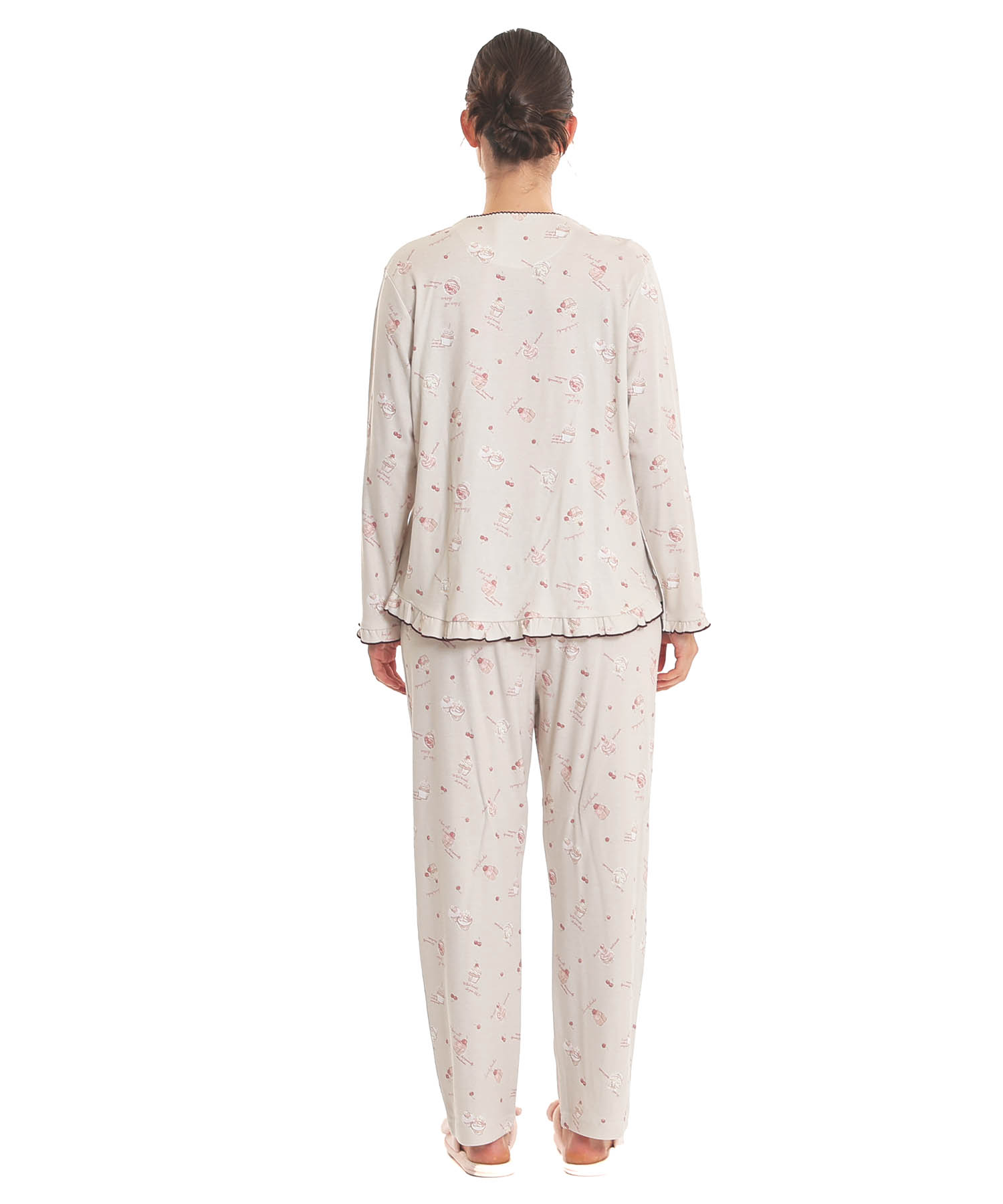 襟なしのクルーネックで首回りがすっきりとしている、前開きパジャマ。
