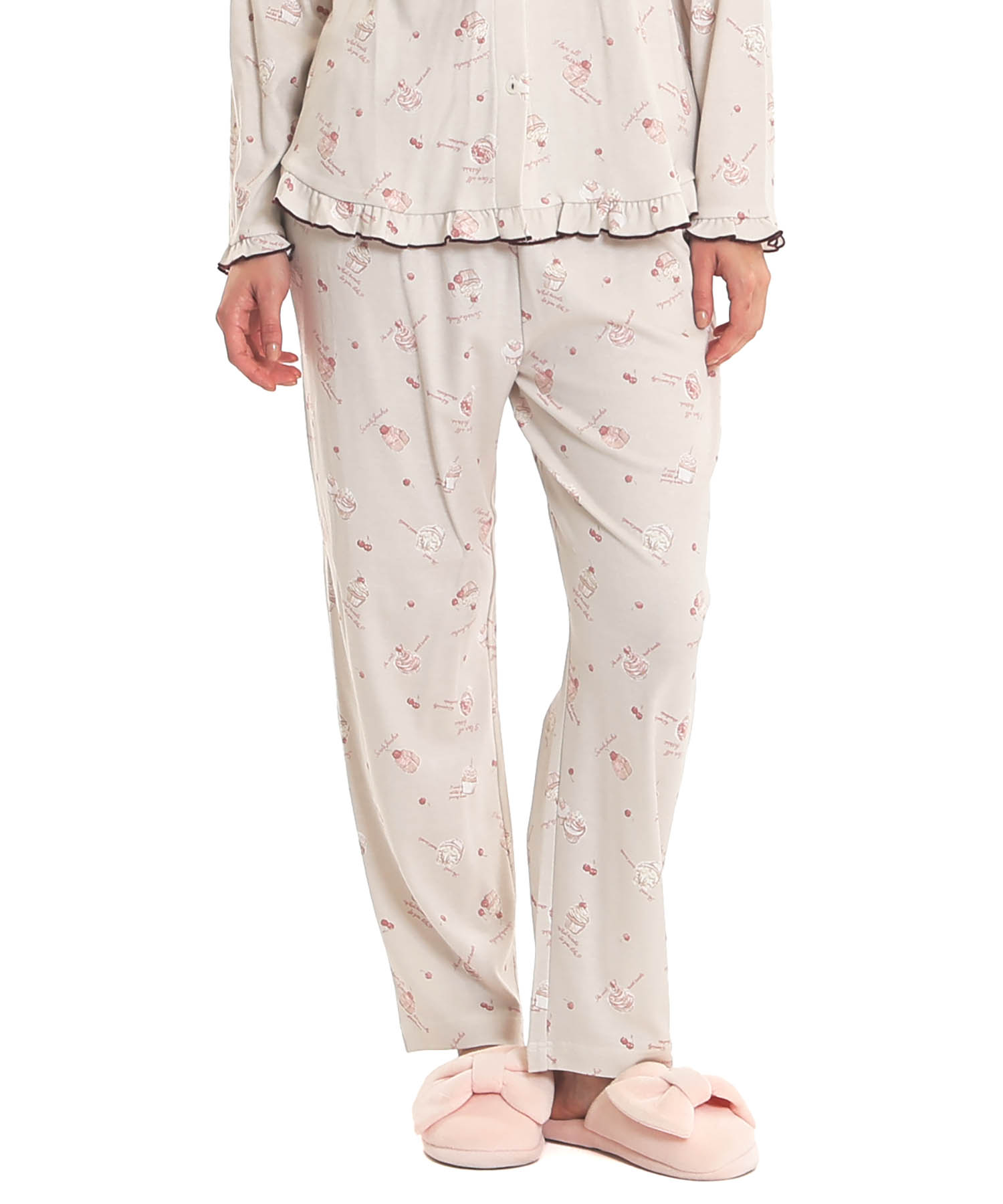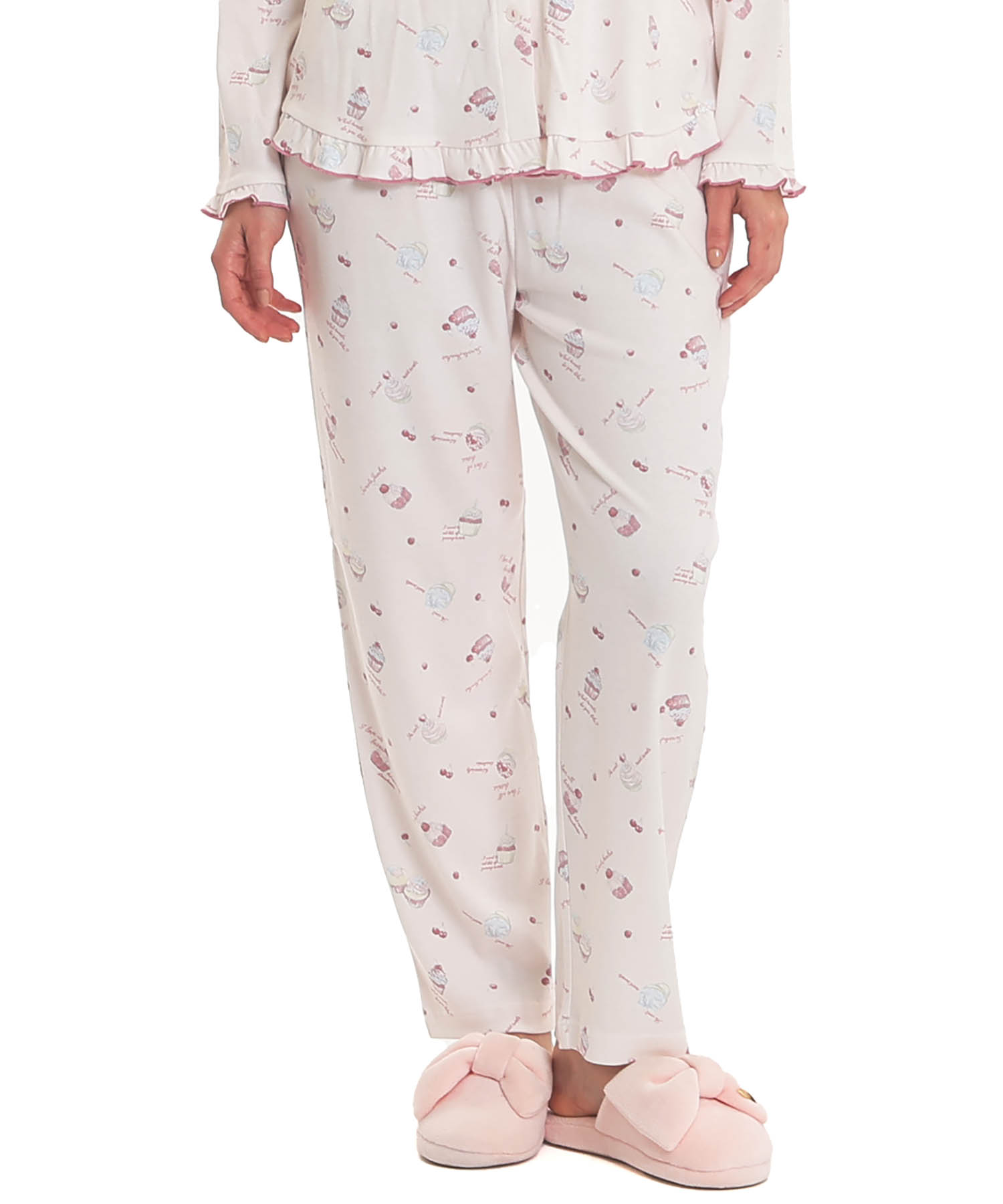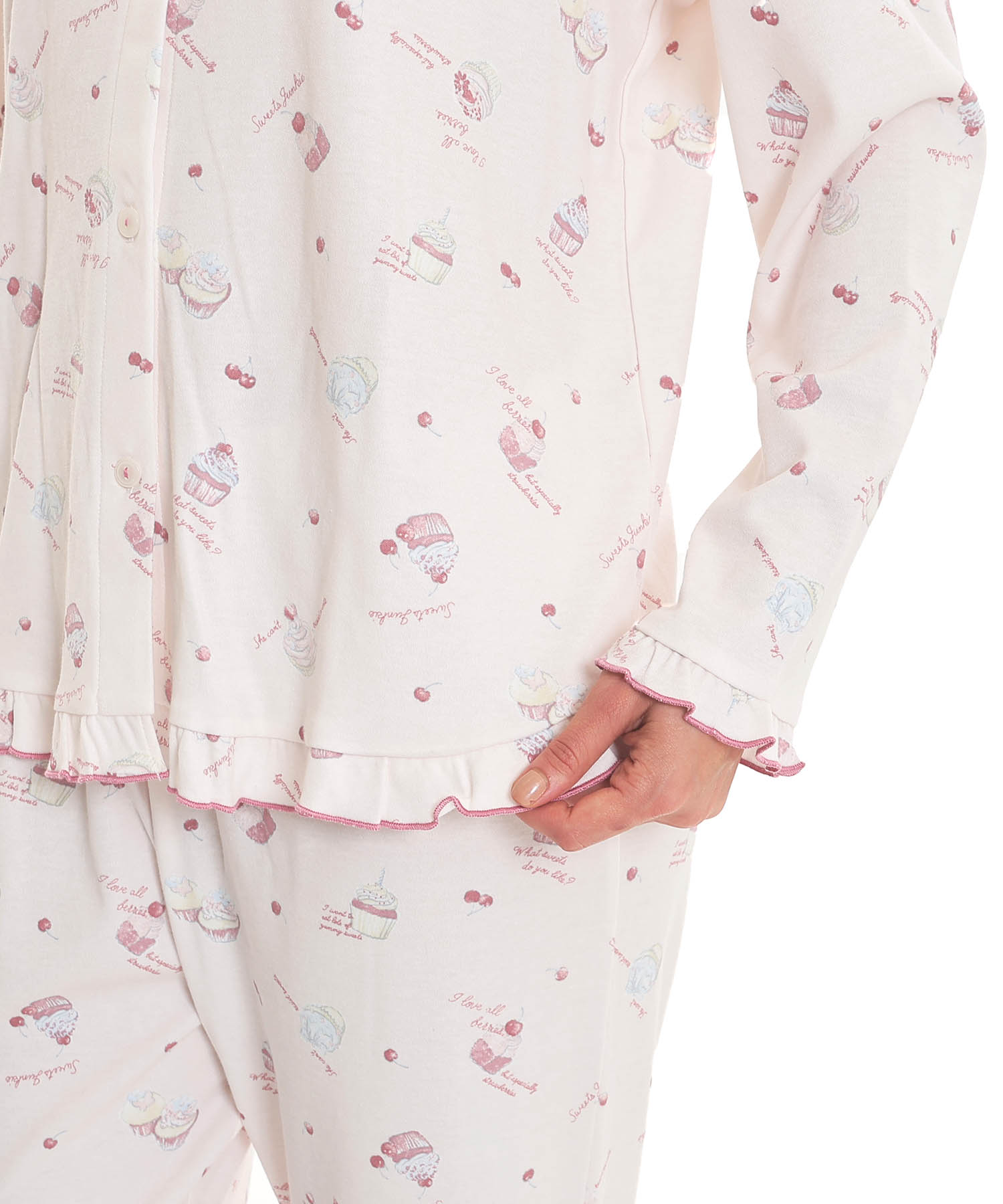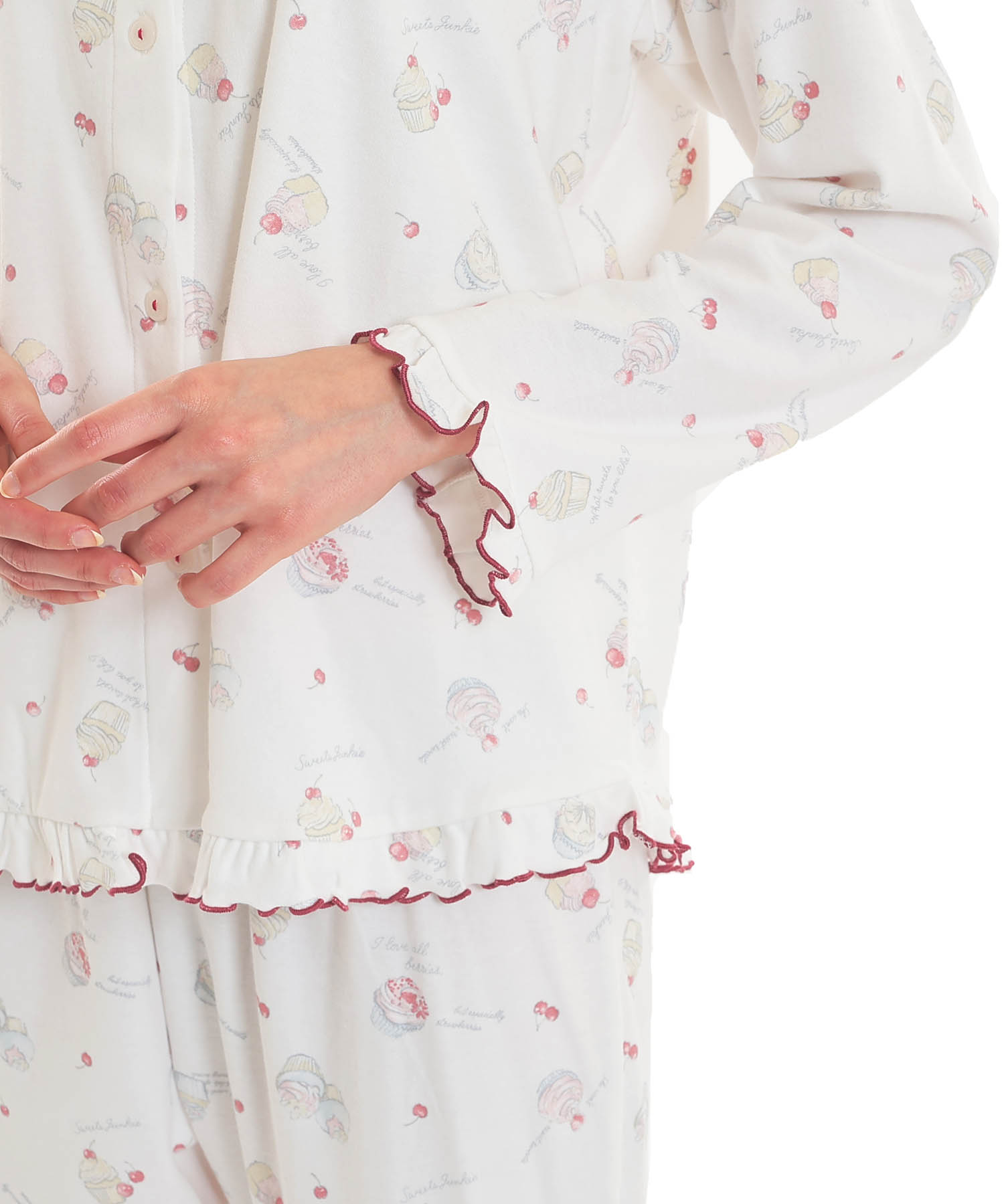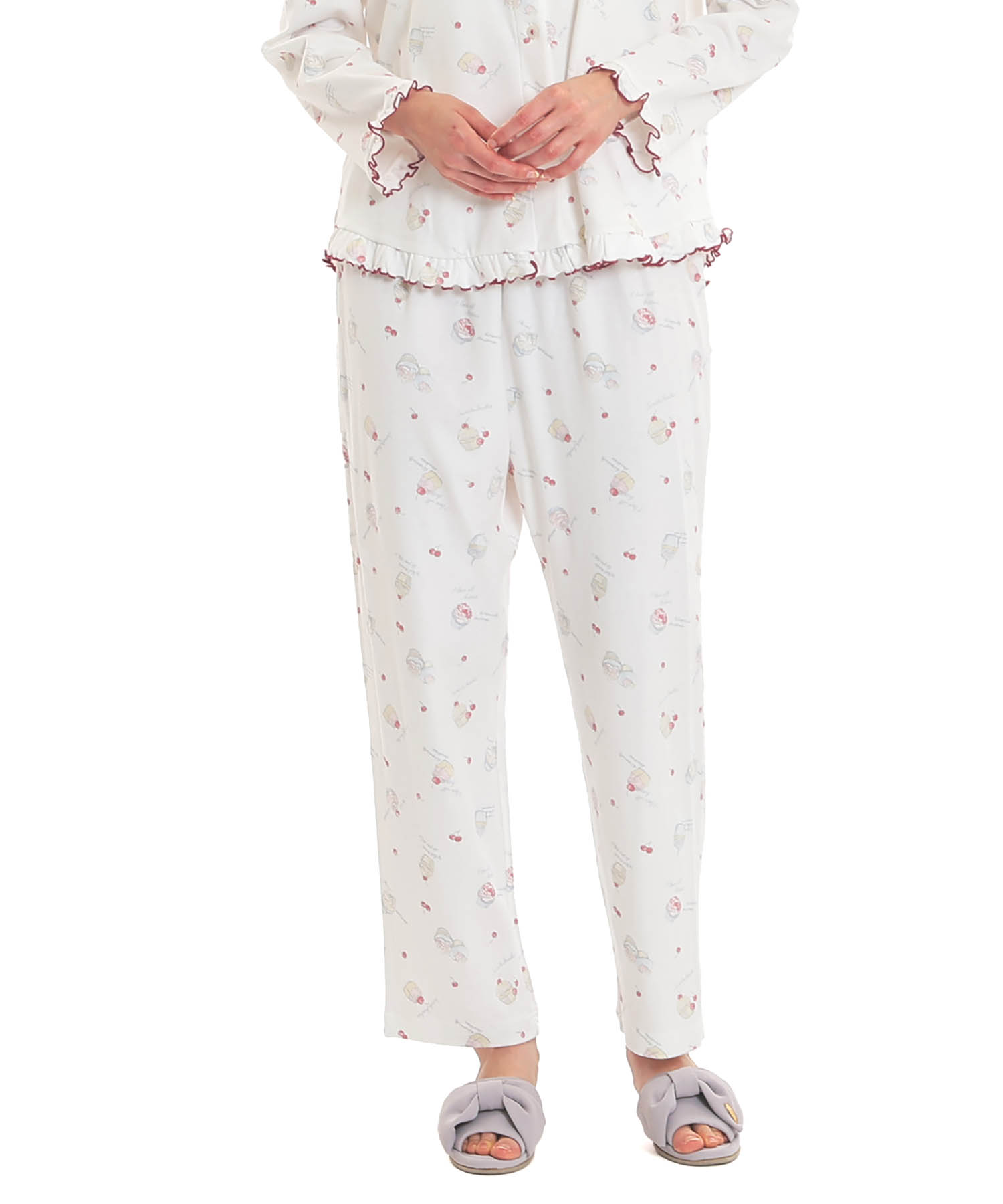 襟なしのクルーネックで首回りがすっきりとしている、前開きパジャマ。