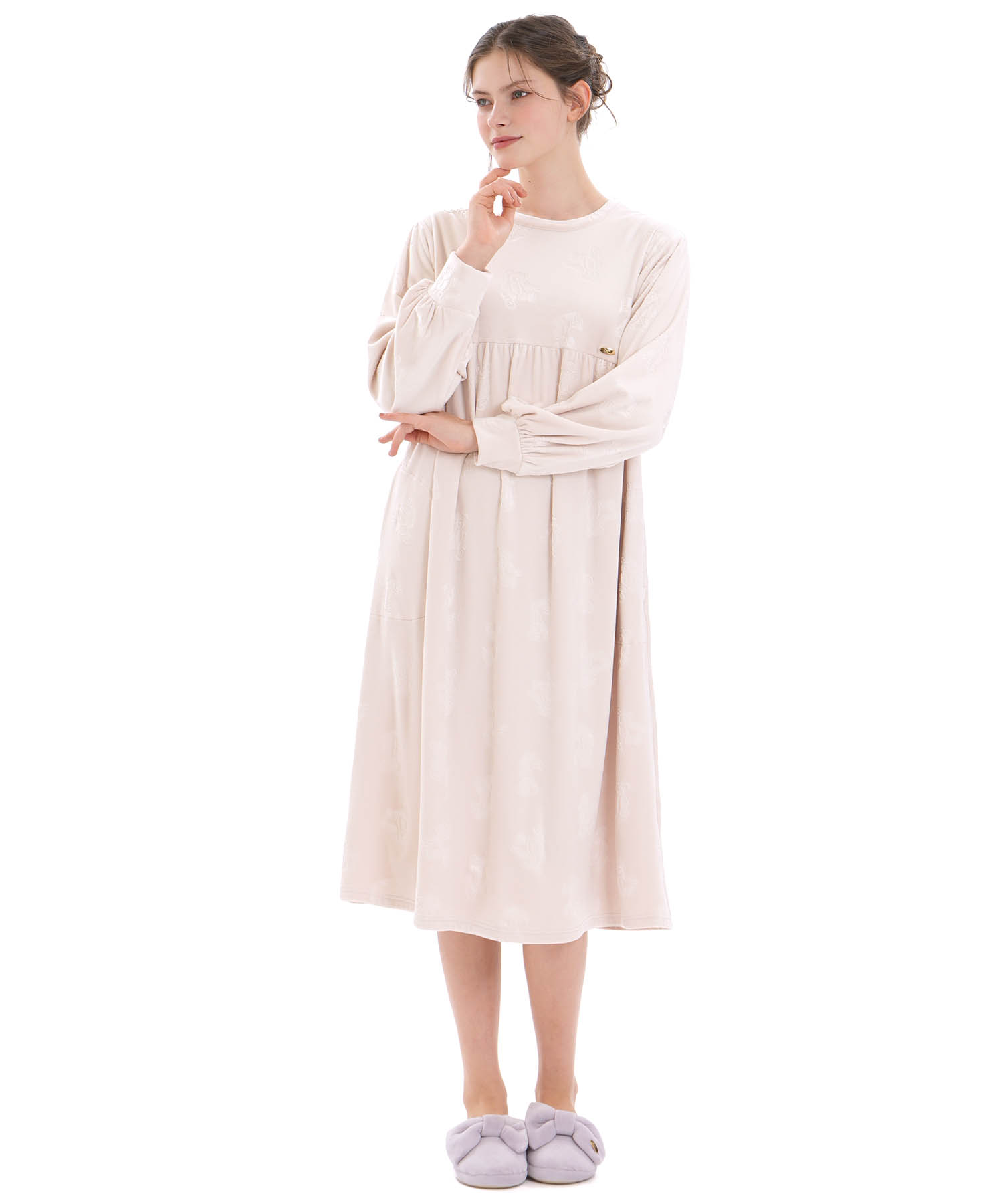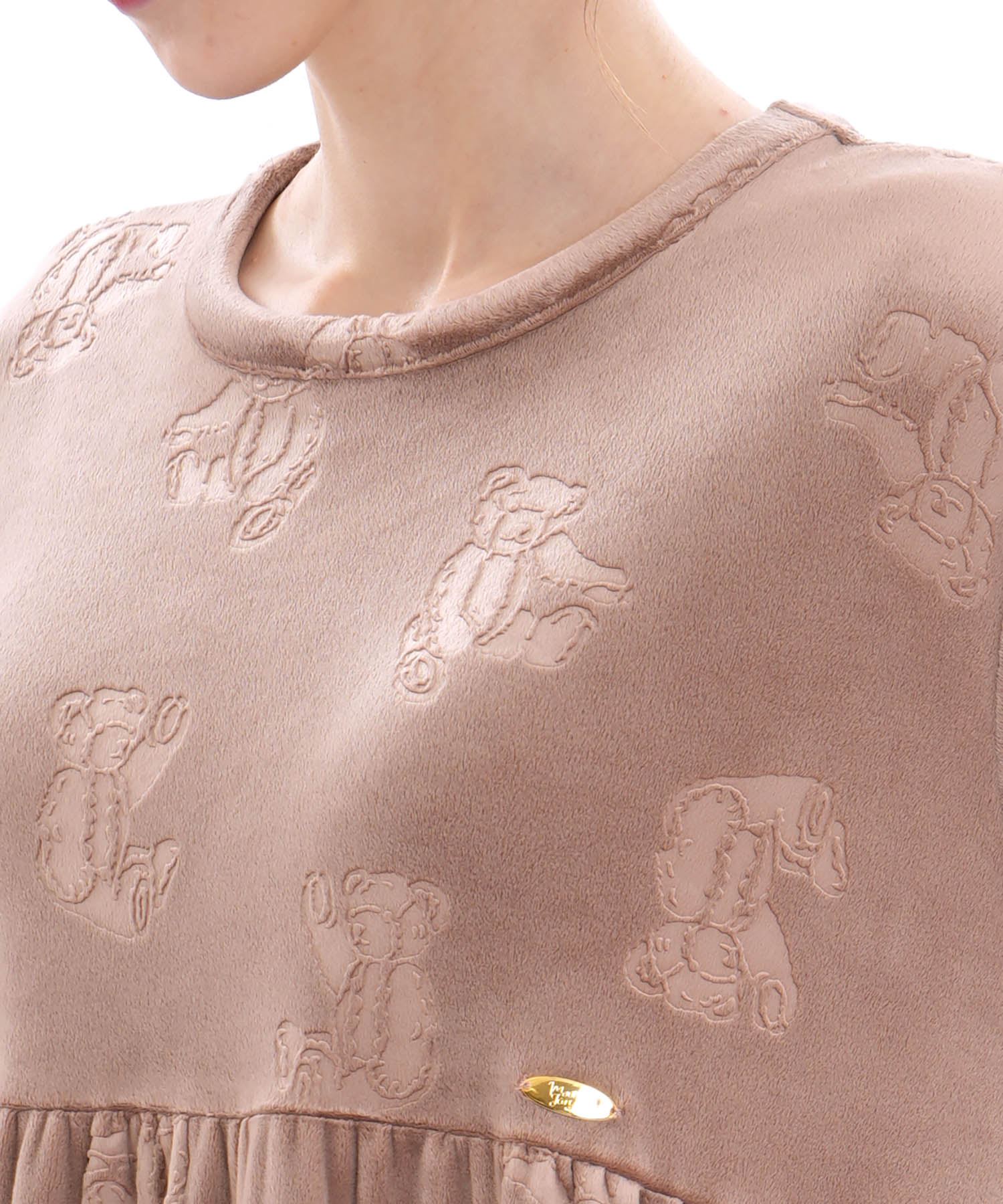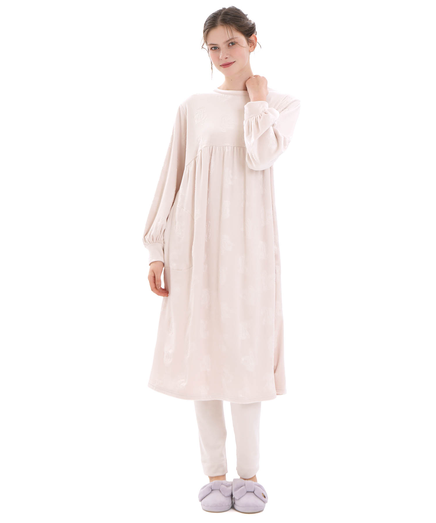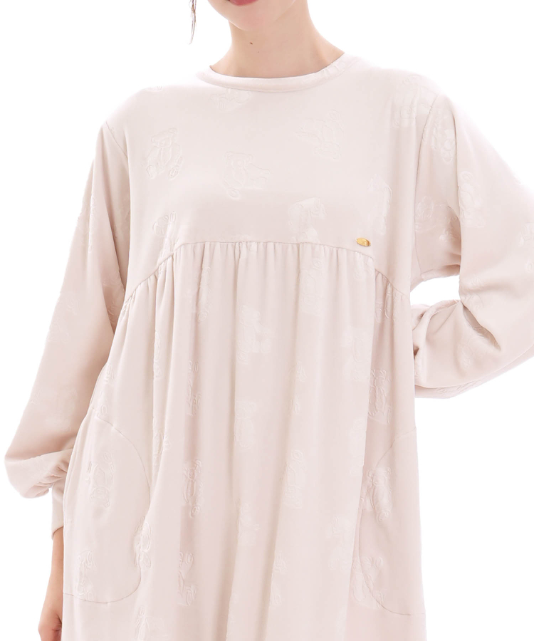 胸元の切り替えでギャザーをたっぷりと寄せ、カラダのラインを拾わないゆったりとしたシルエットに。