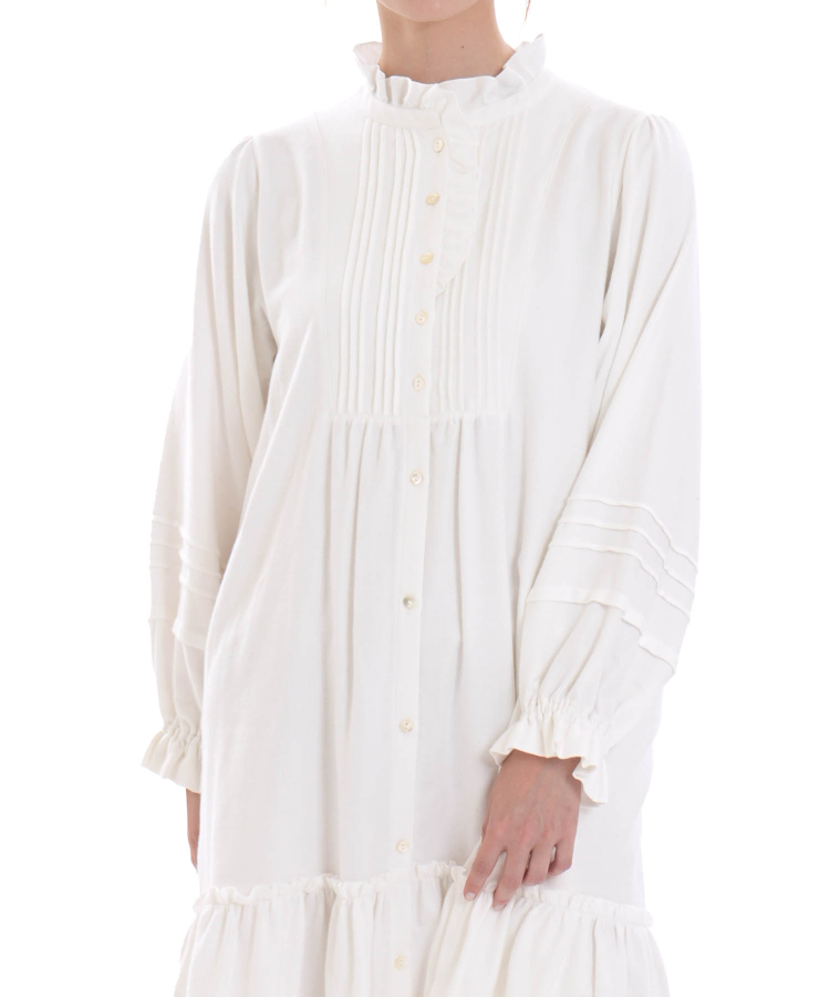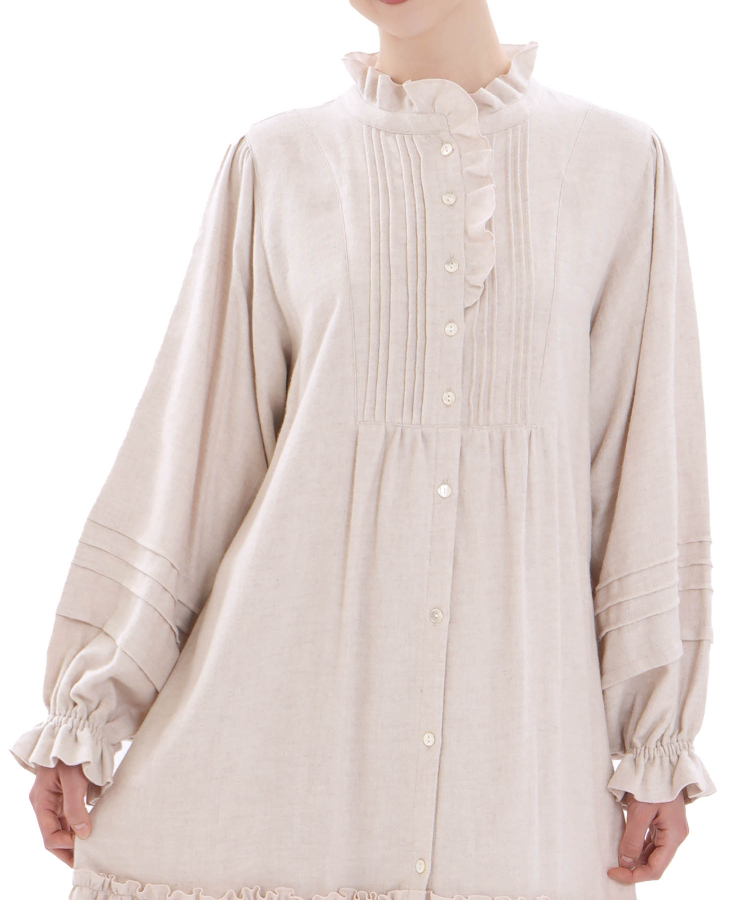 フロントに施された繊細なピンタックと貝ボタンが上品さを添え、襟元のフリルが顔まわりをやさしく彩ります。