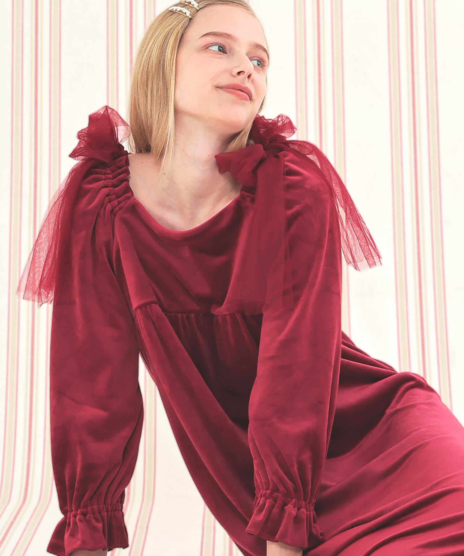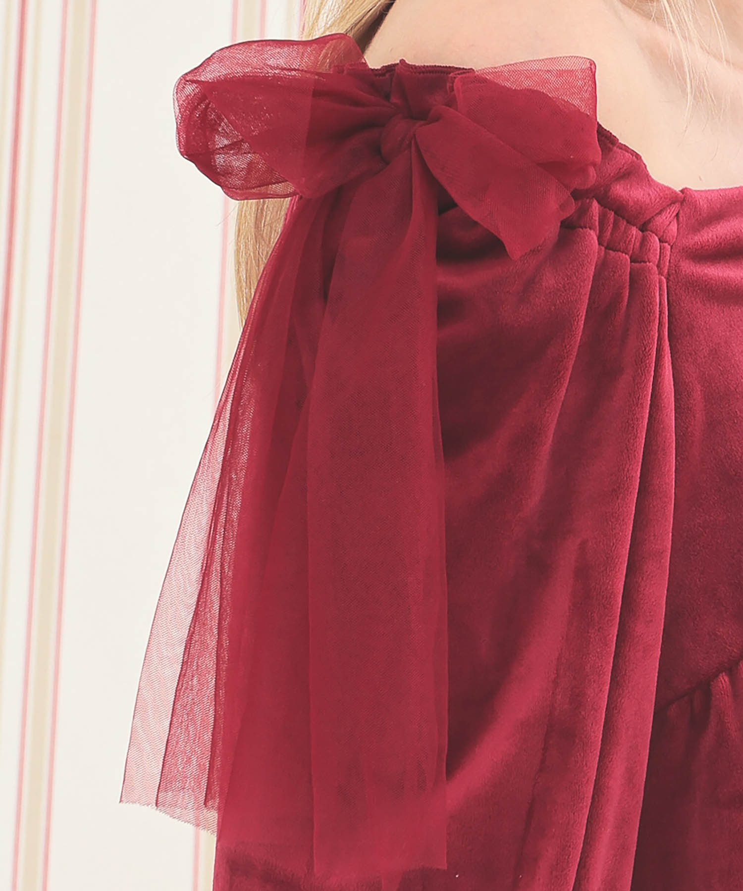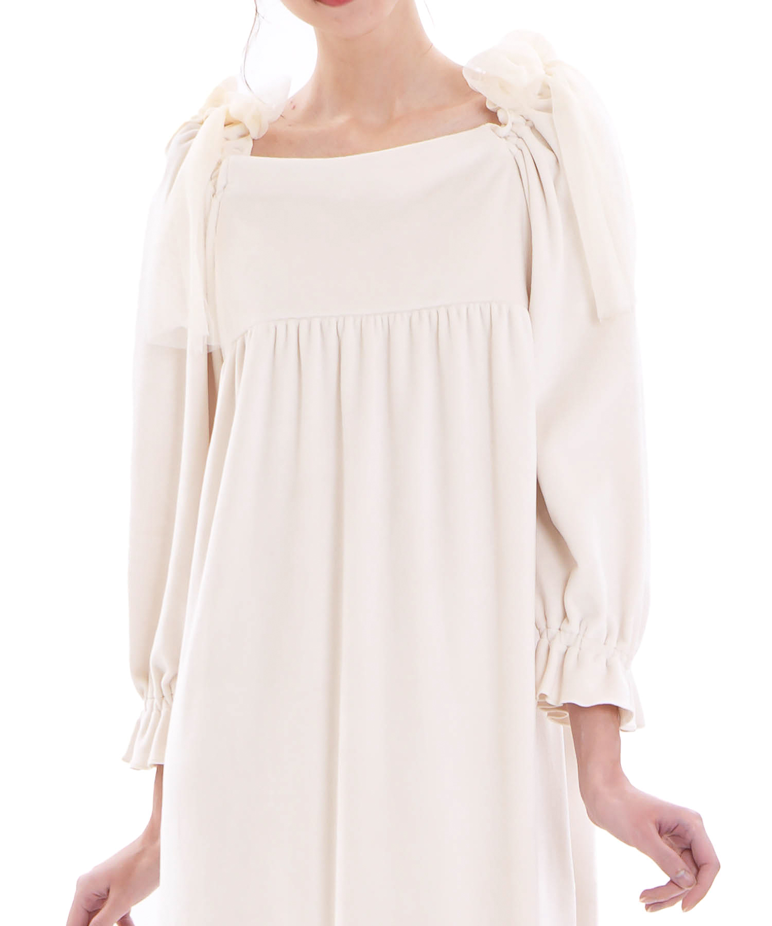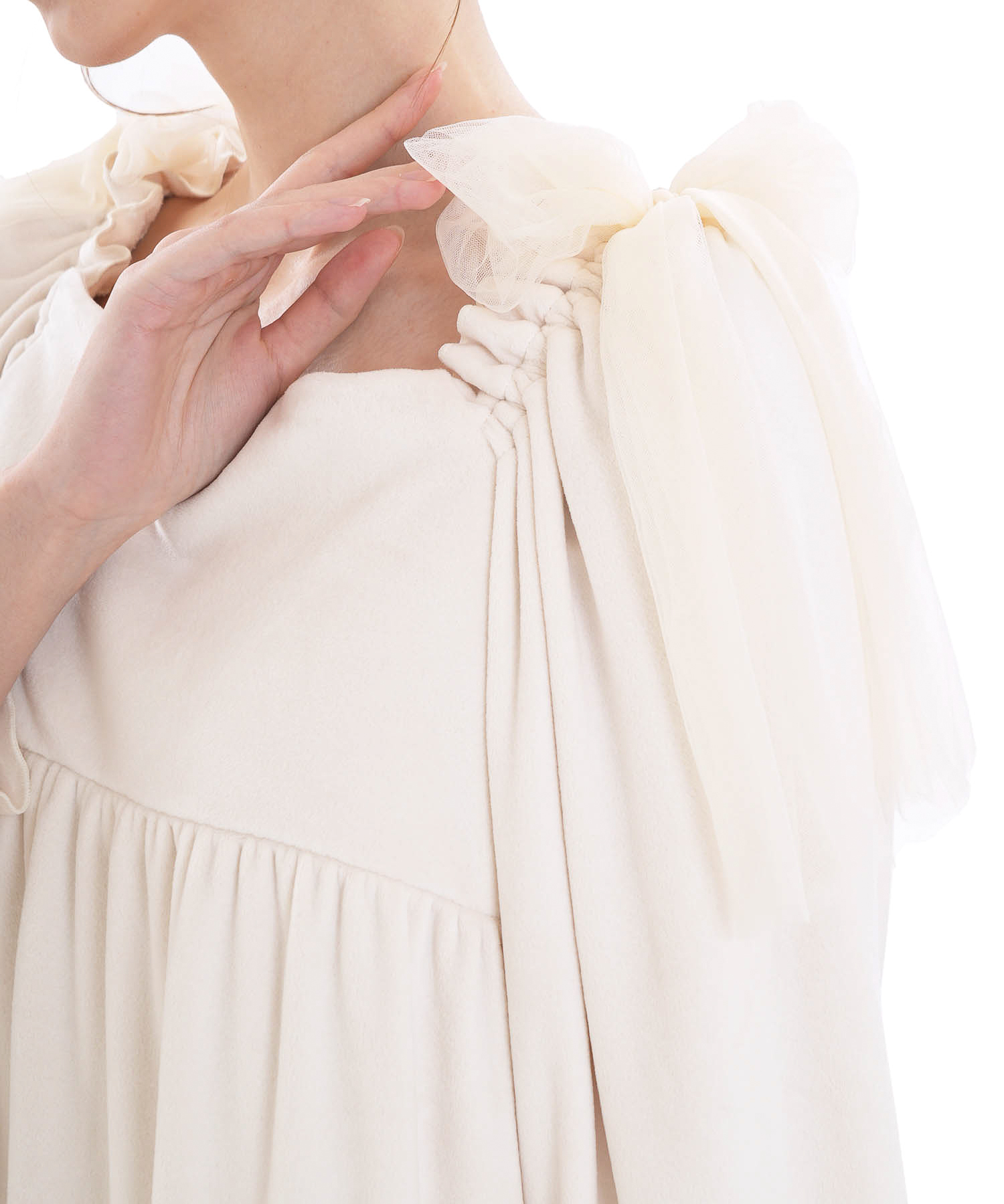 肩の大きなチュールリボンは顔まわりを明るくしてくれ、華やかな印象に。