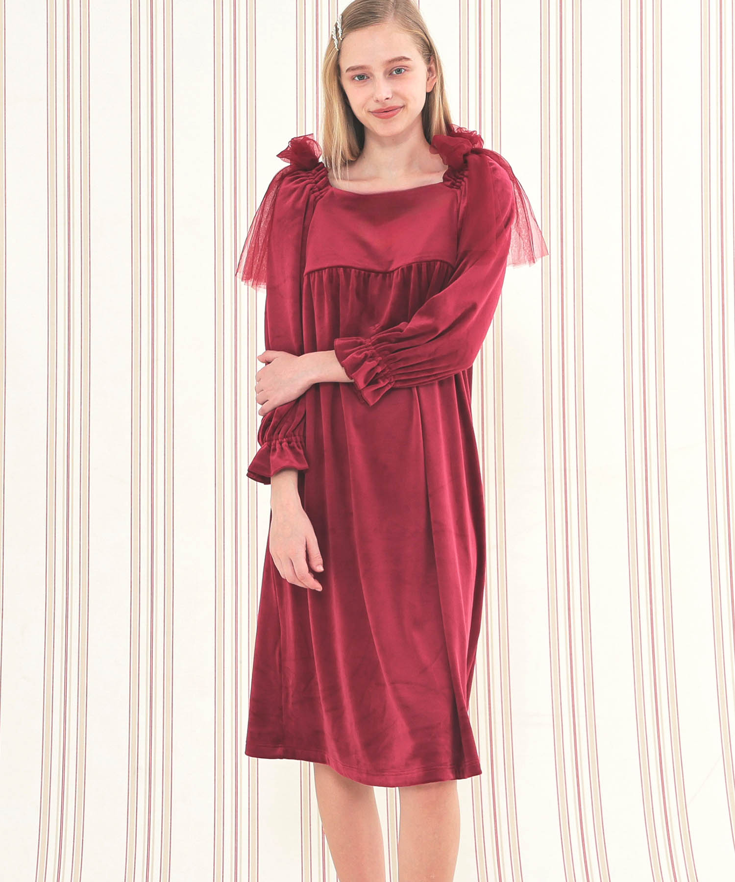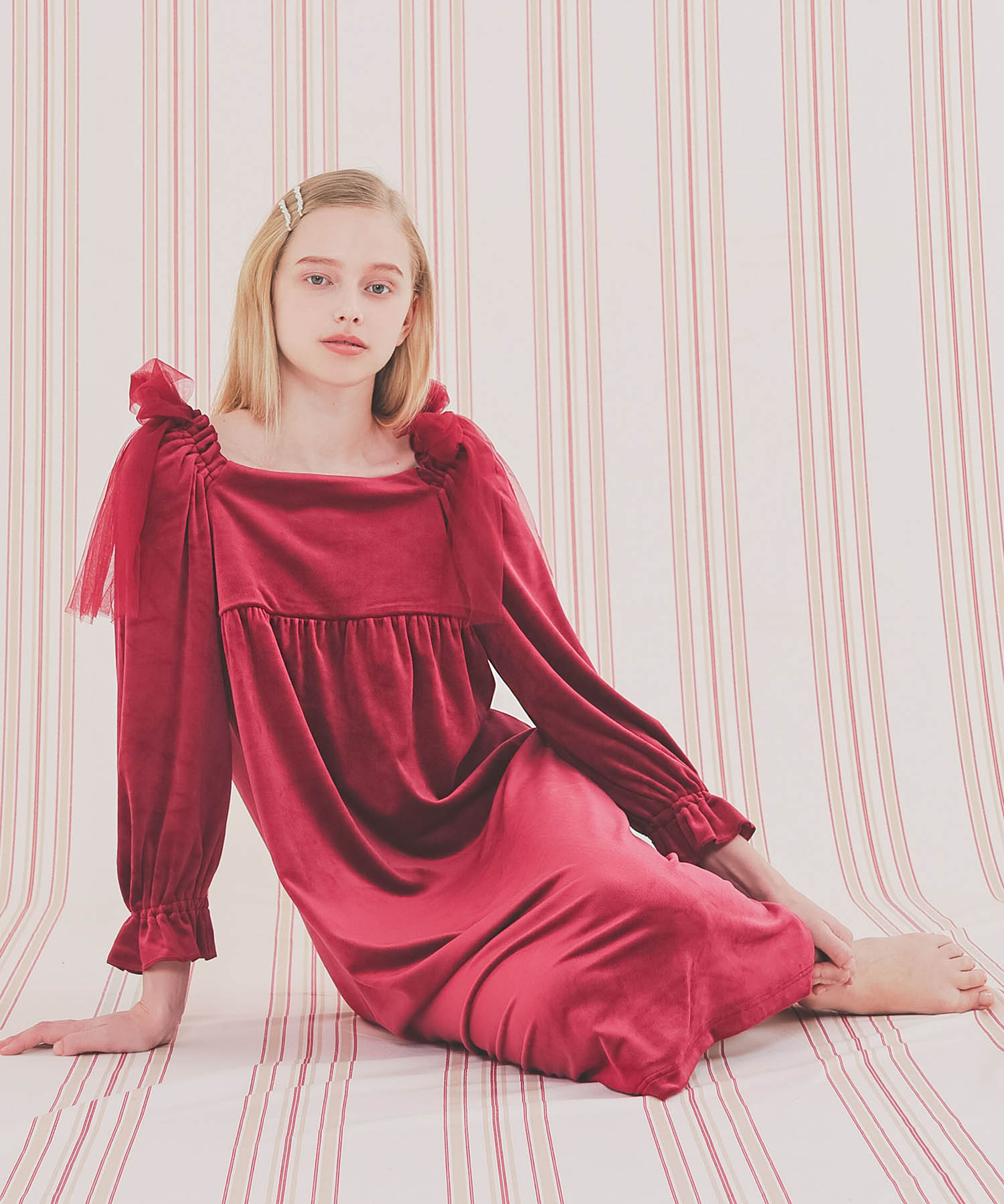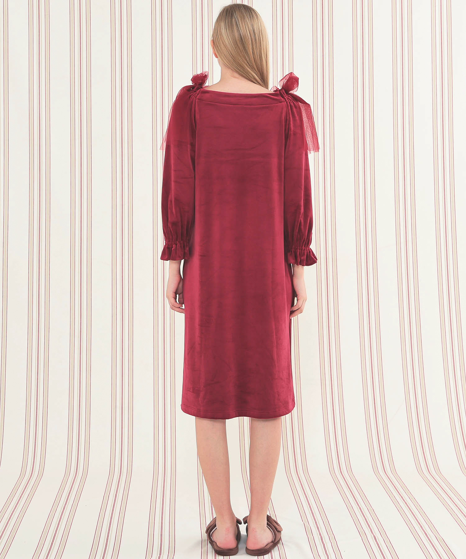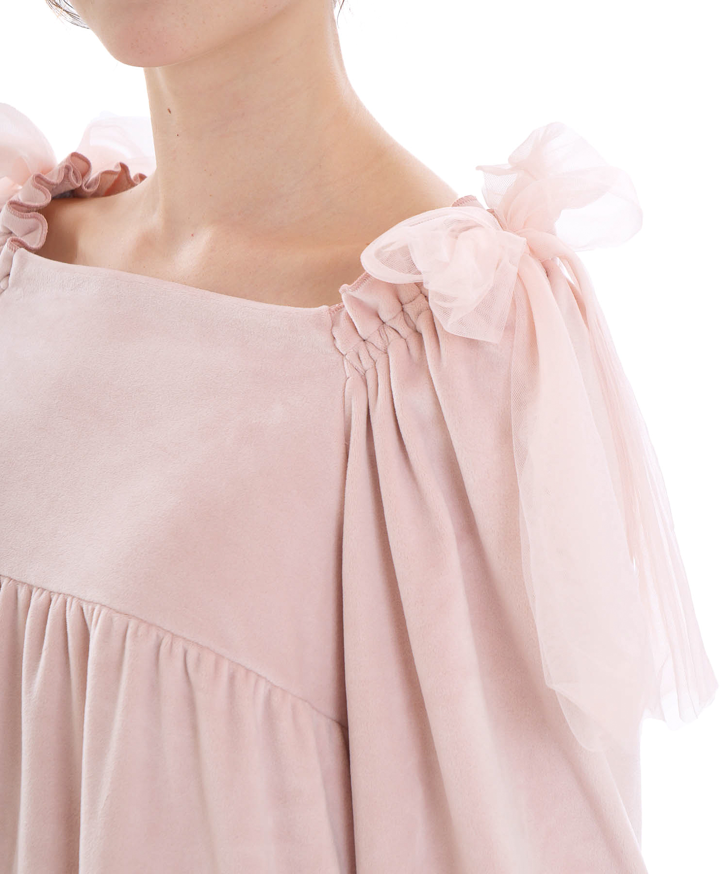 肩の大きなチュールリボンは顔まわりを明るくしてくれ、華やかな印象に。