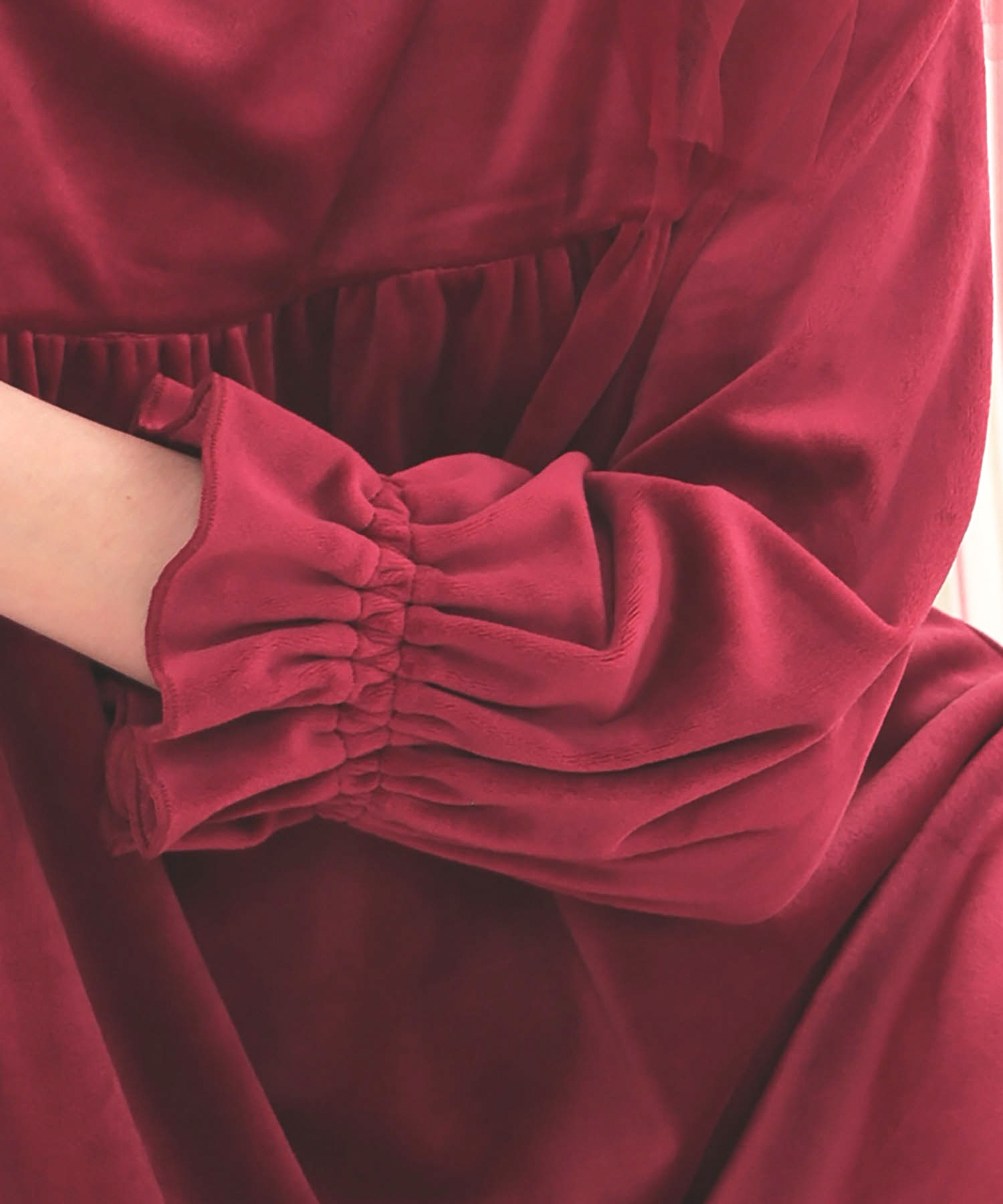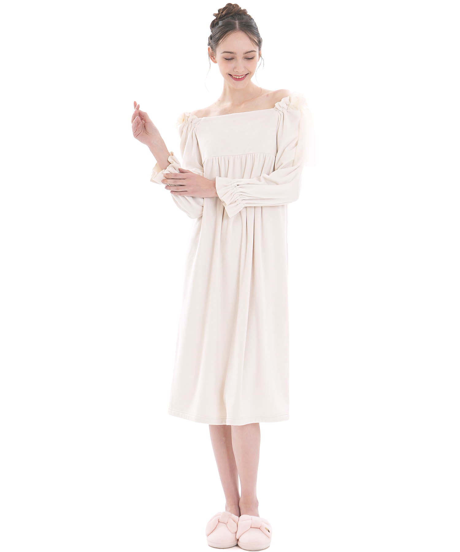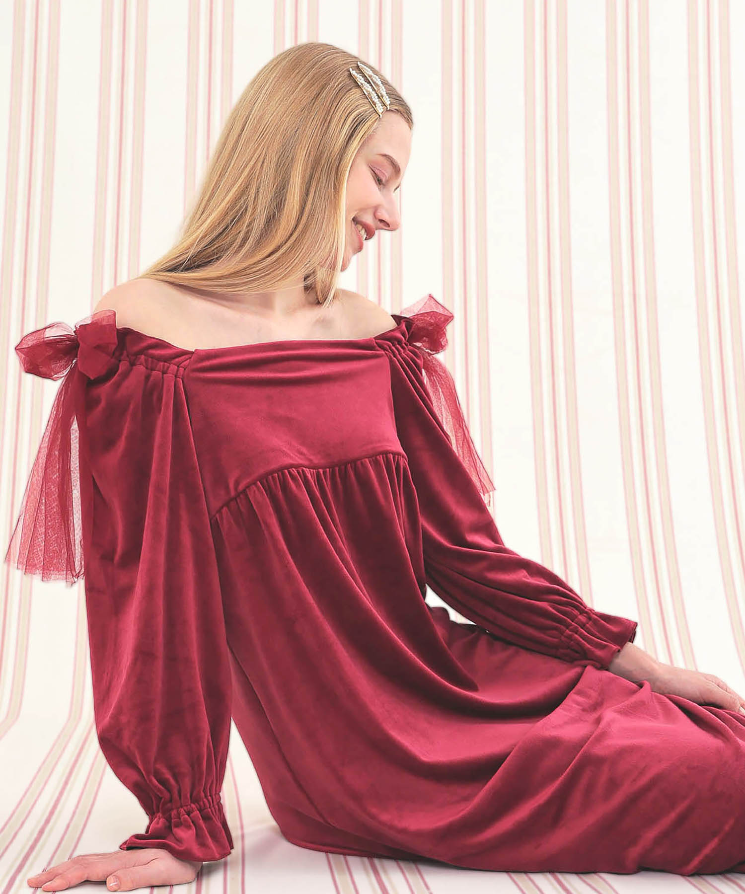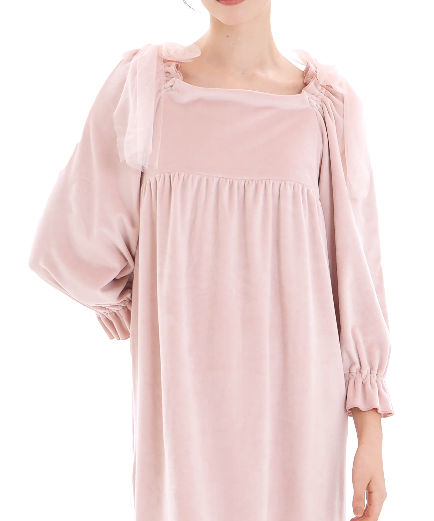 肩の大きなチュールリボンは顔まわりを明るくしてくれ、華やかな印象に。