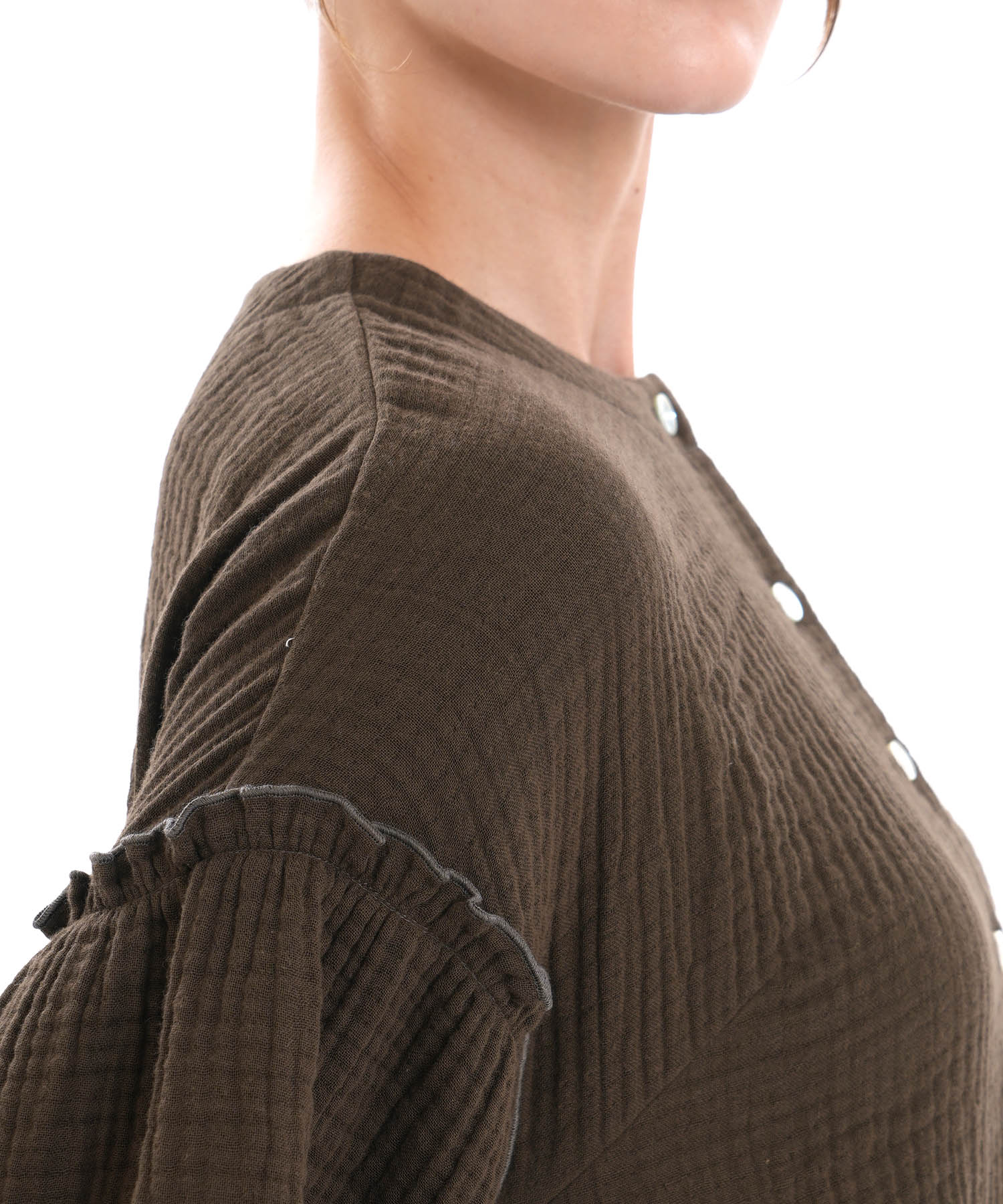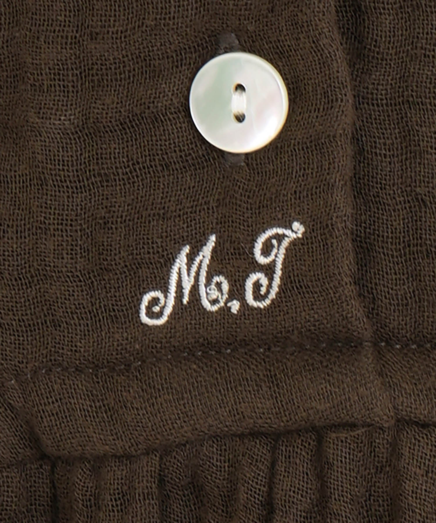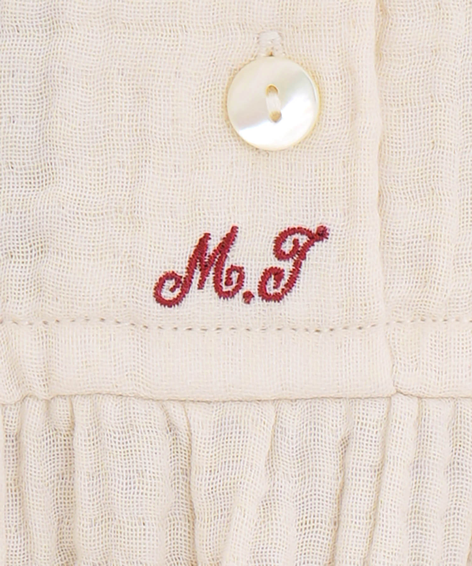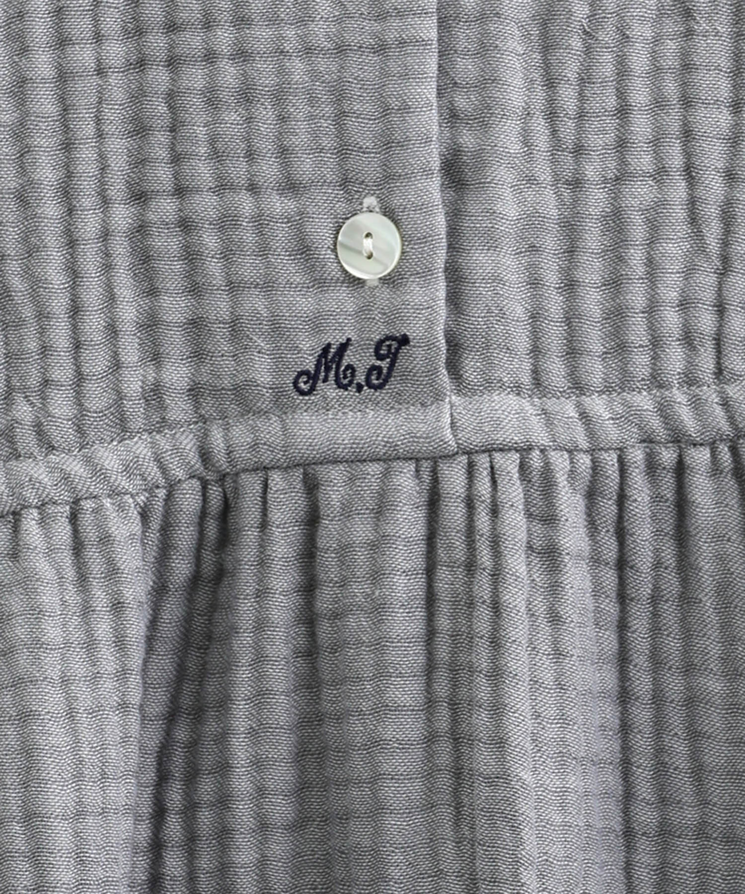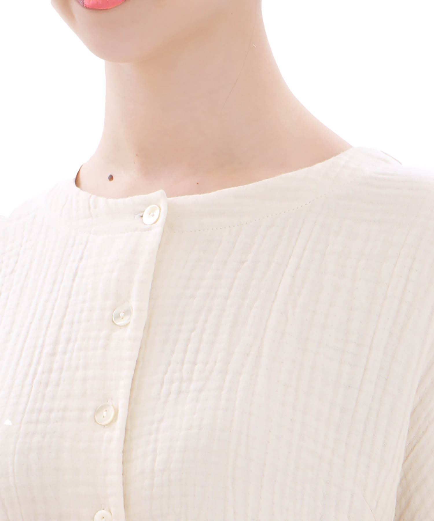 前開きのデザインに並ぶ貝ボタンが、控えめながらも愛らしい印象に。