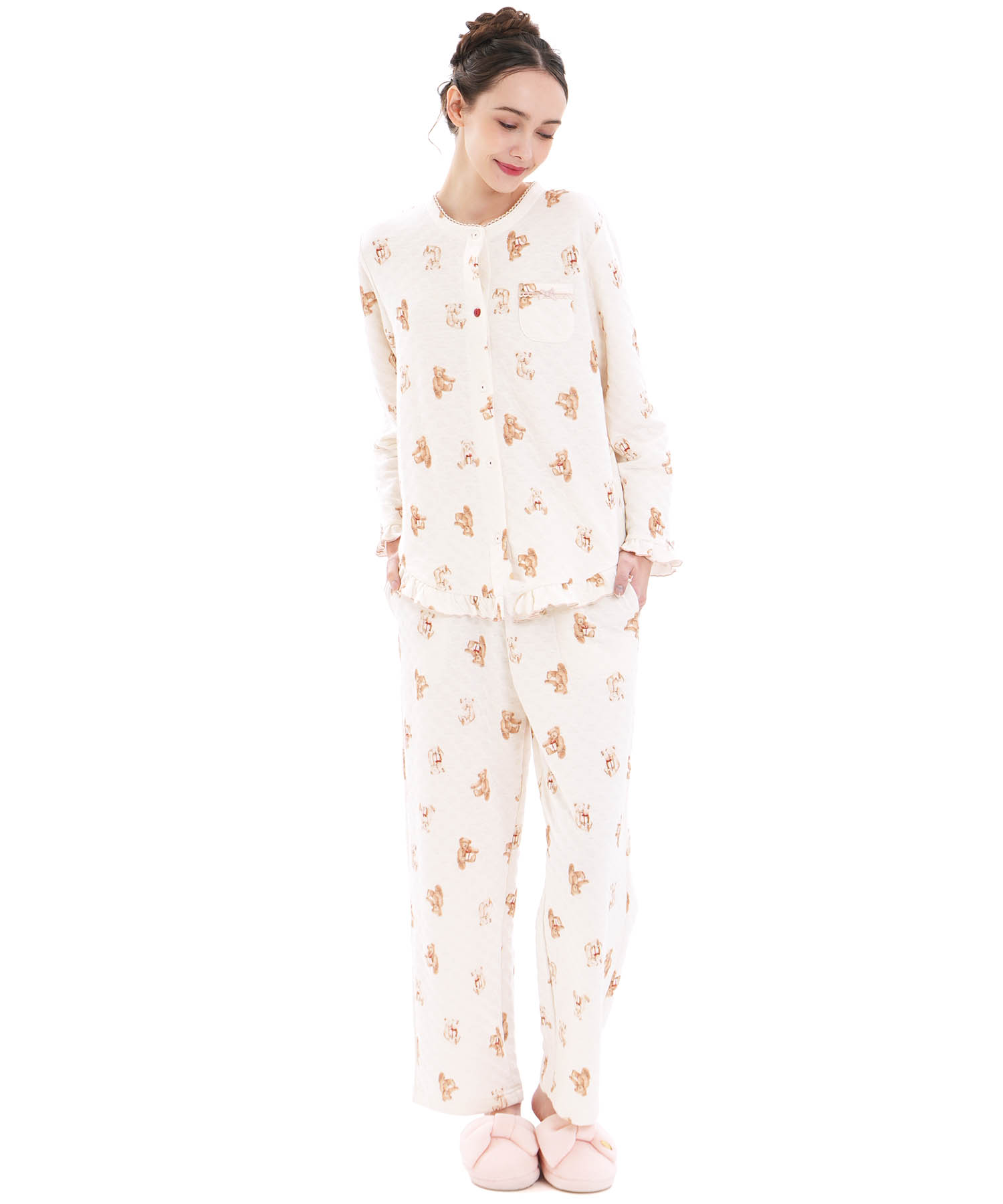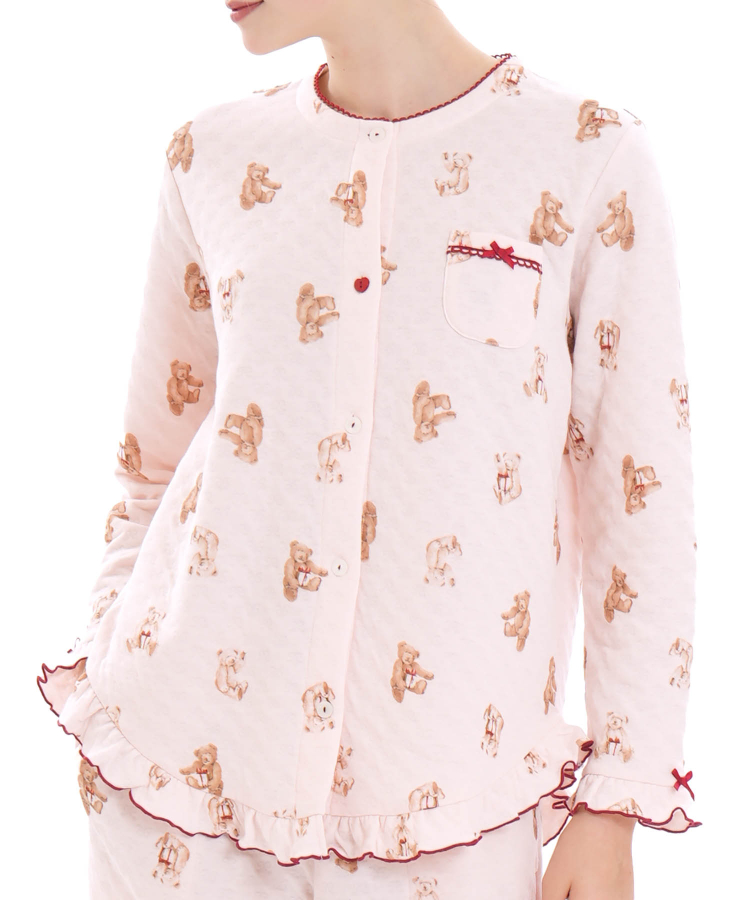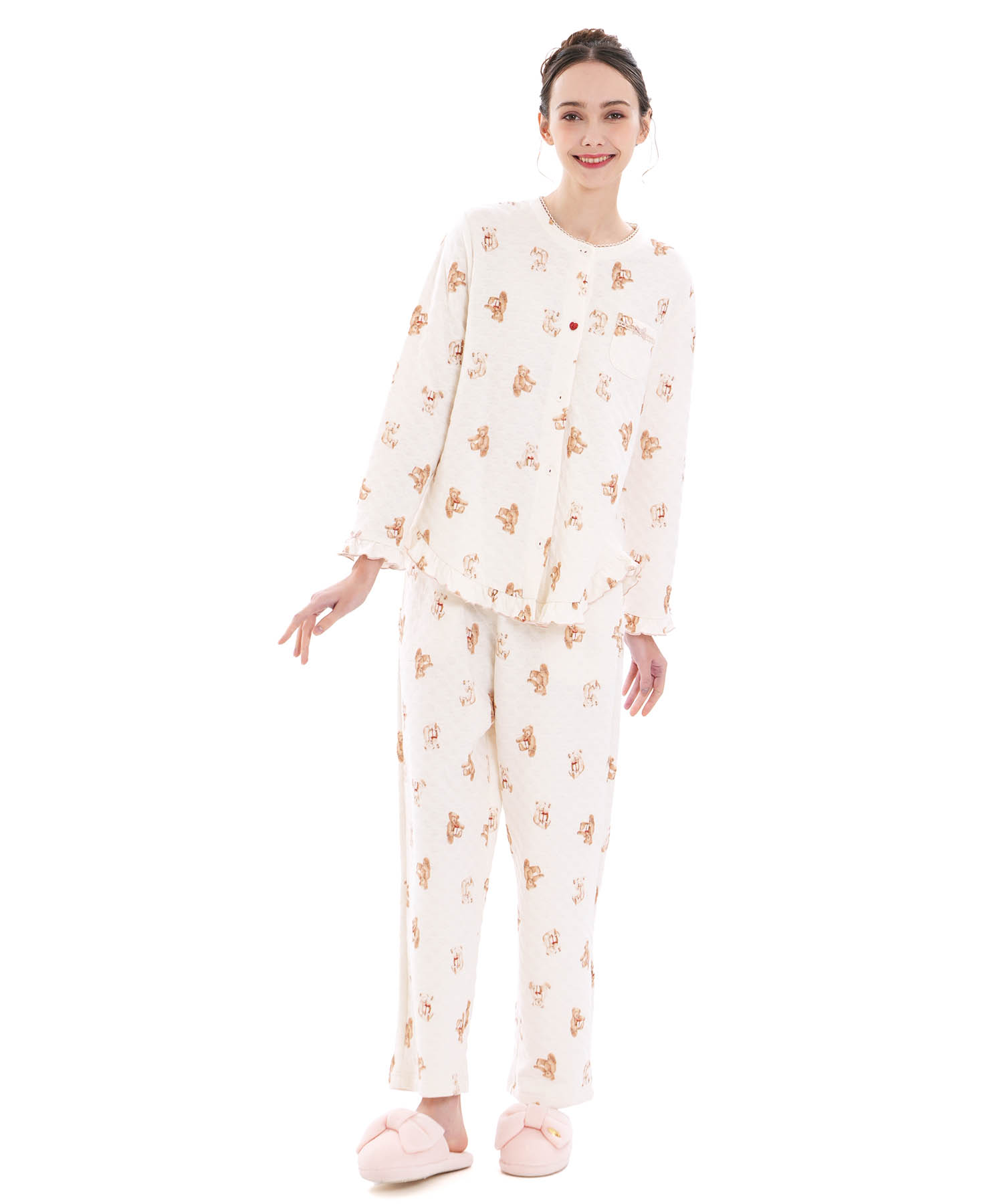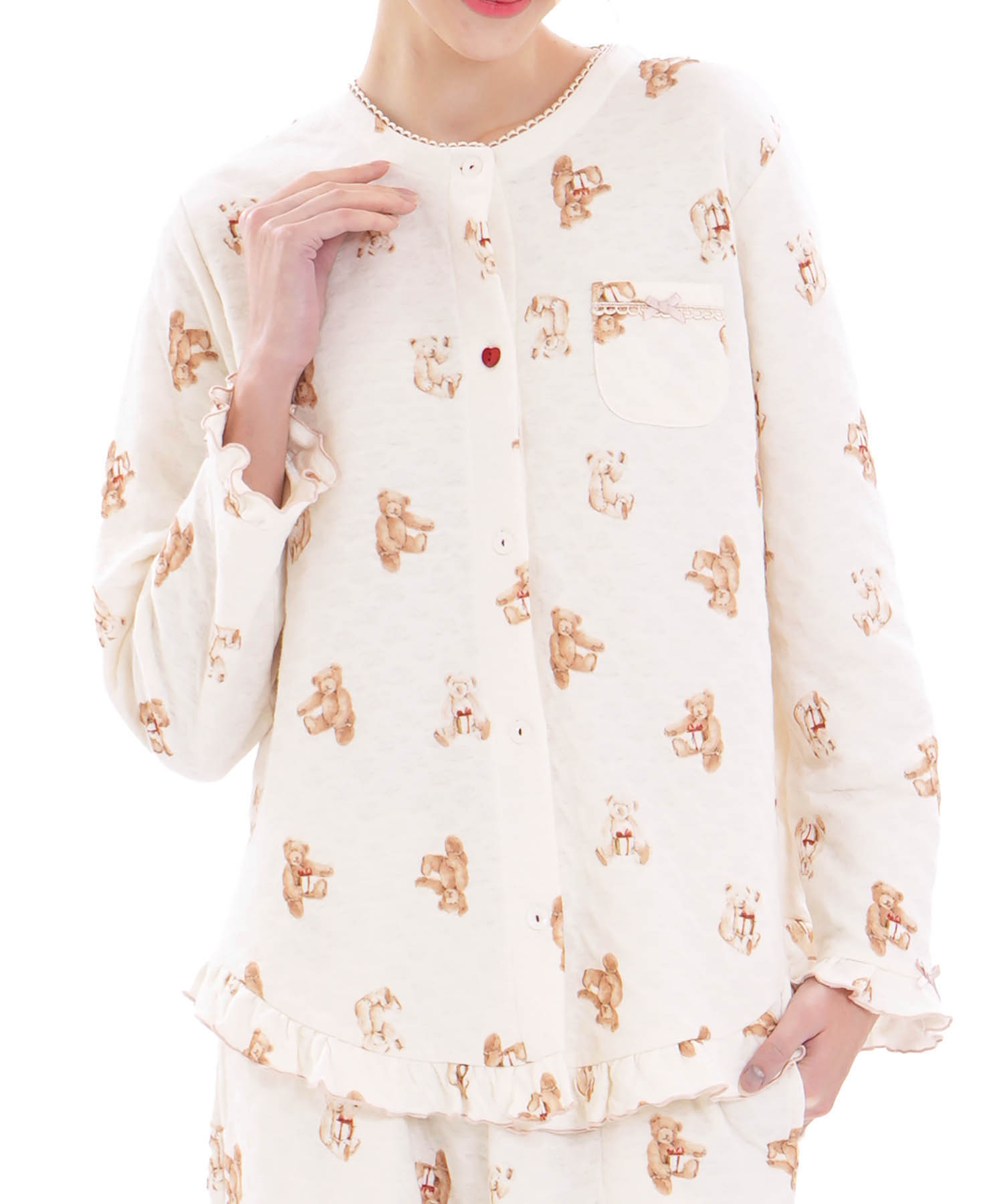裾と袖口にほどよいフリルが付いた前開きのパジャマ。