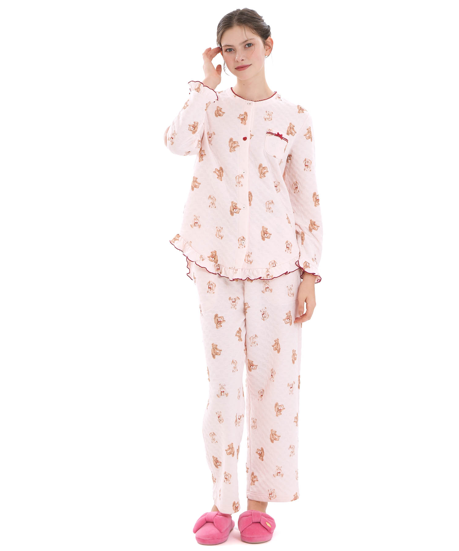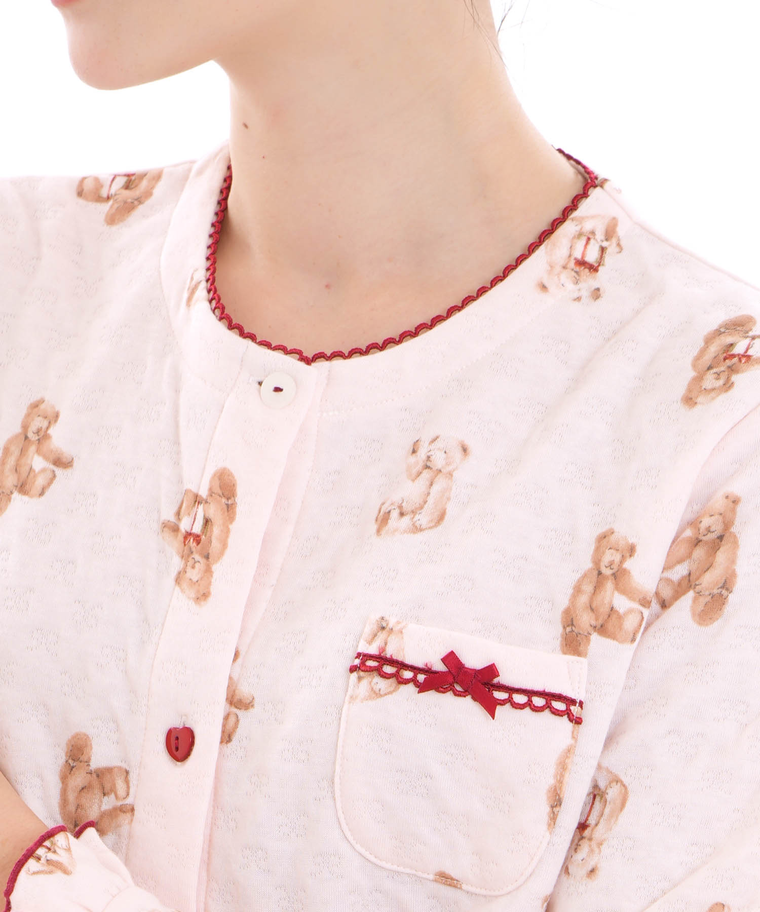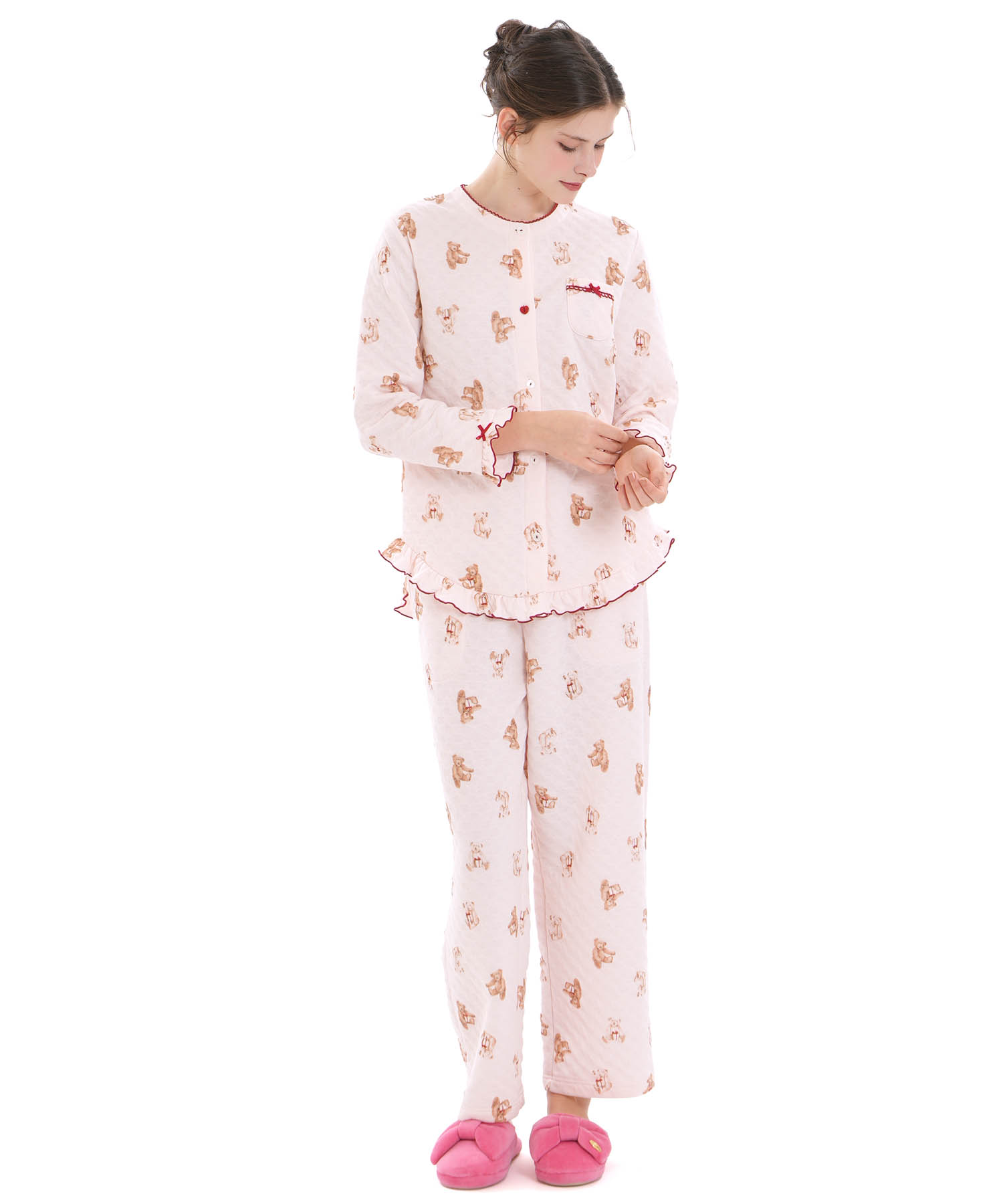 裾と袖口にほどよいフリルが付いた前開きのパジャマ。