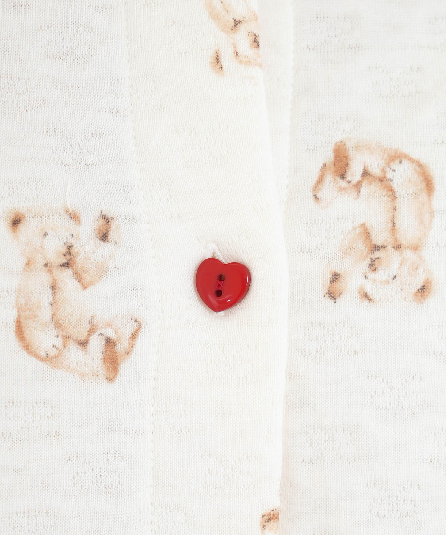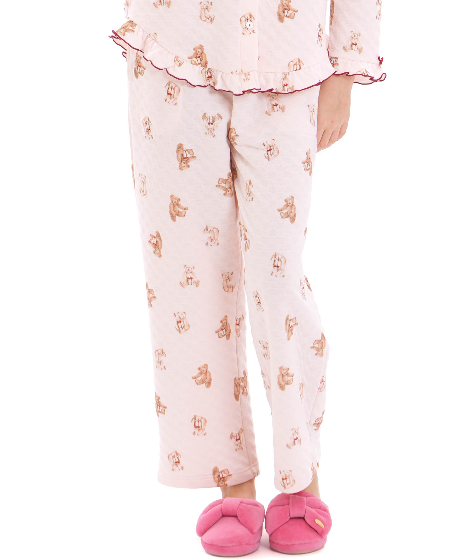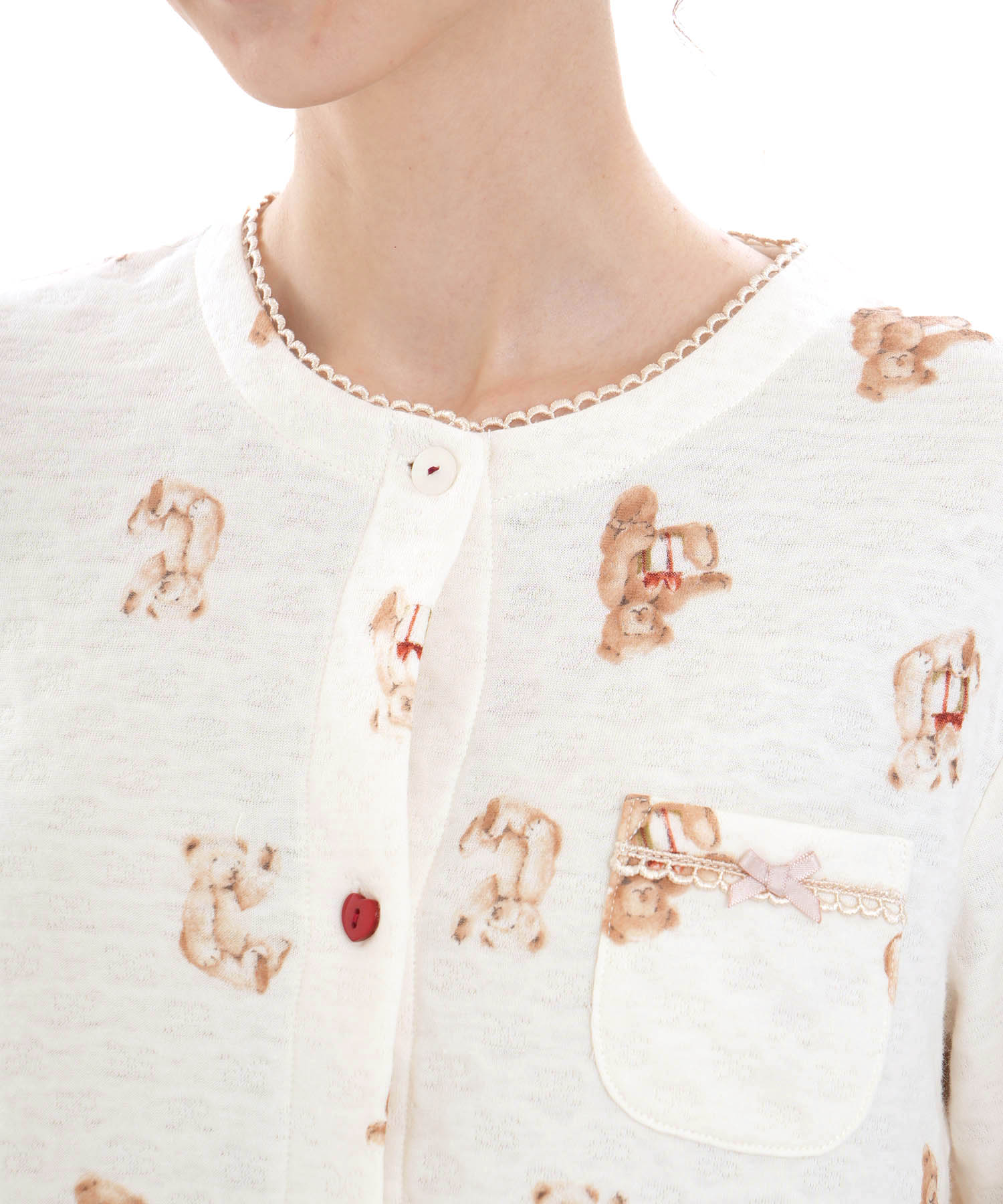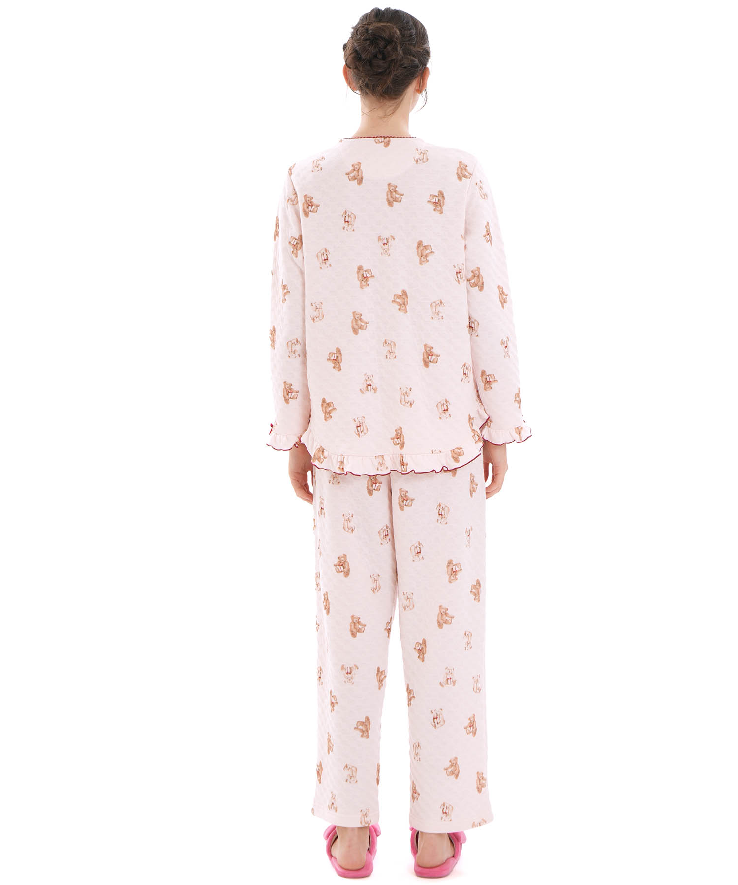 裾と袖口にほどよいフリルが付いた前開きのパジャマ。