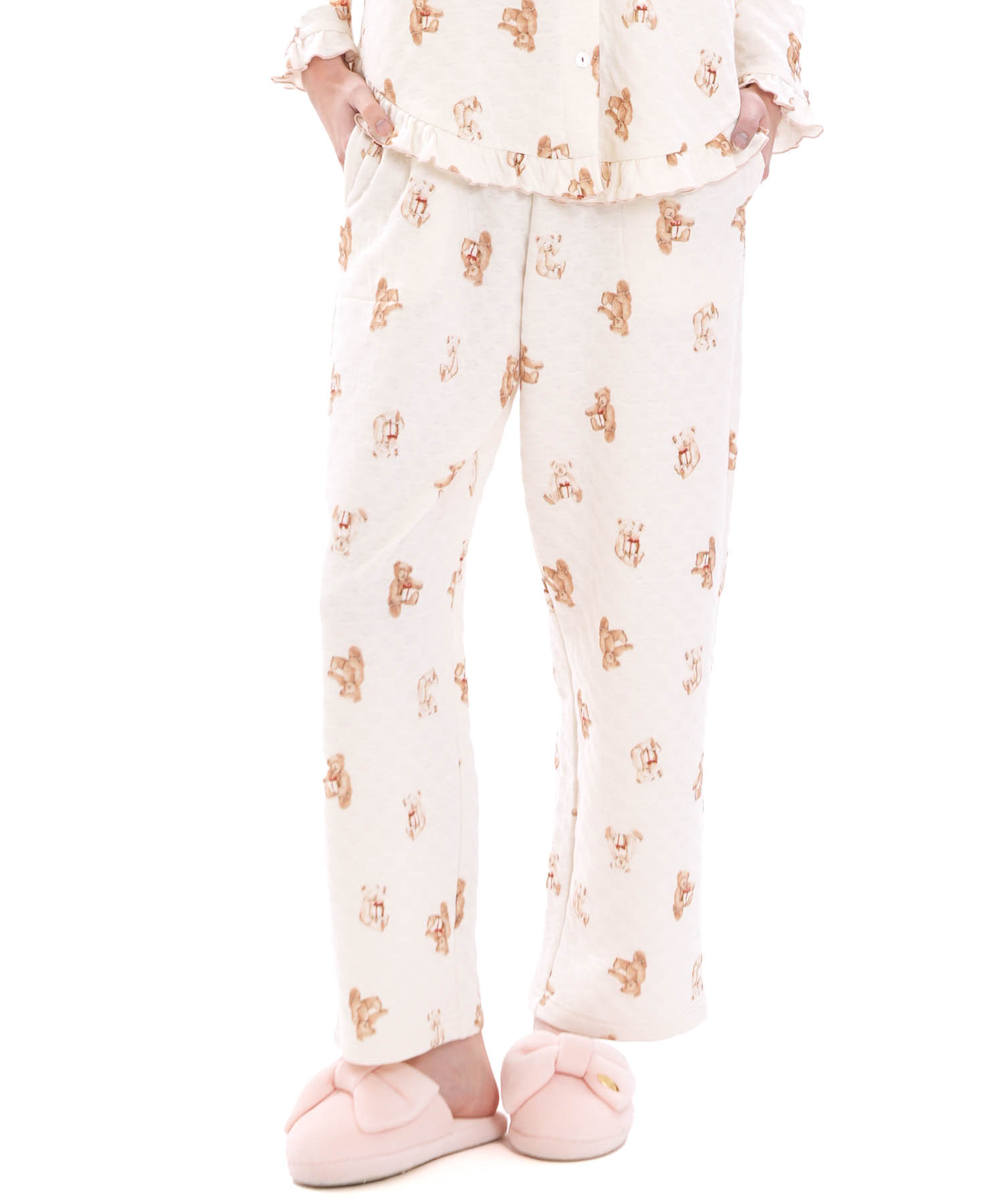 ふんわりと優しいタッチで描かれたテディーベアがプレゼントを抱いた、ノスタルジックな愛らしさが漂う柄。