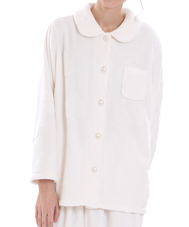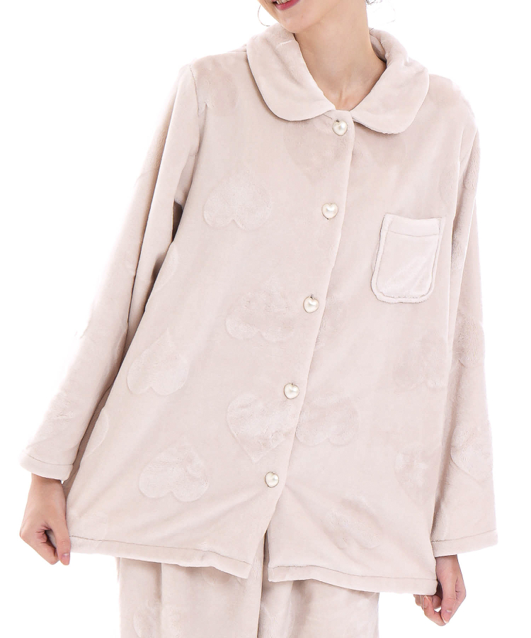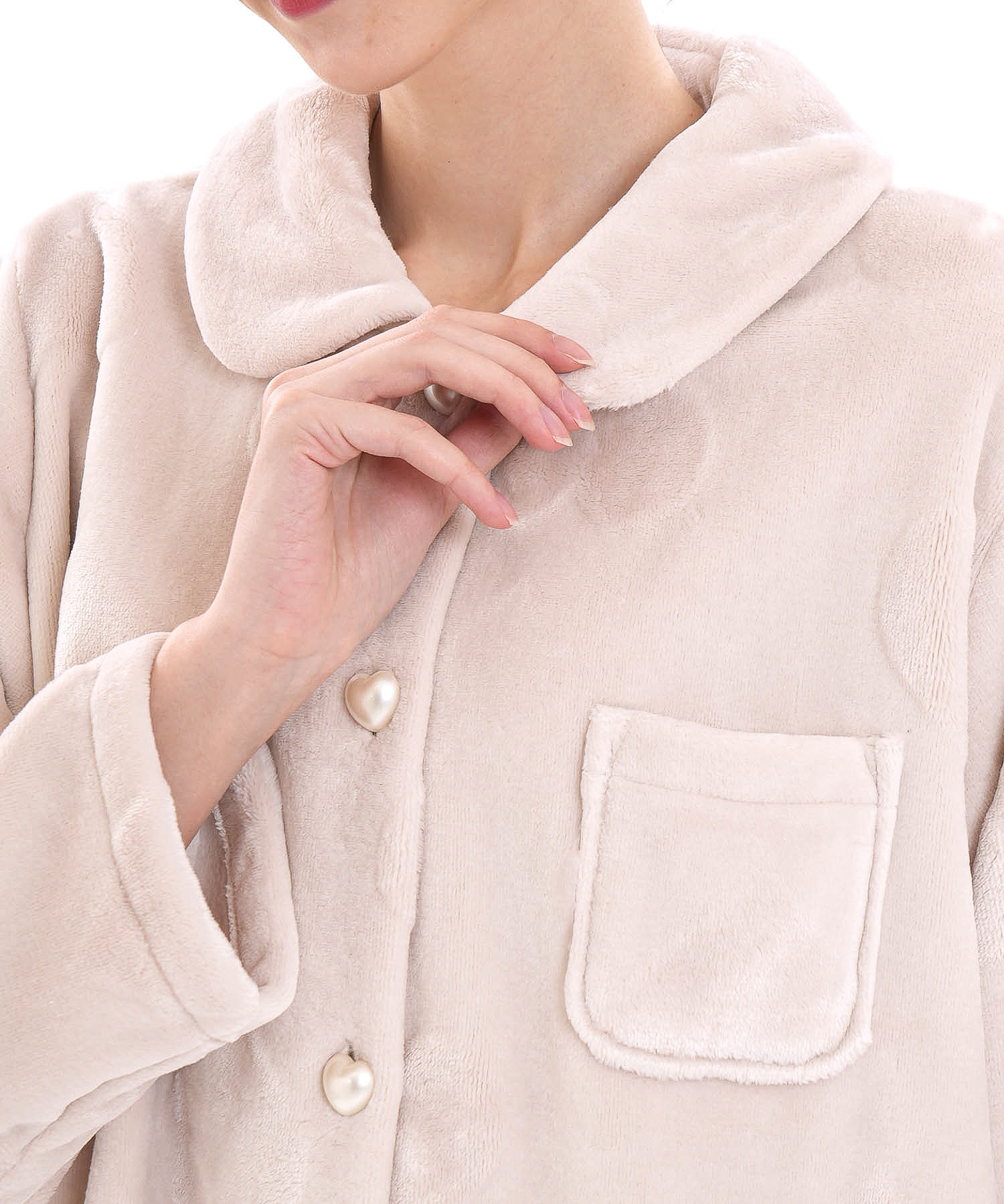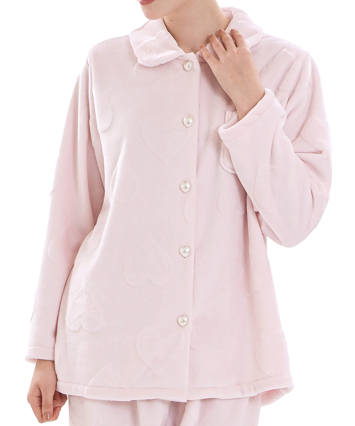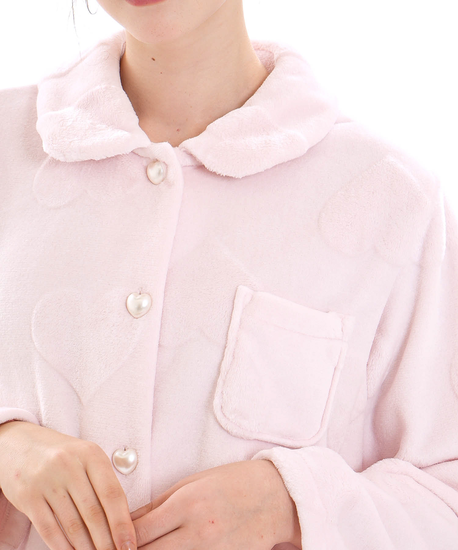 ボタンは優しい光沢感のあるパールのハートボタン。上品さが引き立ち、魅力的な一着です。