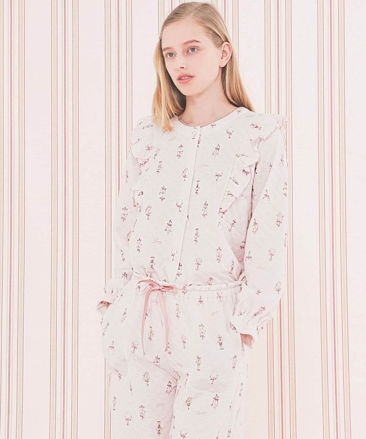 袖口と足口の細幅のフリルが甘すぎず、大人かわいい印象に。