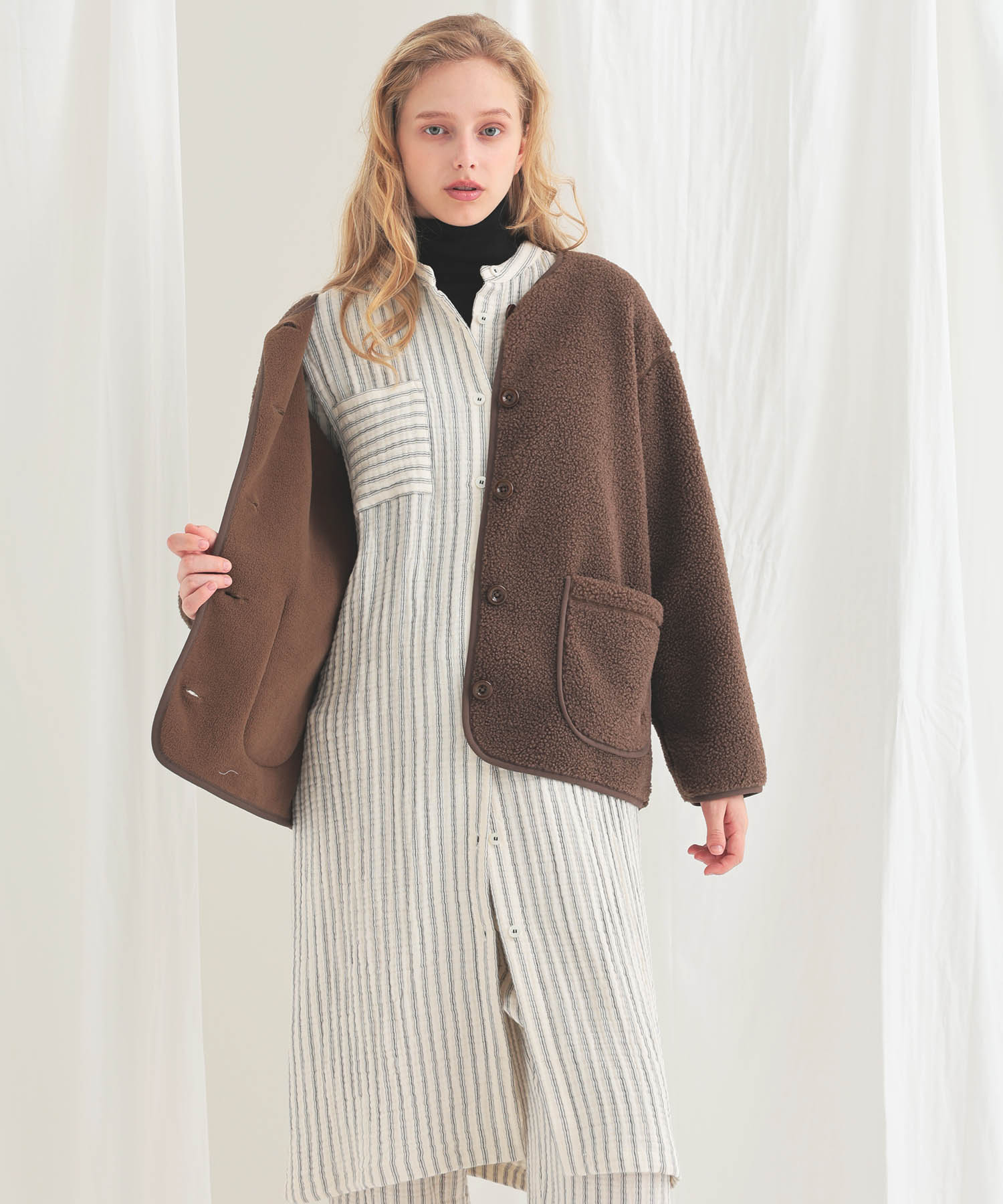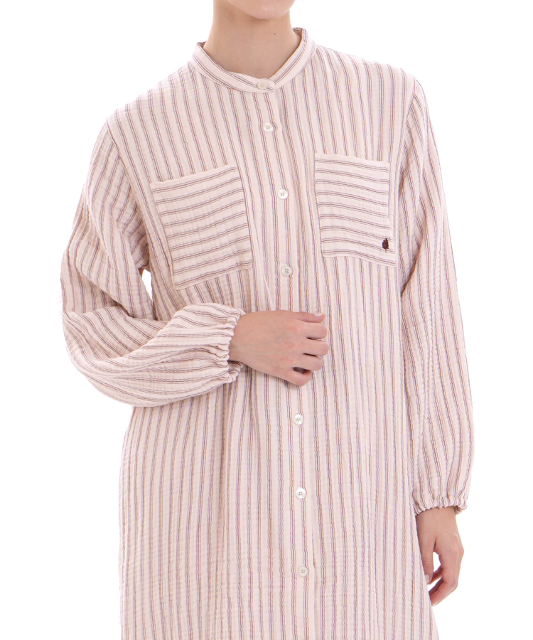 ワンピースとしてはもちろん、パンツを合わせたセットアップや羽織スタイルにもアレンジできる一着です。