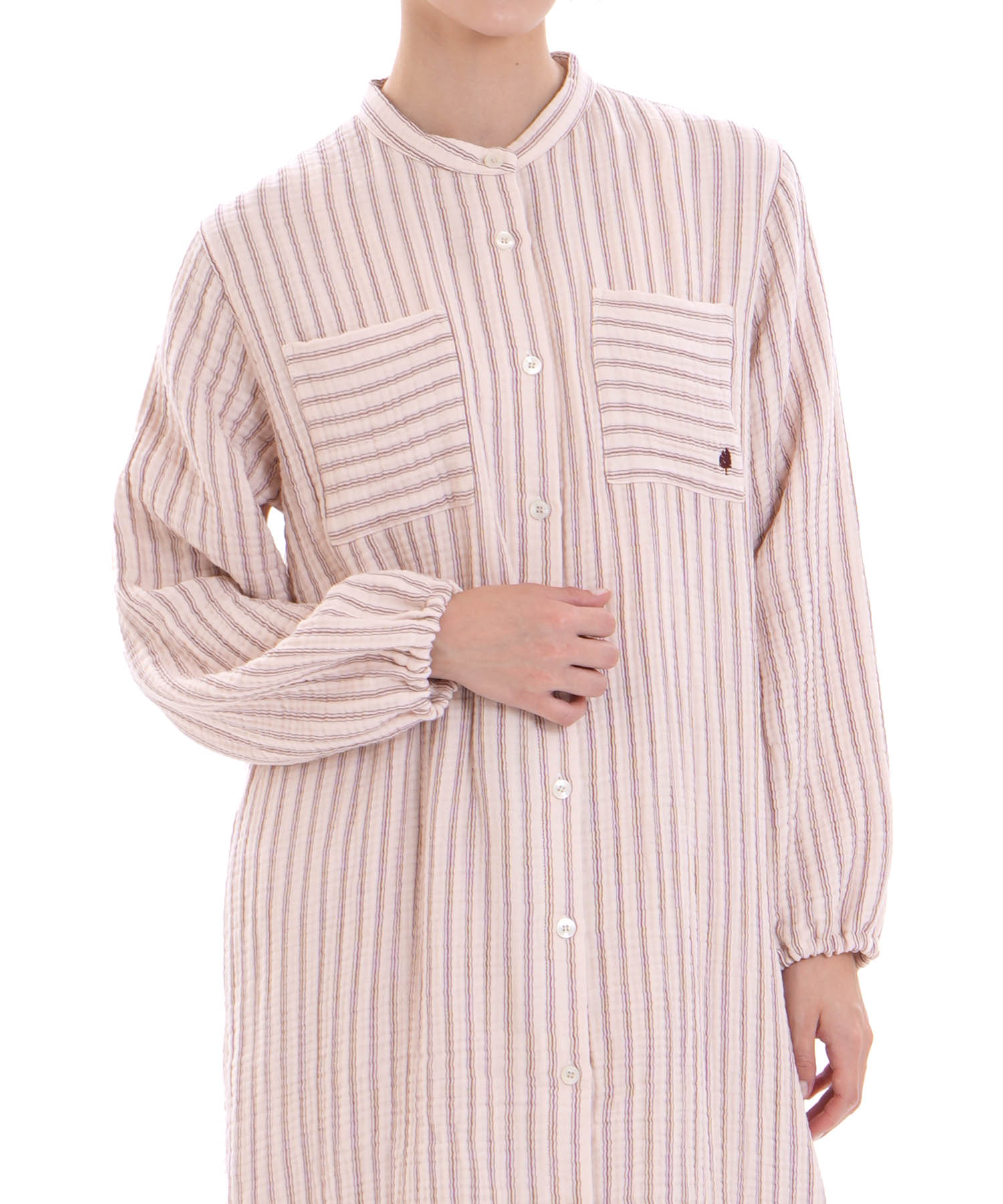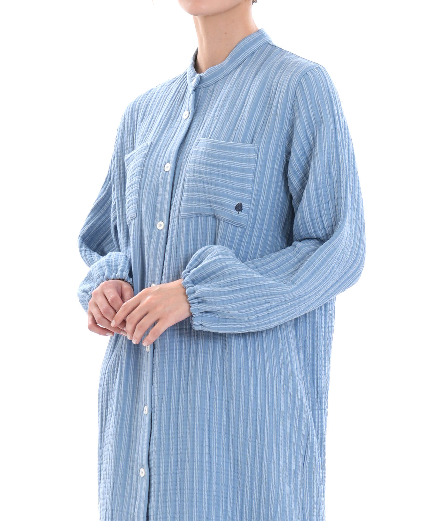 シャープな印象をまとった、スタンドカラーのシャツワンピース。