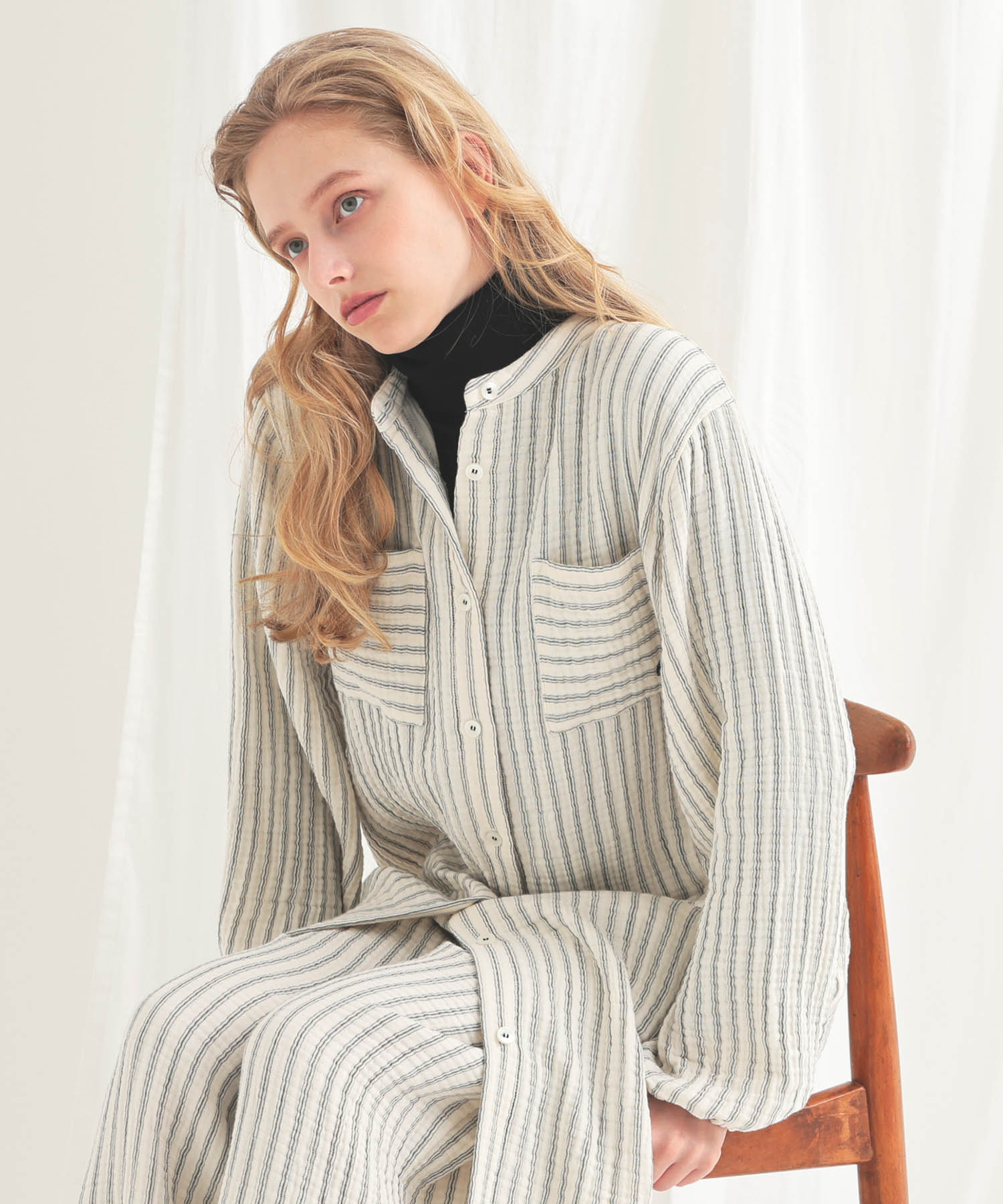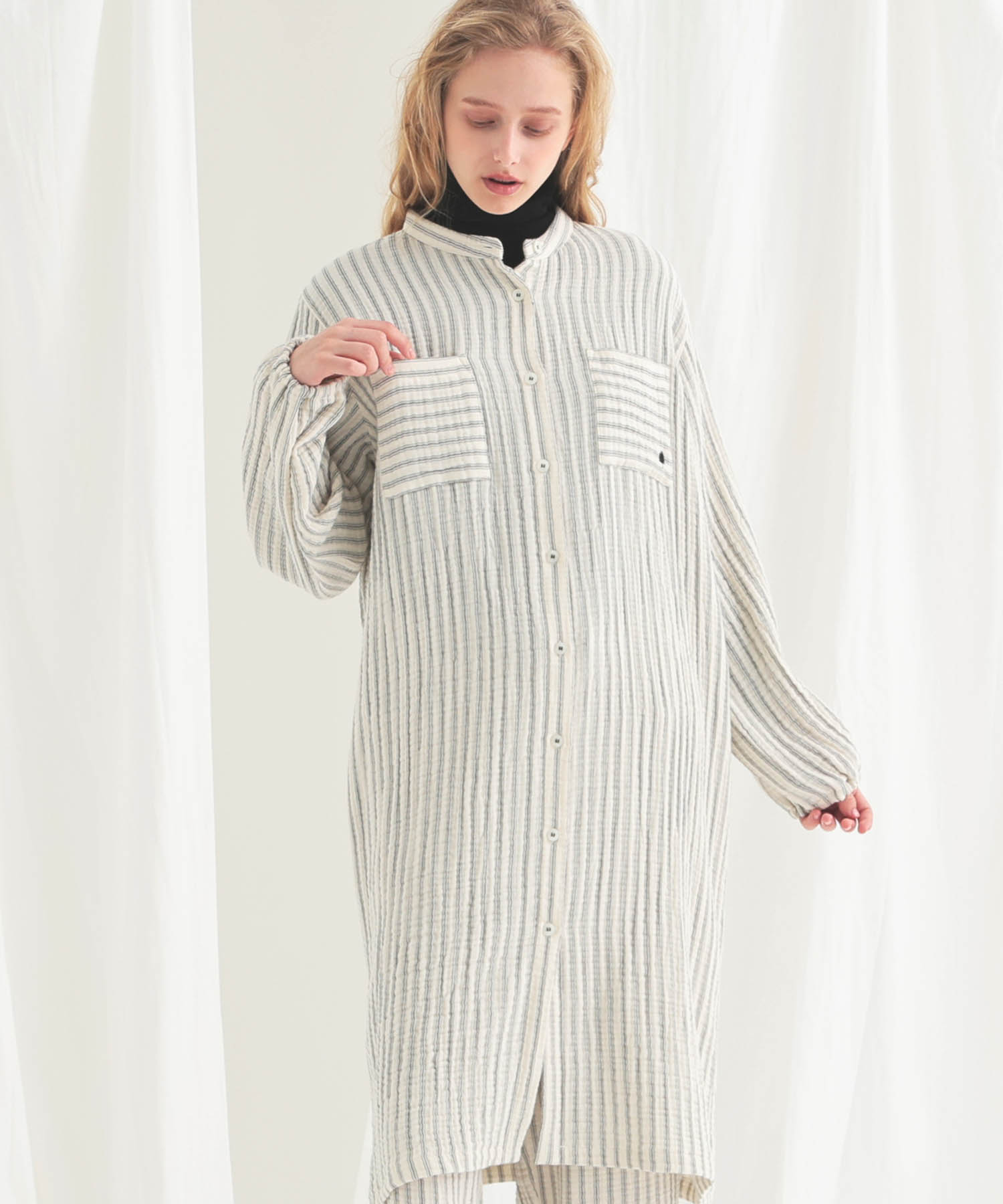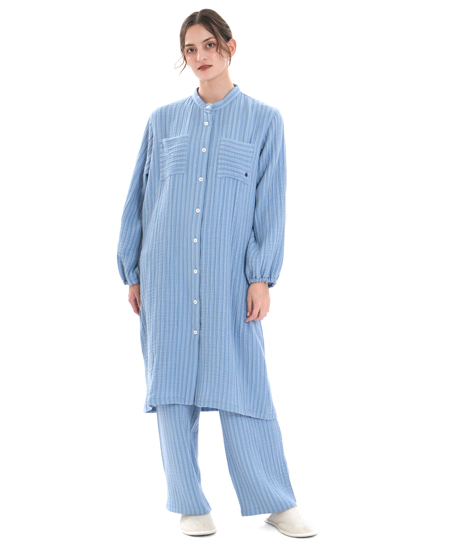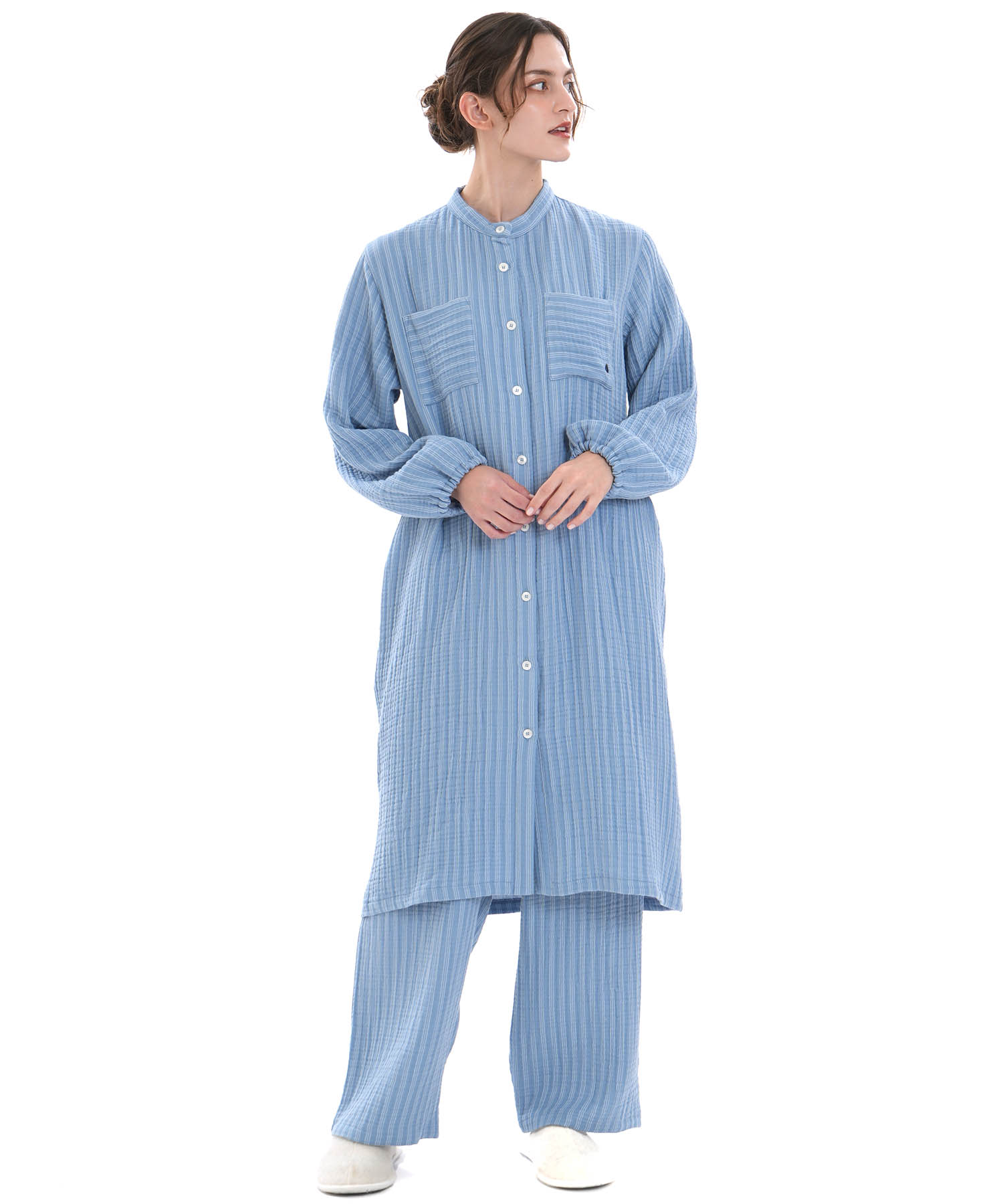 すっきりとした襟元がルームウェアとしても安心できるきちんと感を演出します。