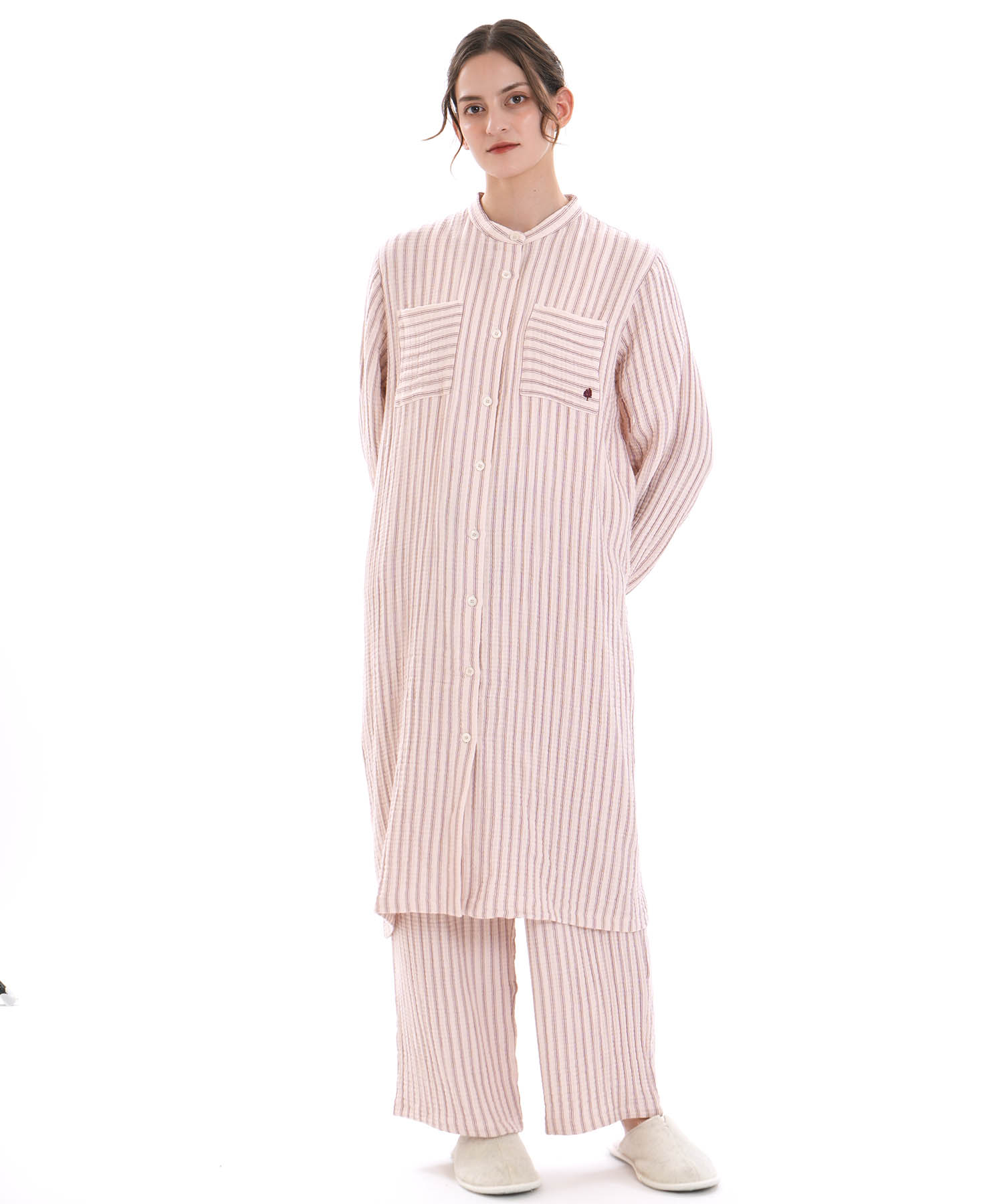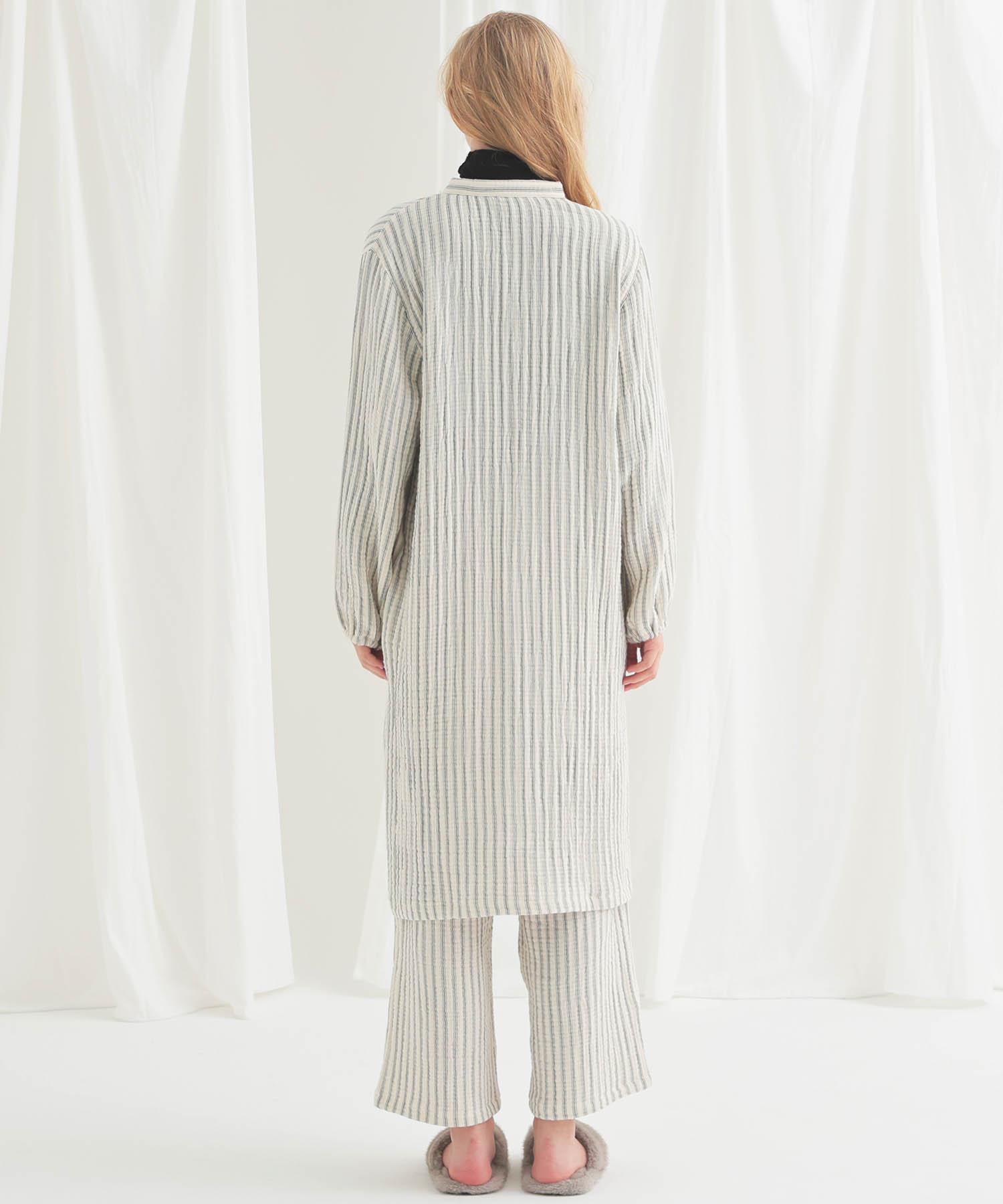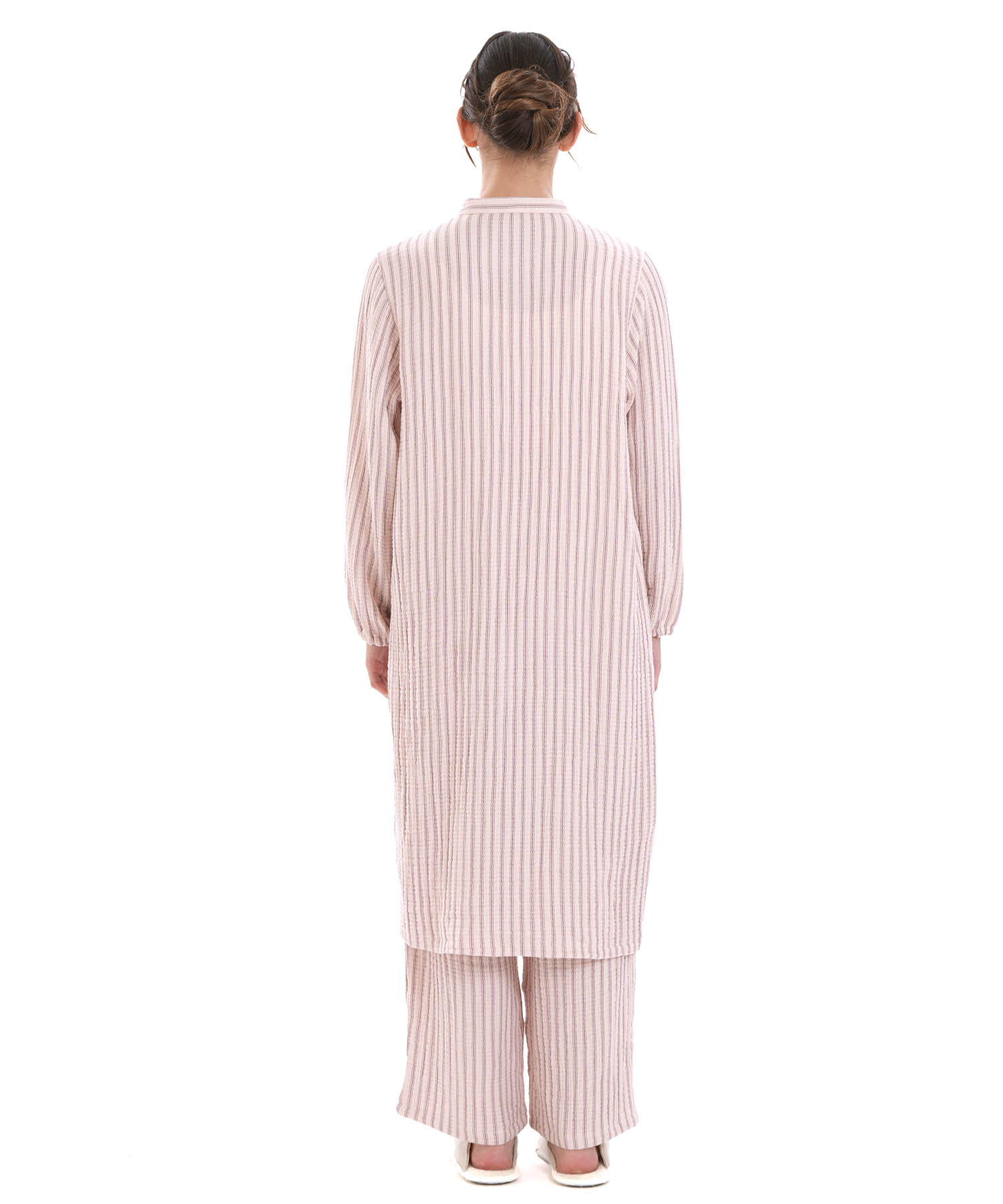 すっきりとした襟元がルームウェアとしても安心できるきちんと感を演出します。