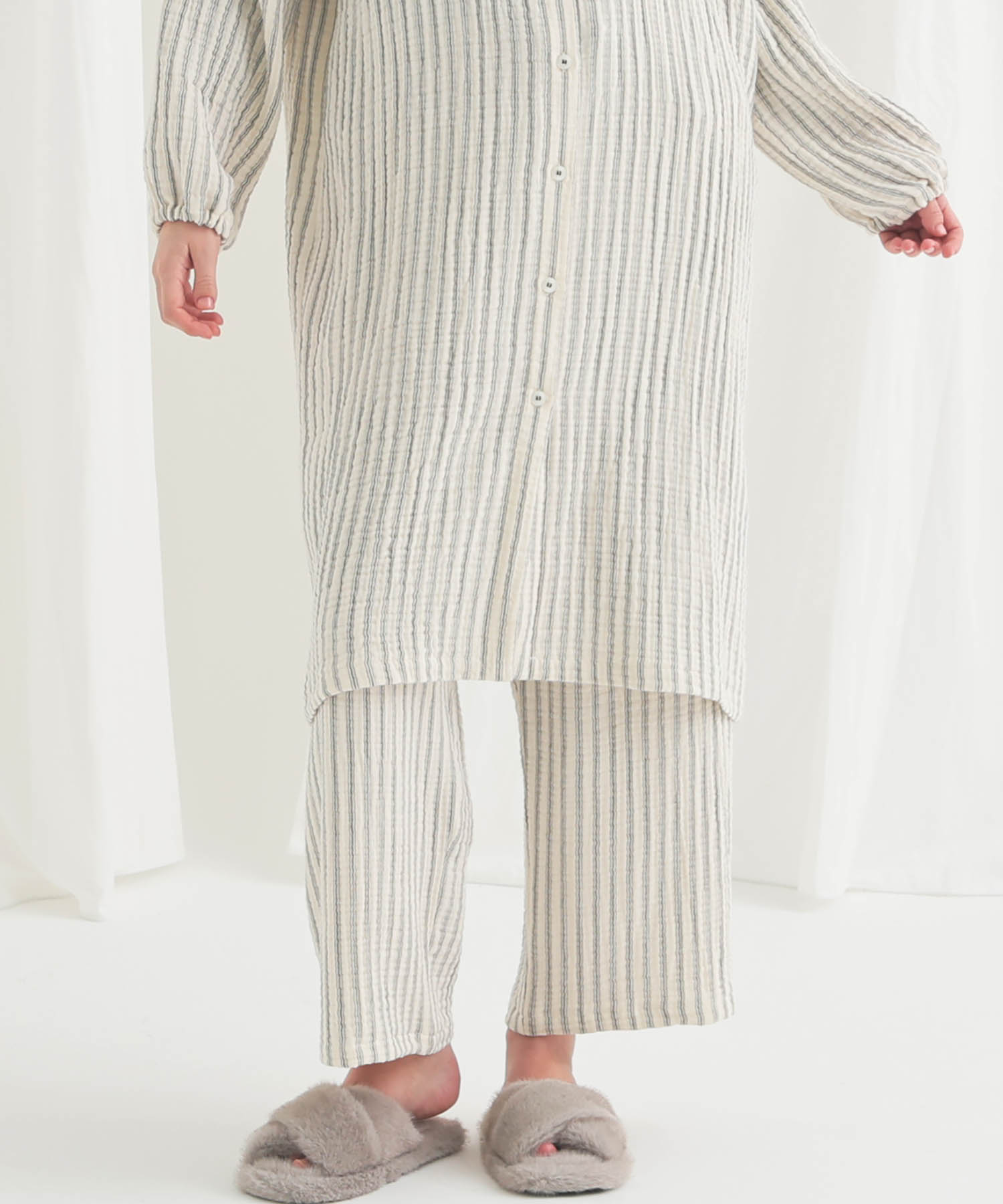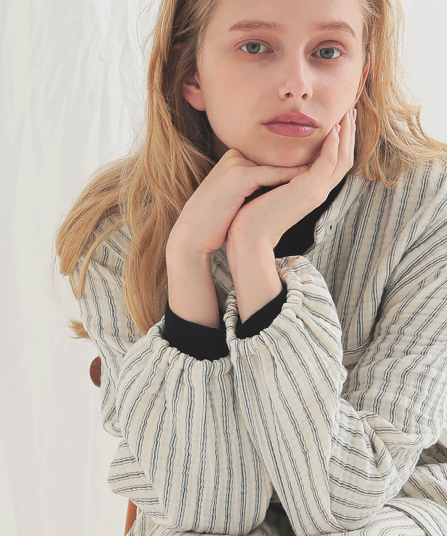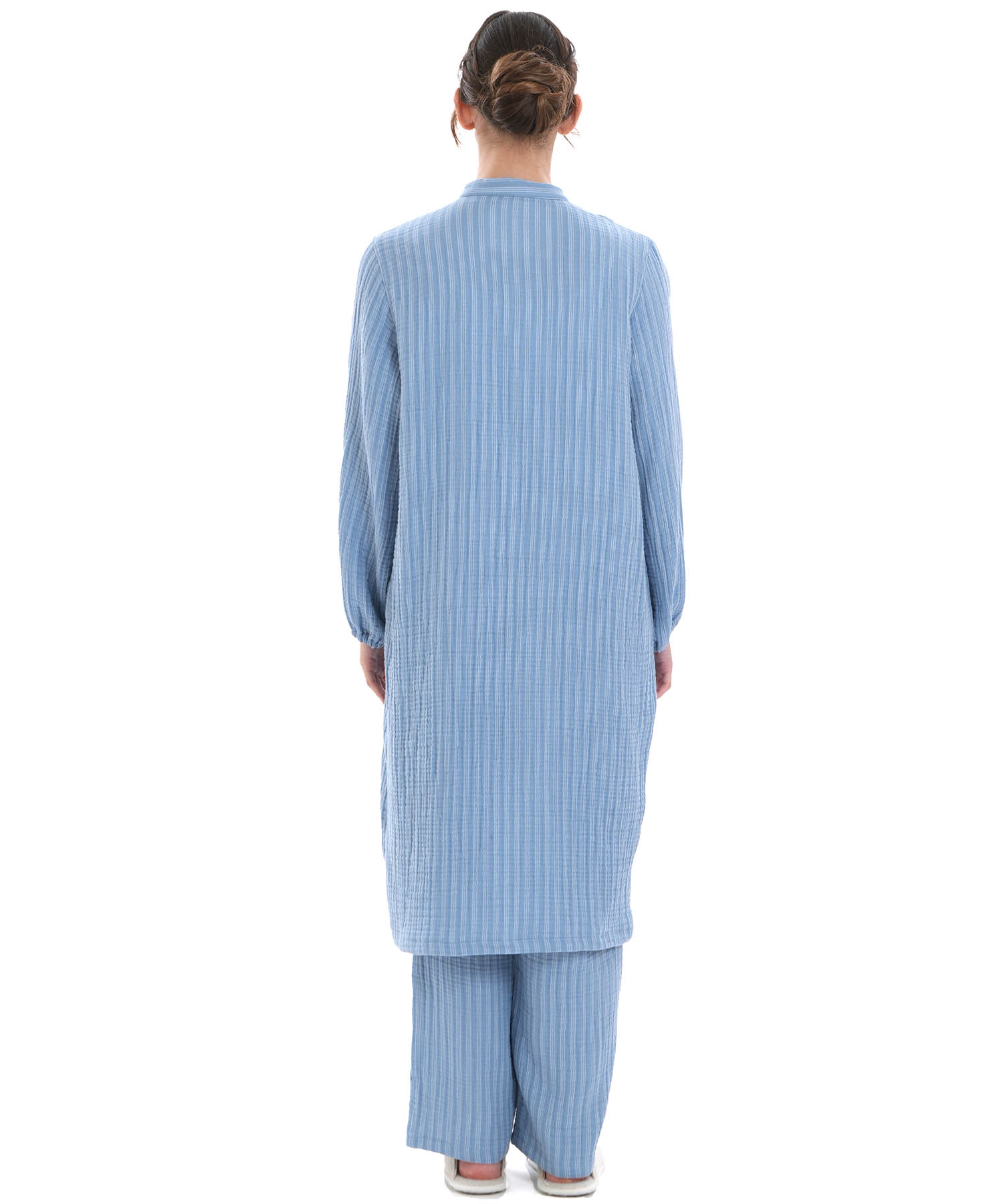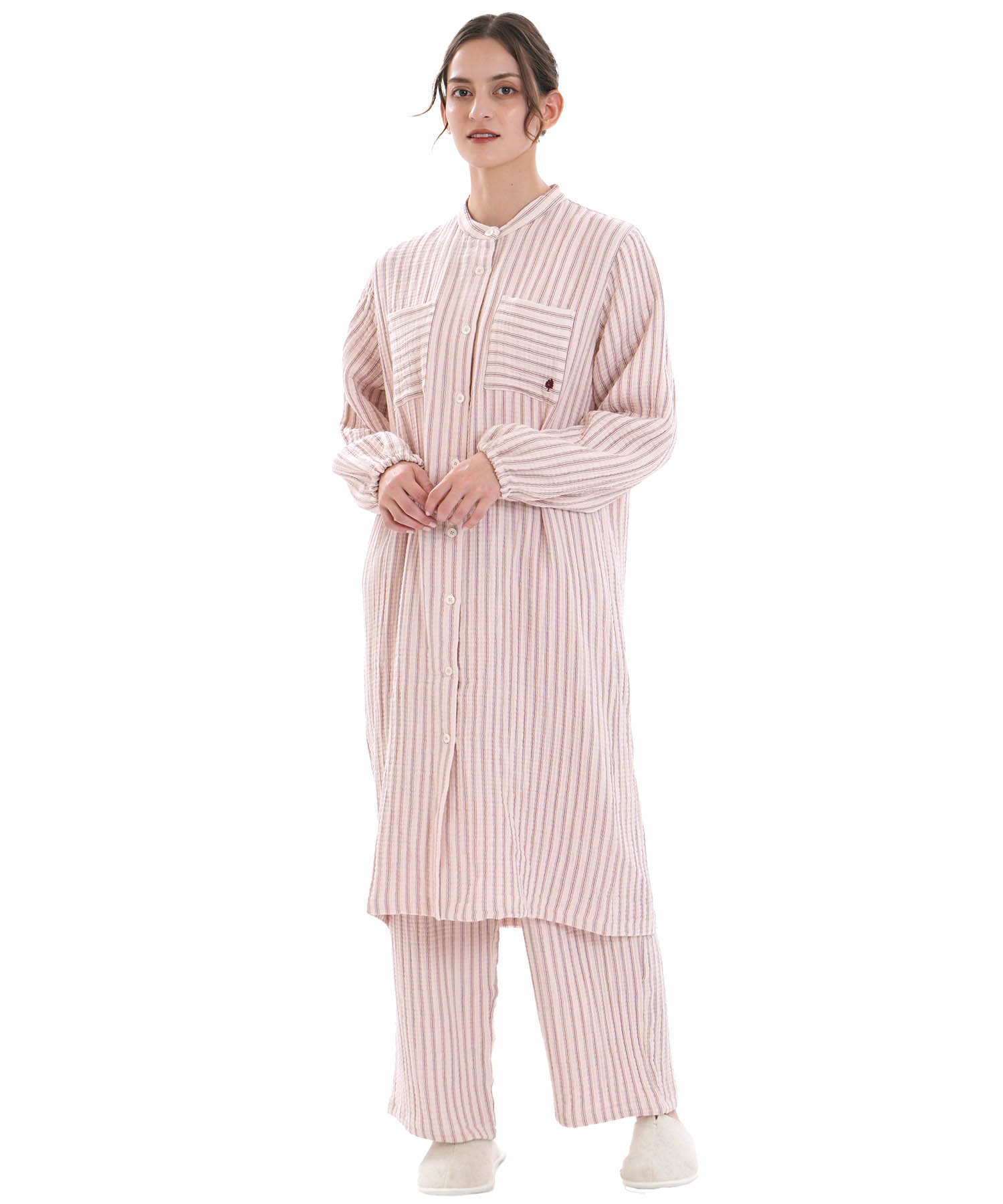 すっきりとした襟元がルームウェアとしても安心できるきちんと感を演出します。