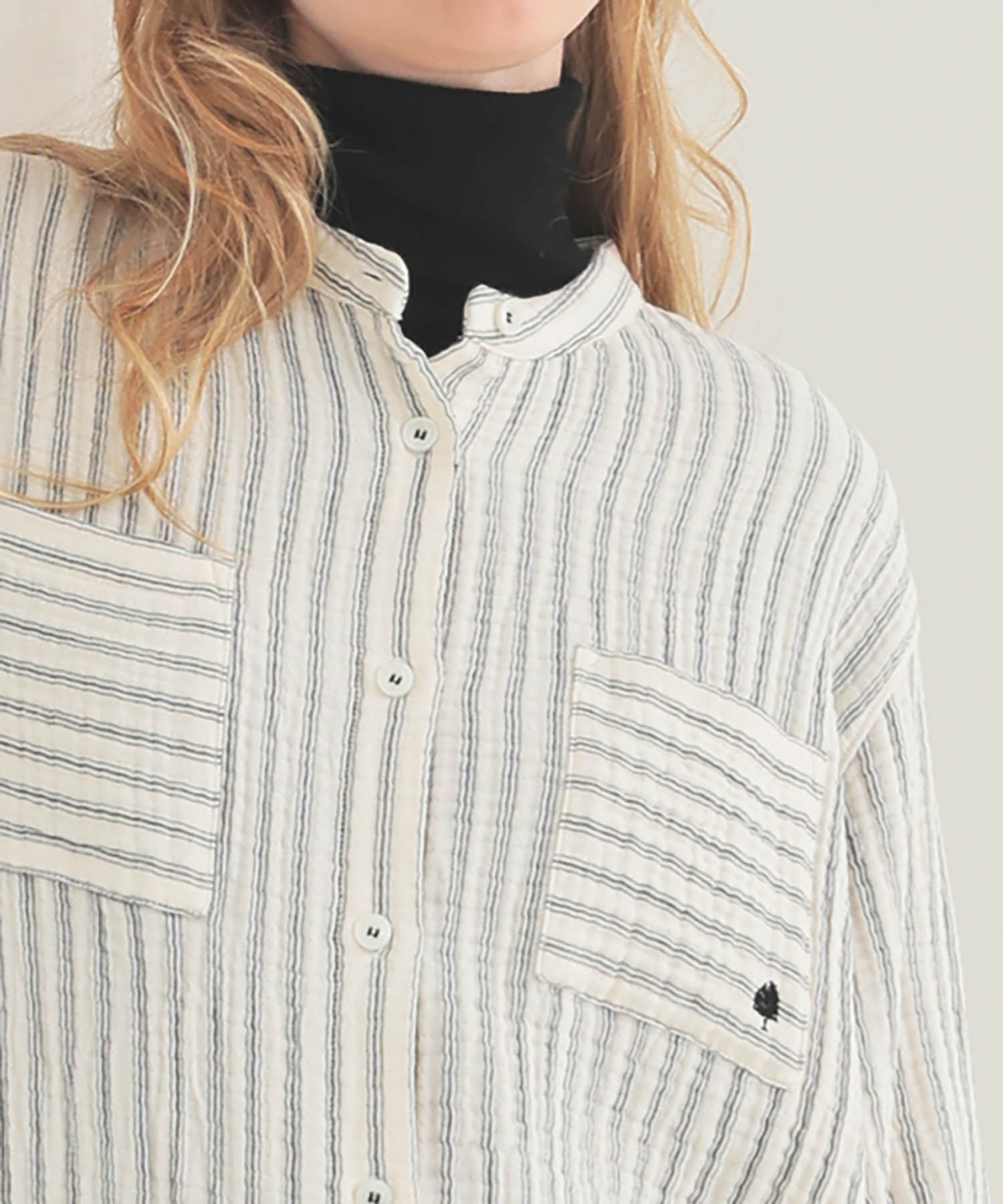 第一釦と第二釦の間隔をあえて狭めることで、釦を開けてもデコルテが見えすぎず、程よい抜け感に。