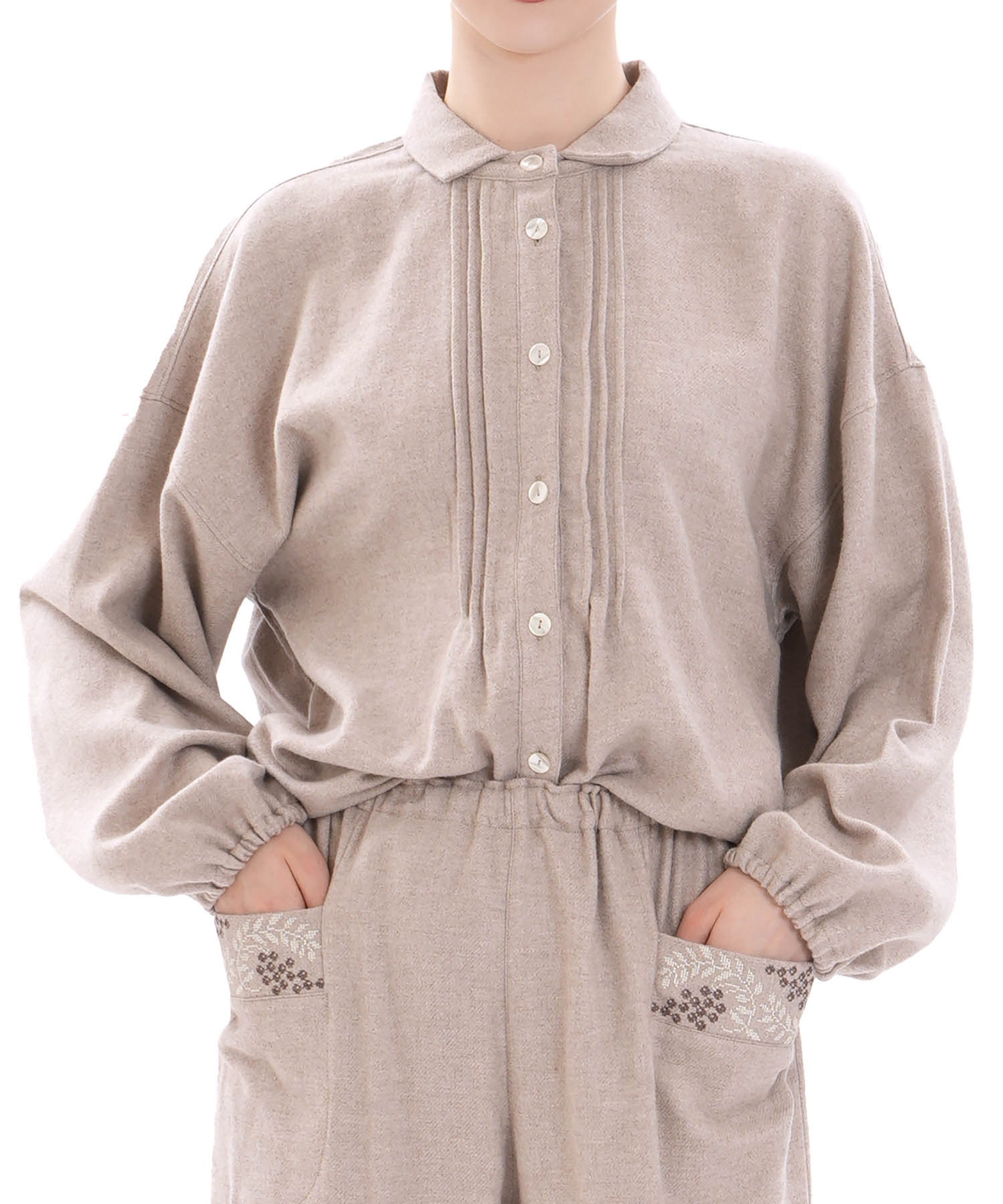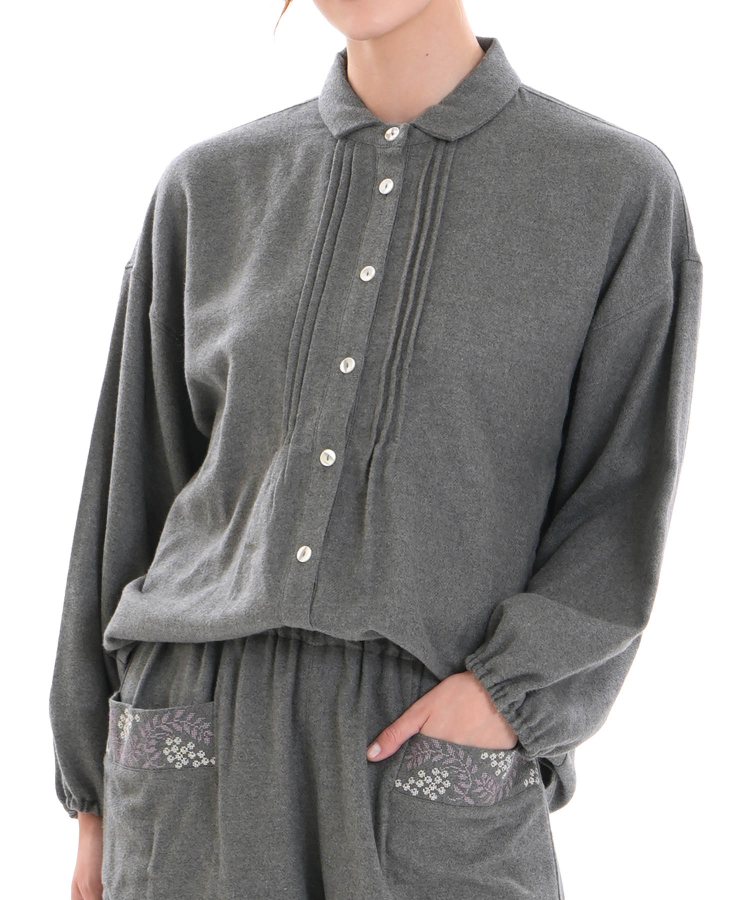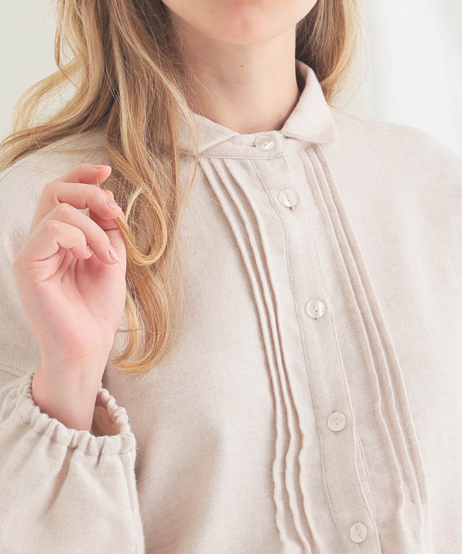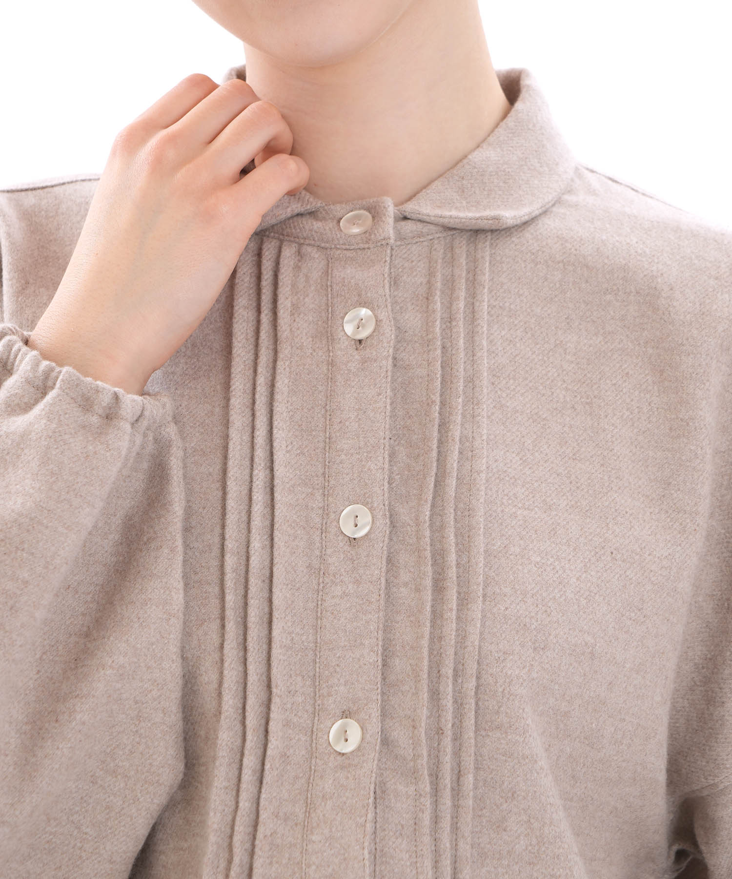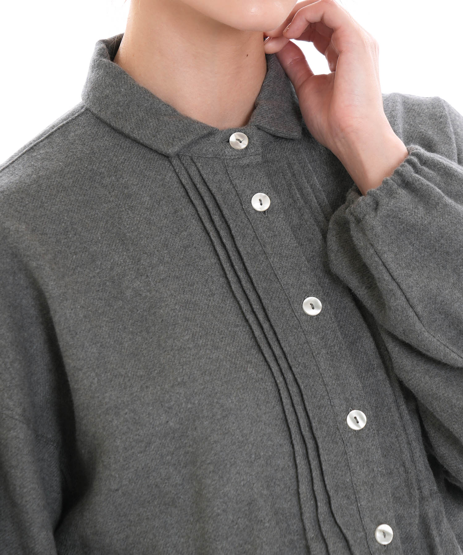 フロントに施したピンタックが、さりげない立体感をプラスしています。
