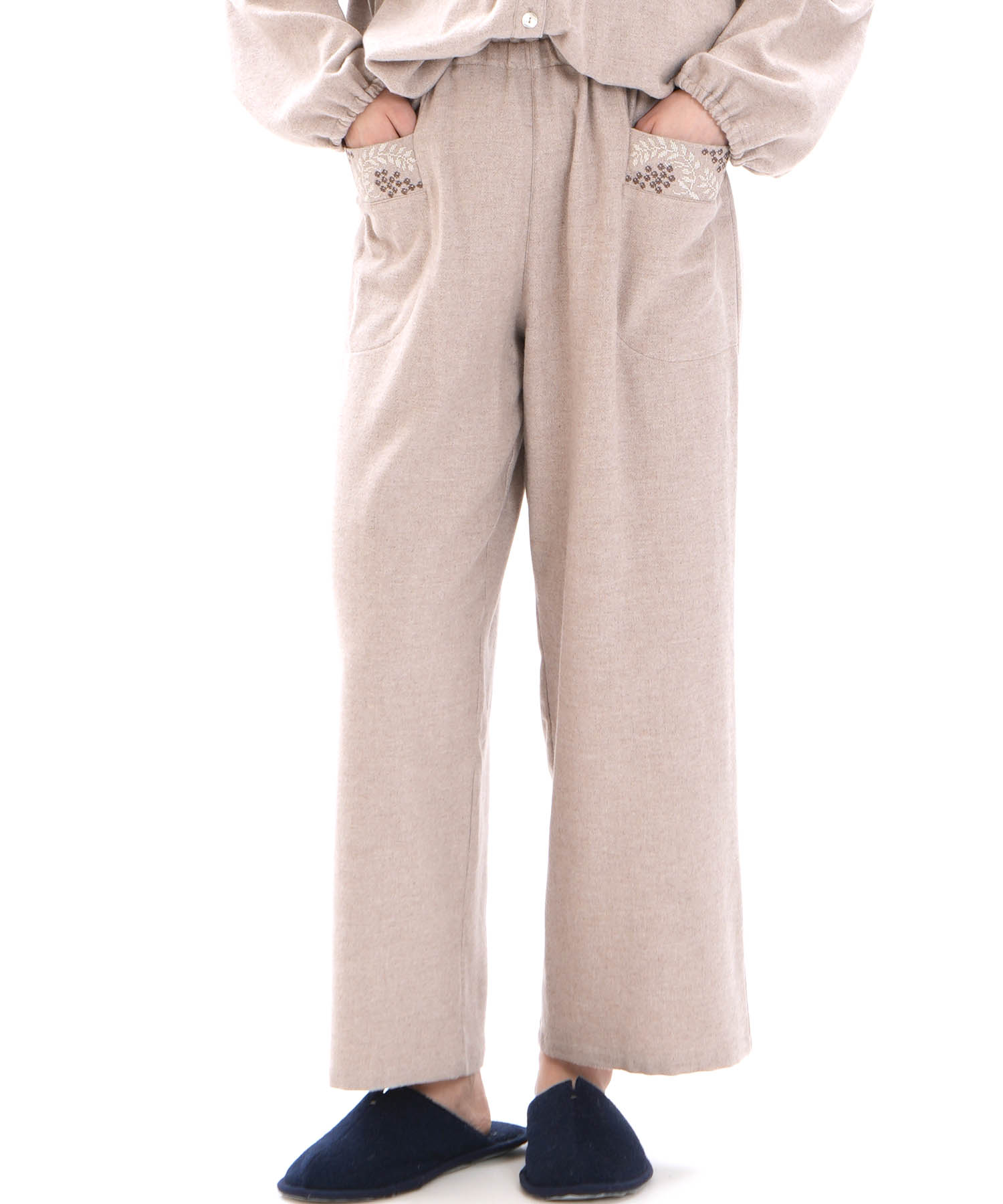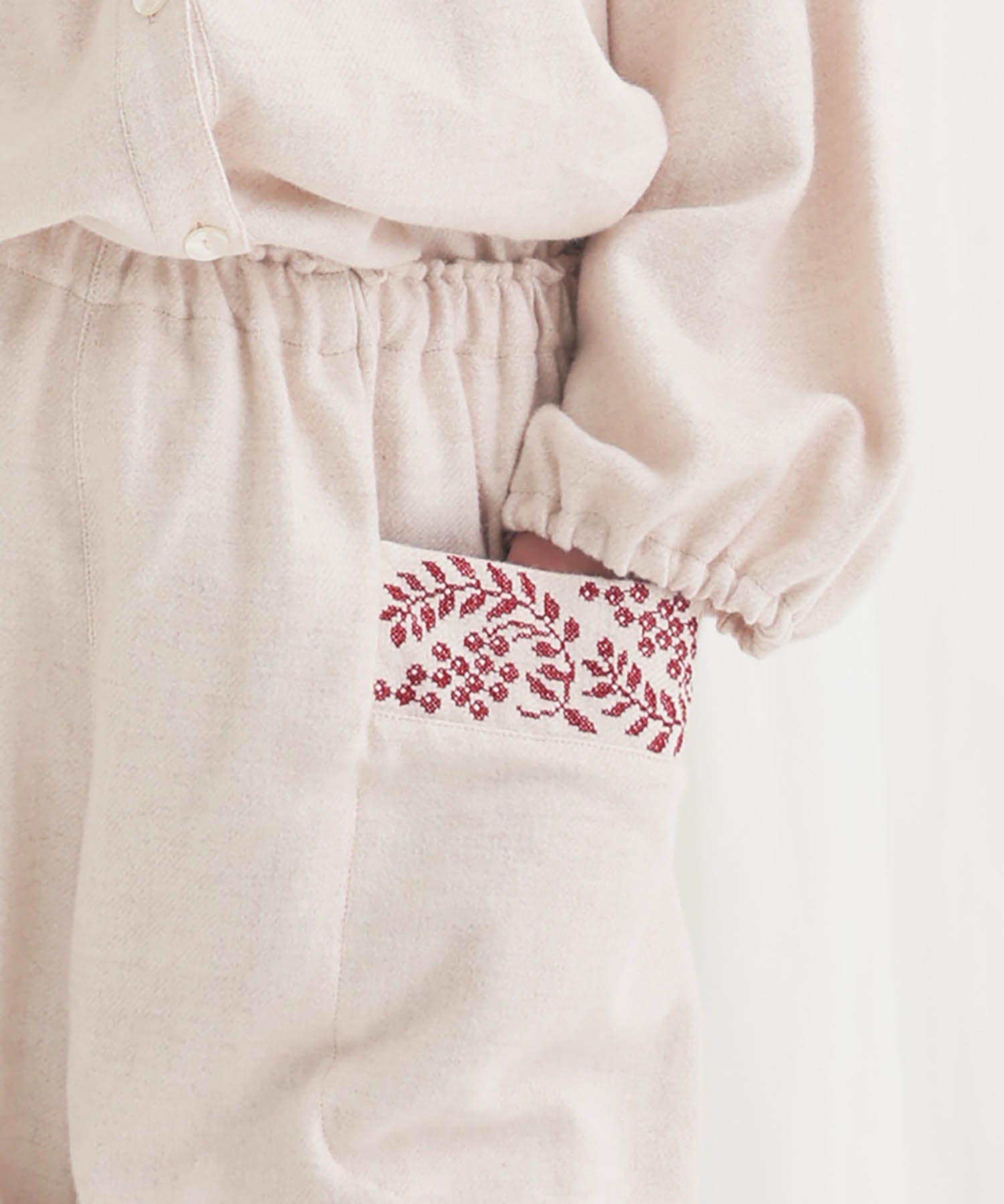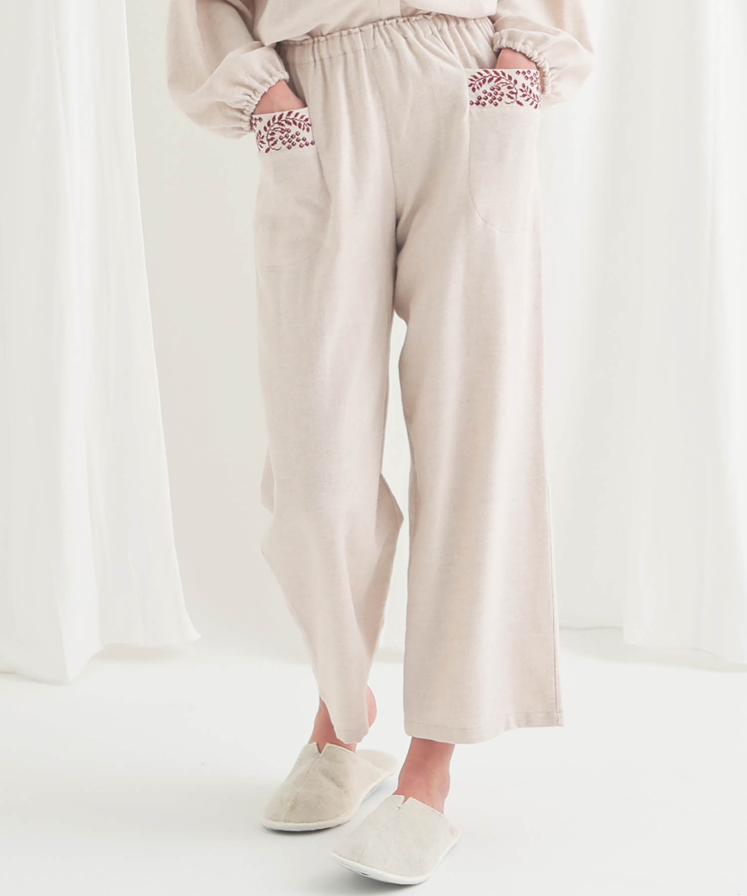 ホリデームードを感じさせるウインターベリー刺繍が華やかに映える、ストレートパンツのセットアップ。