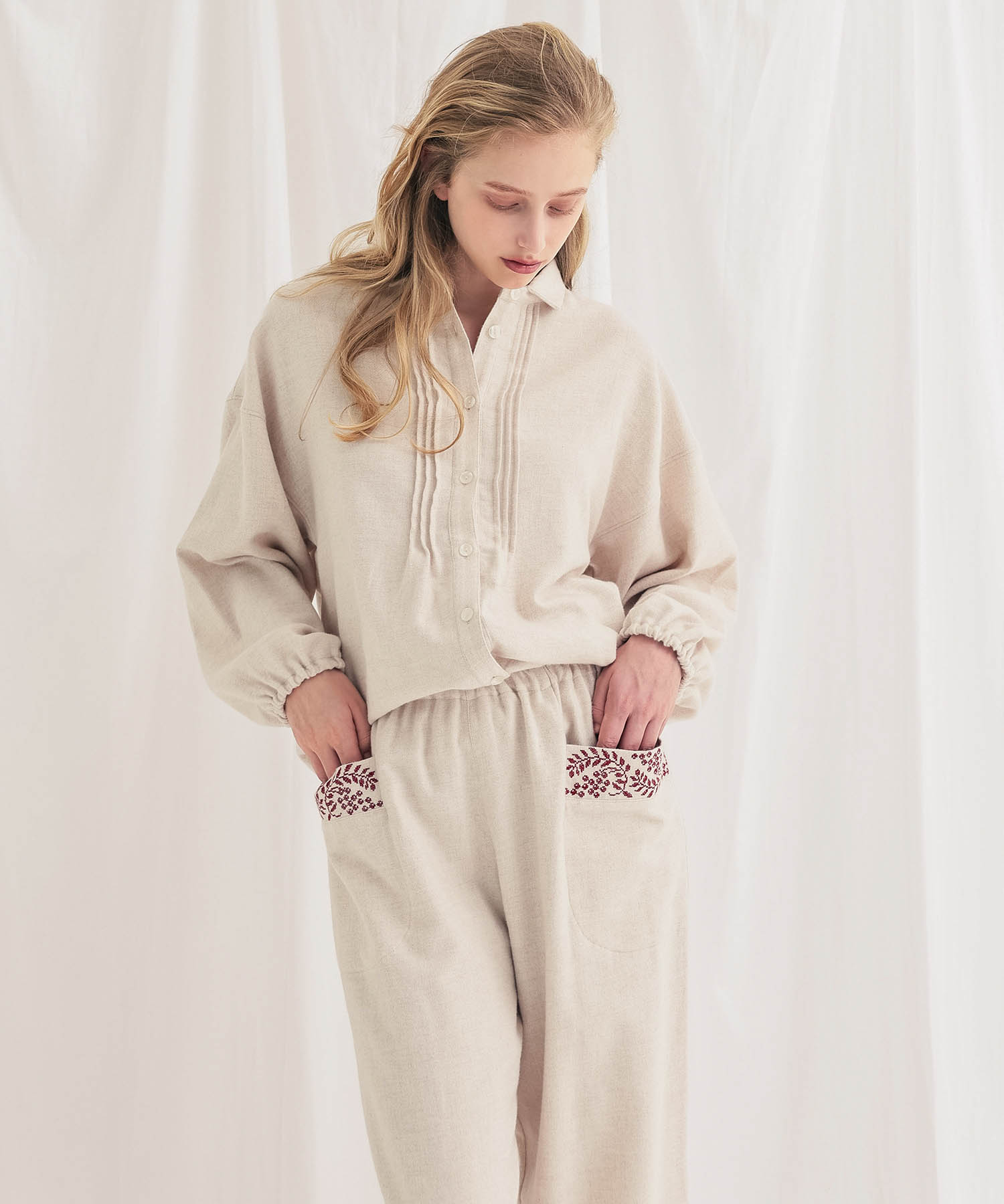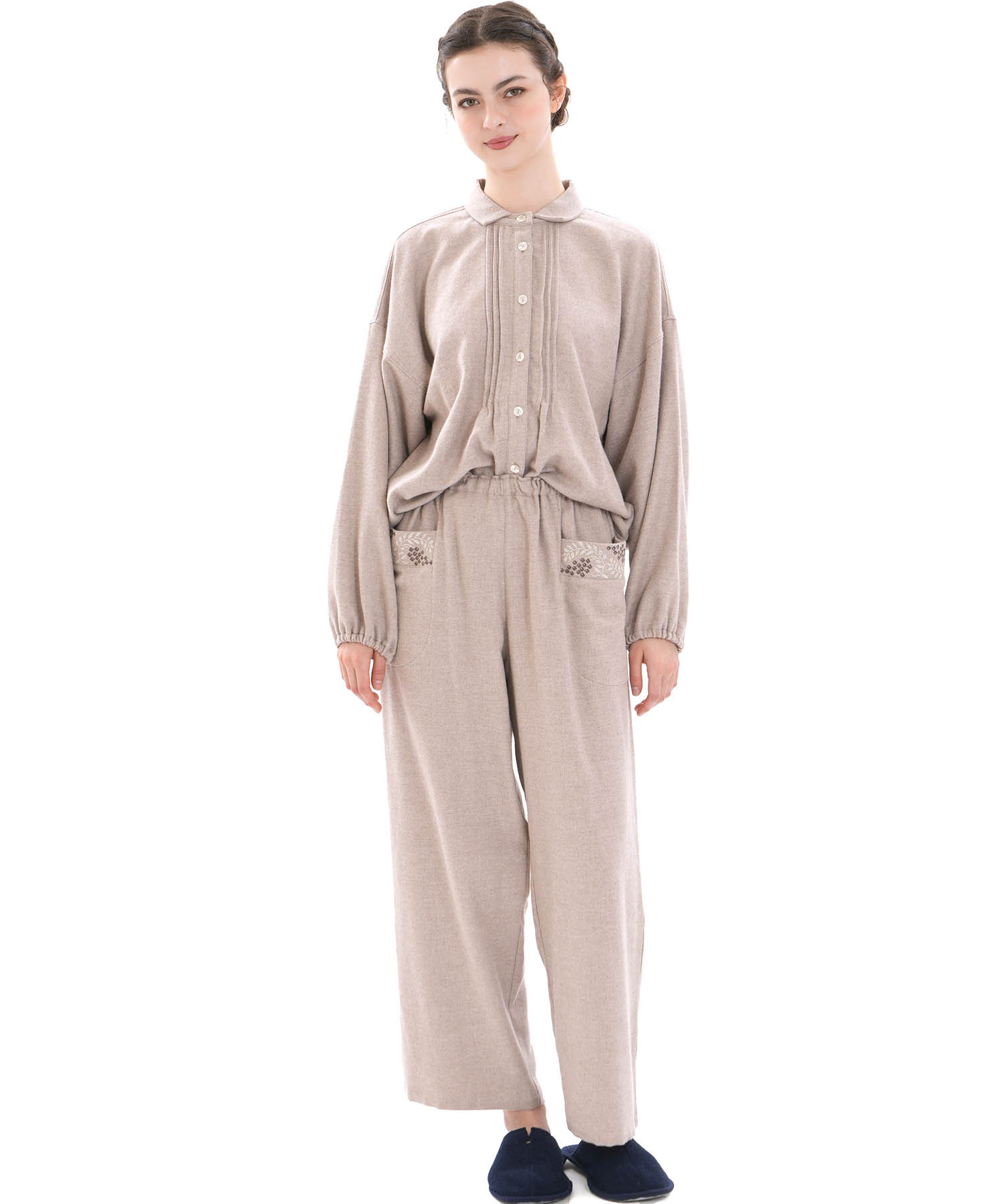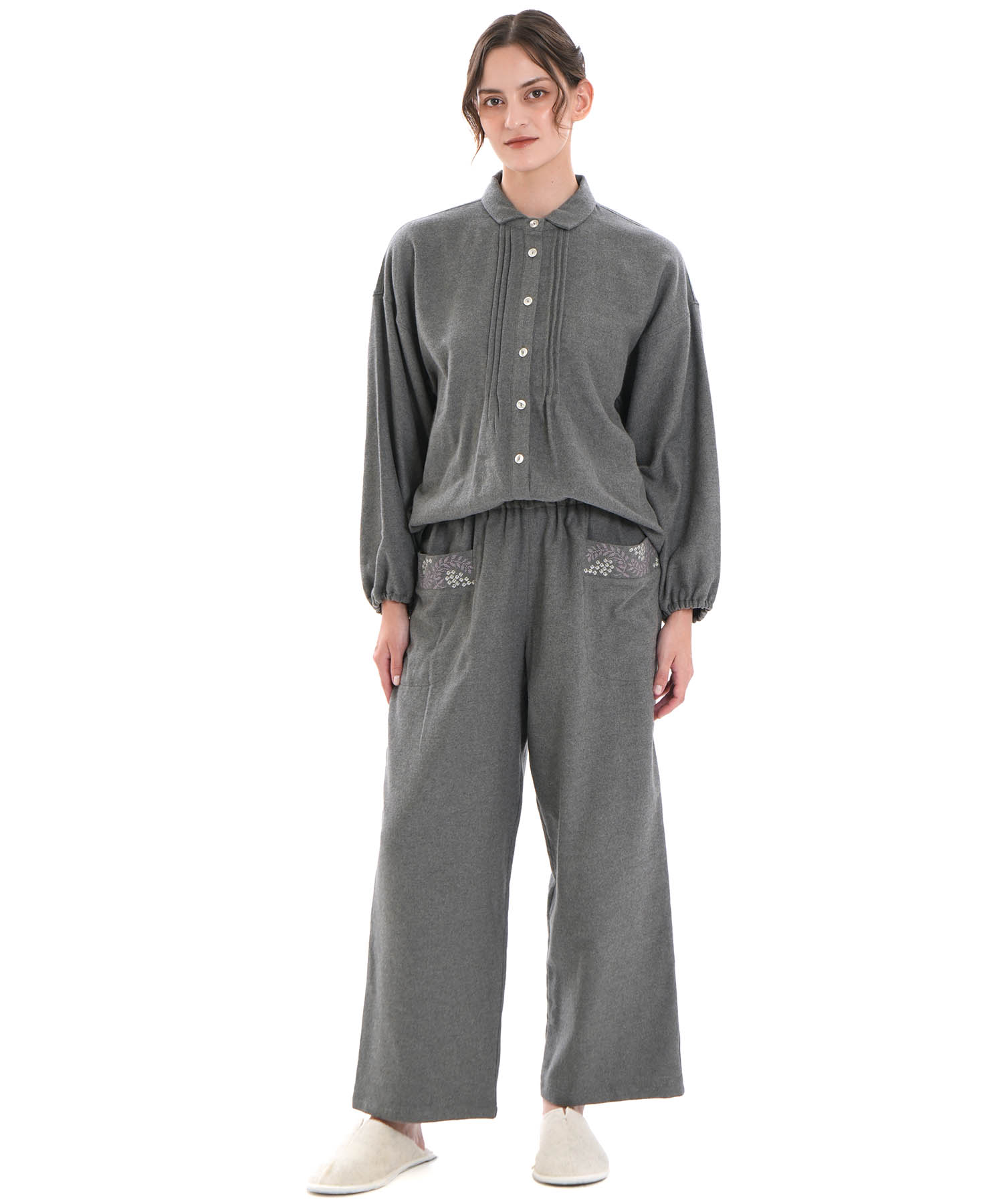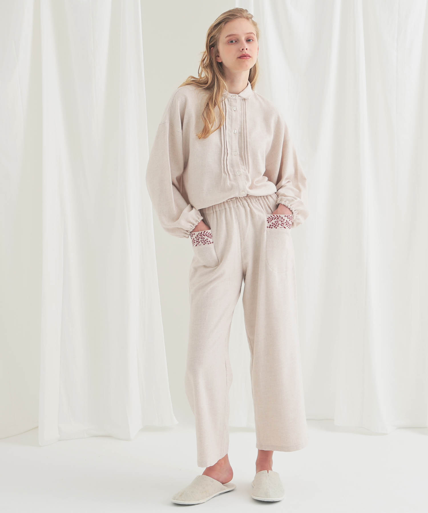 ホリデームードを感じさせるウインターベリー刺繍が華やかに映える、ストレートパンツのセットアップ。