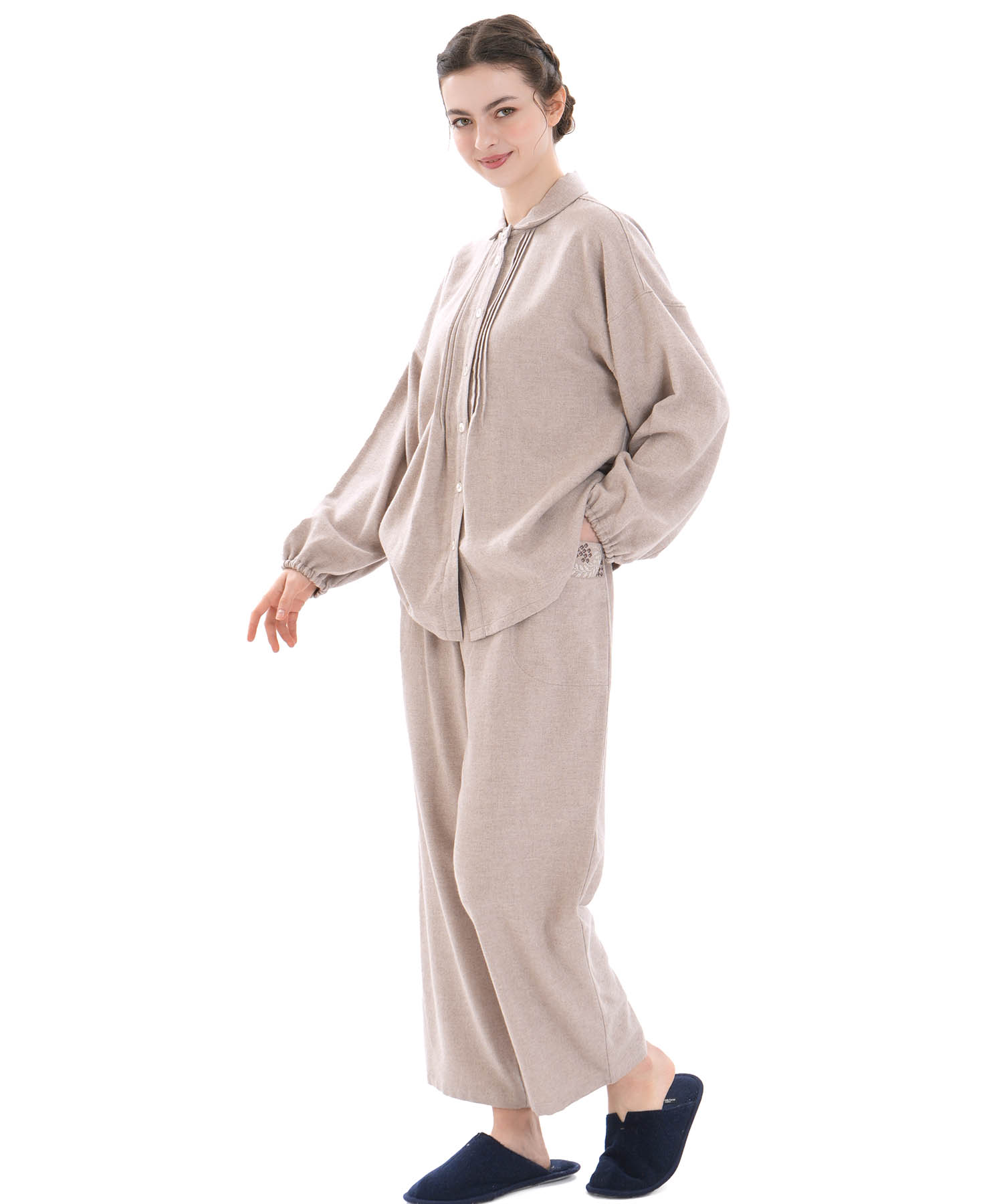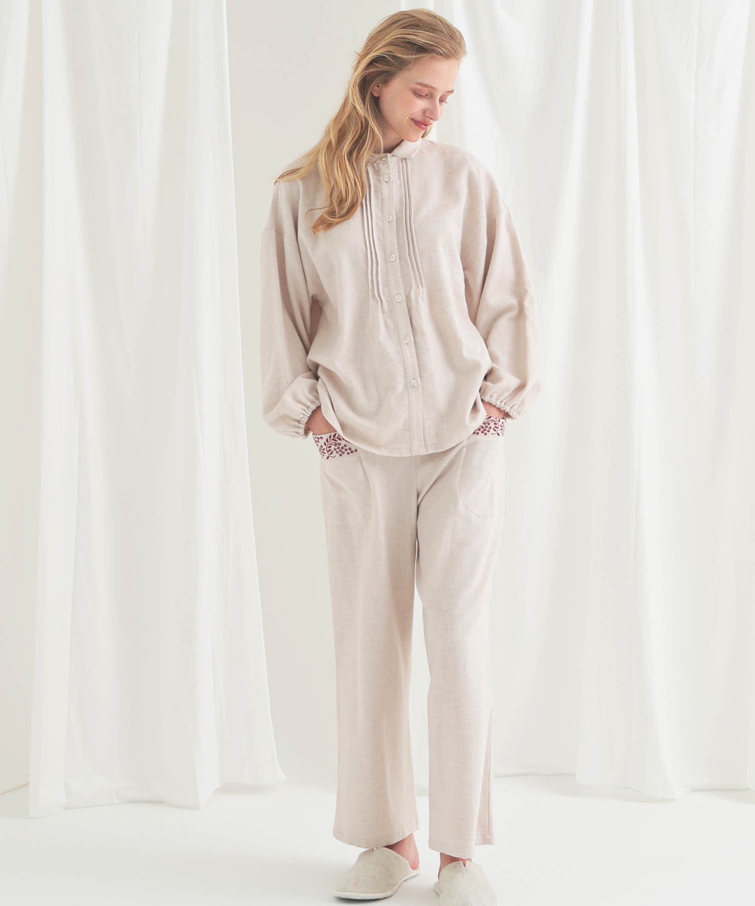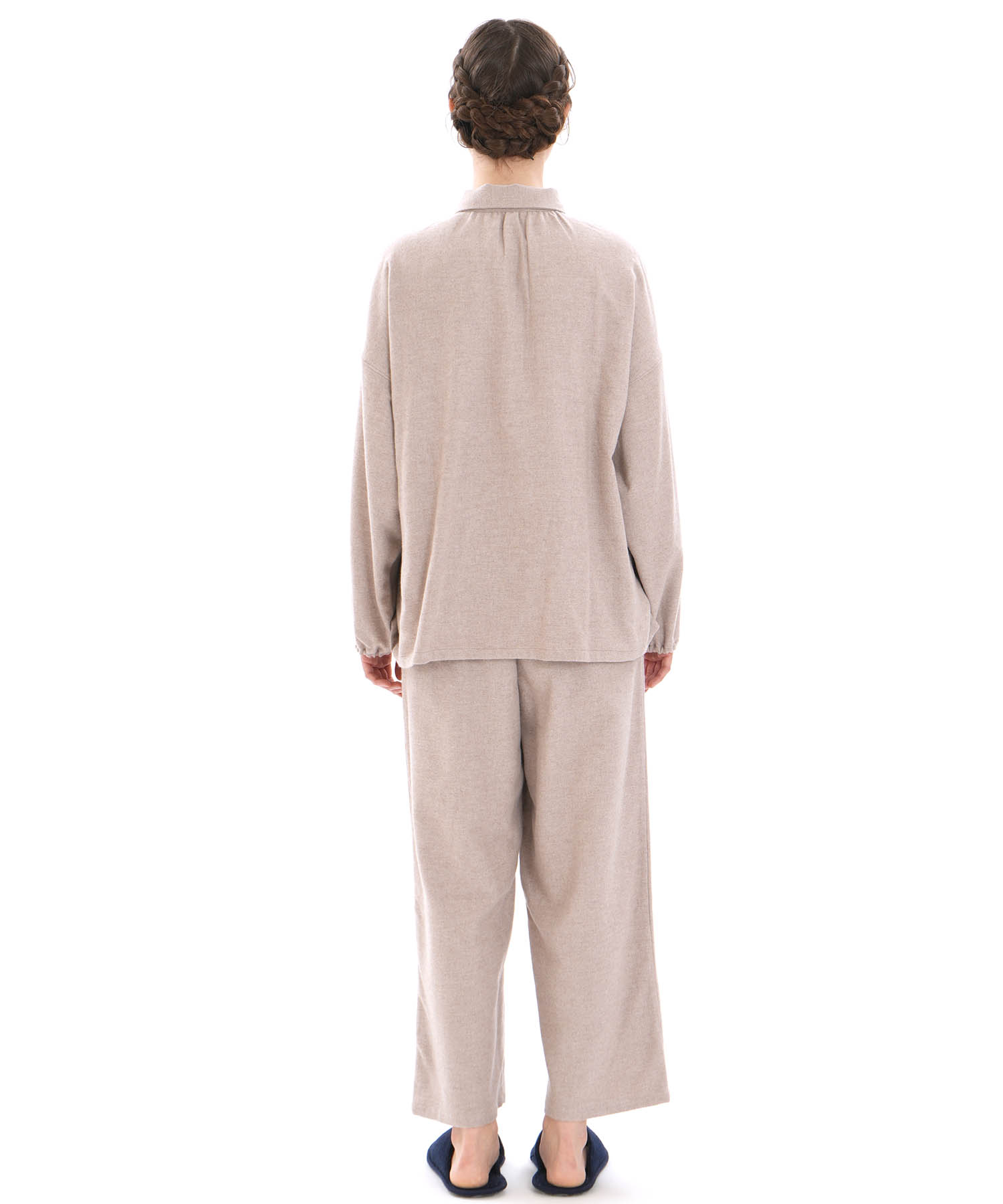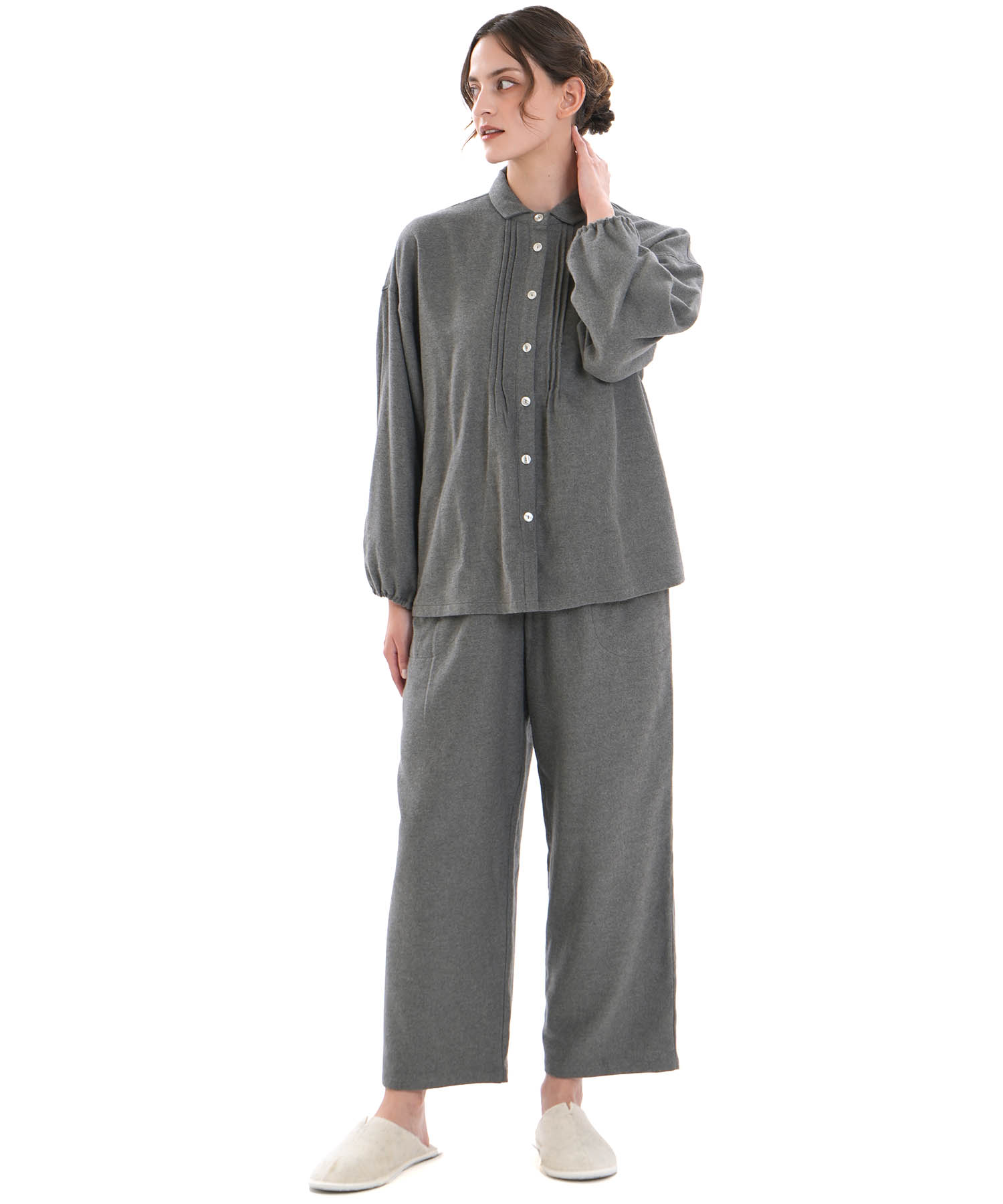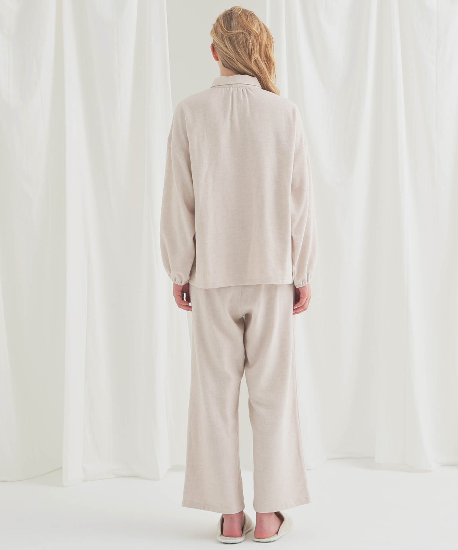 上下合わせた時のバランスにもこだわり、エフォートレスながら華やかさと品を兼ね備えた、大人の“欲張り”を満たす万能ルームウェアです。