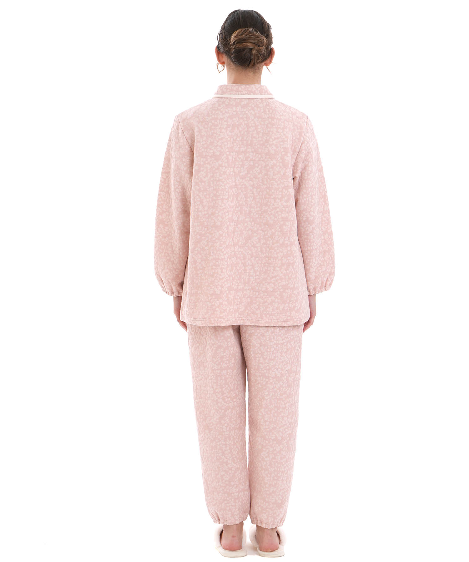 2枚の生地を点でつなぎ合わせて編み上げた素材で、お肌に馴染む適度な伸縮性と生地と生地の間に空気の層が出き、ほんわりと暖かみのある風合いが特長。