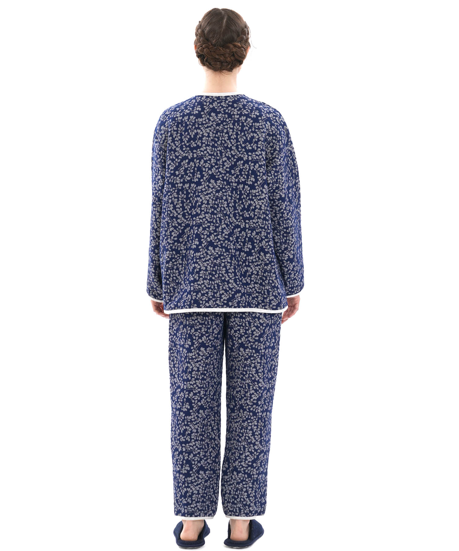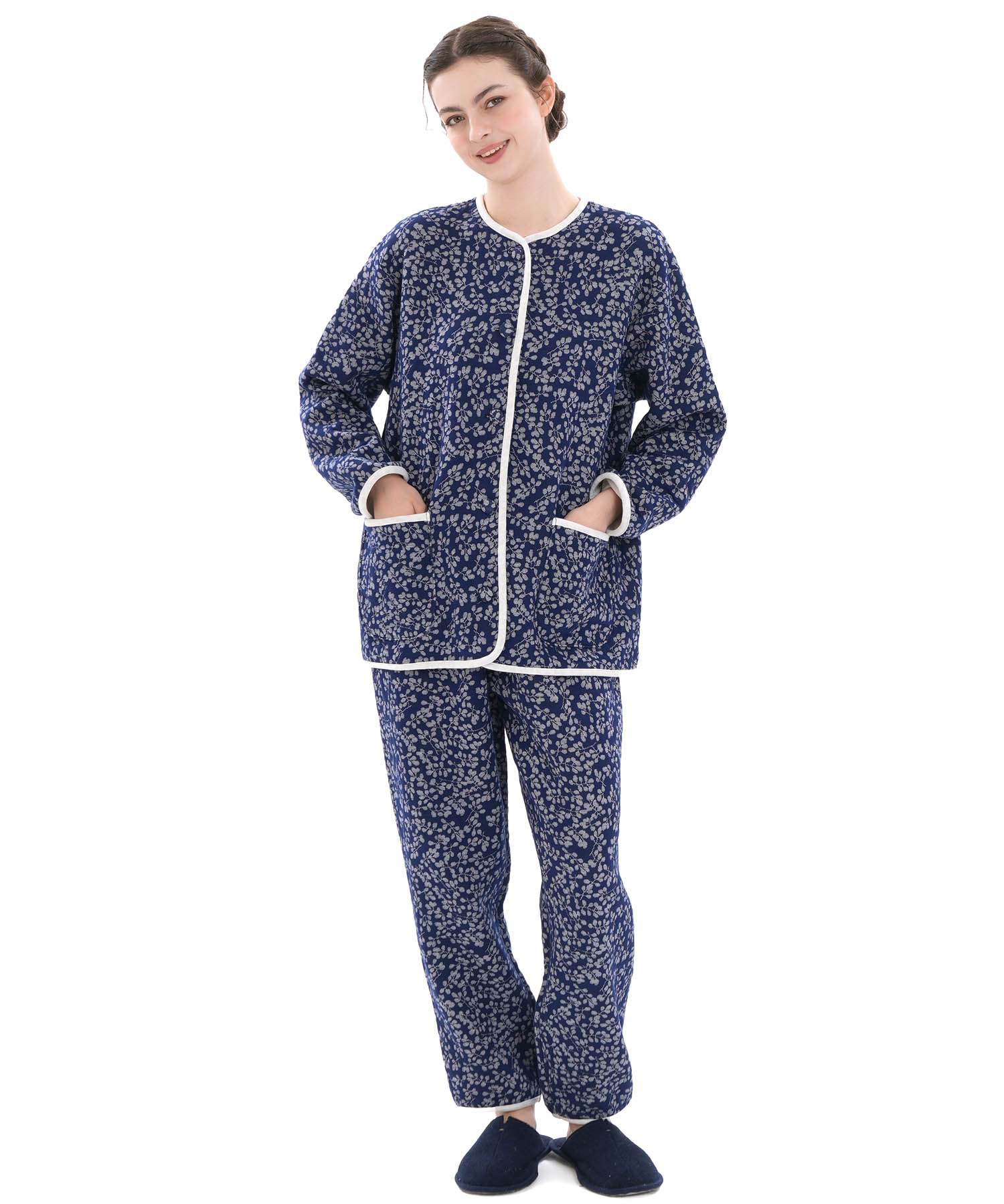 2枚の生地を点でつなぎ合わせて編み上げた素材で、お肌に馴染む適度な伸縮性と生地と生地の間に空気の層が出き、ほんわりと暖かみのある風合いが特長。