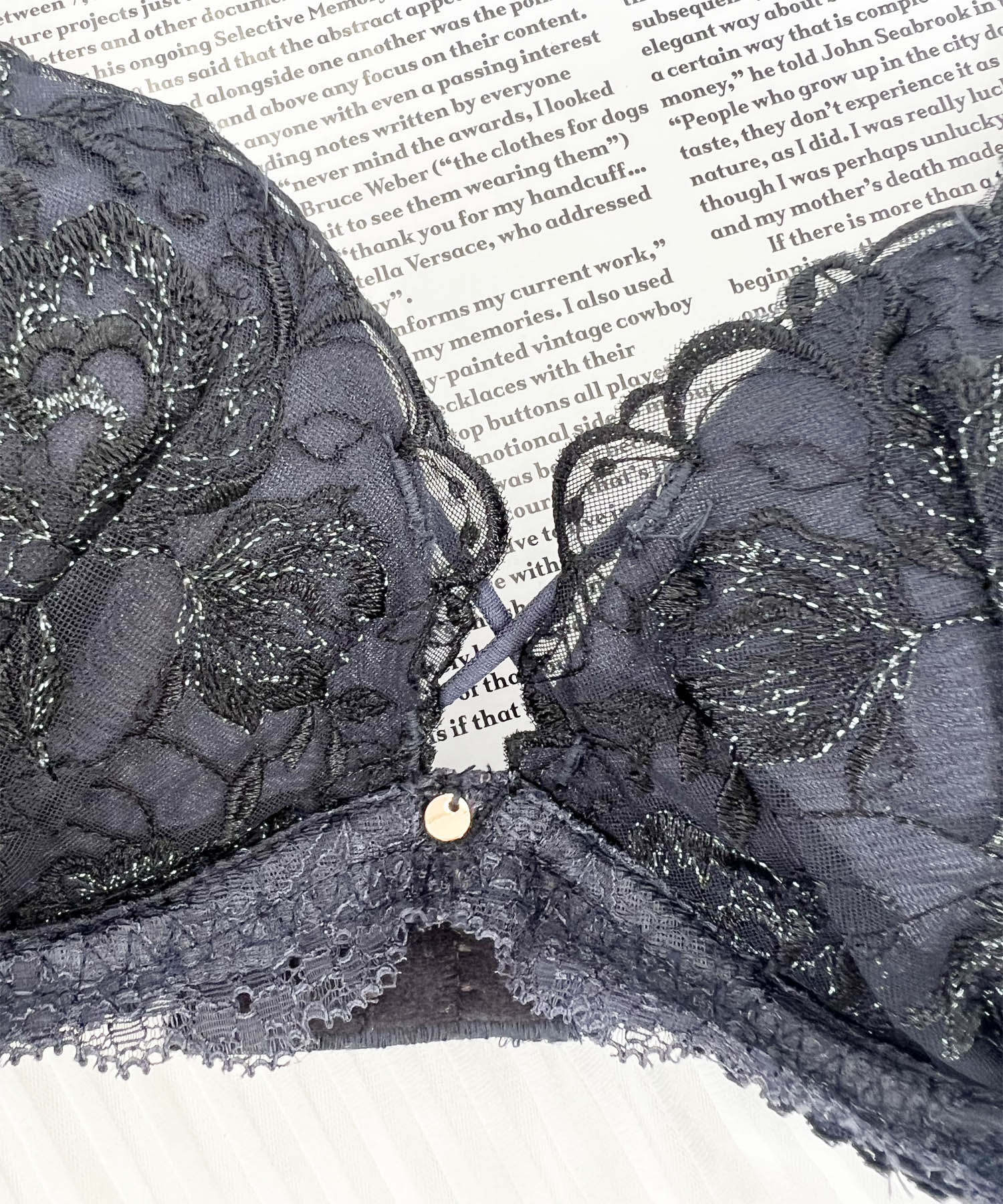 ネイビー:ネイビーベースに黒の配色レースでクールかつベーシックにご着用いただけるカラー。くすみ系のネイビーがスタイリッシュな印象です。