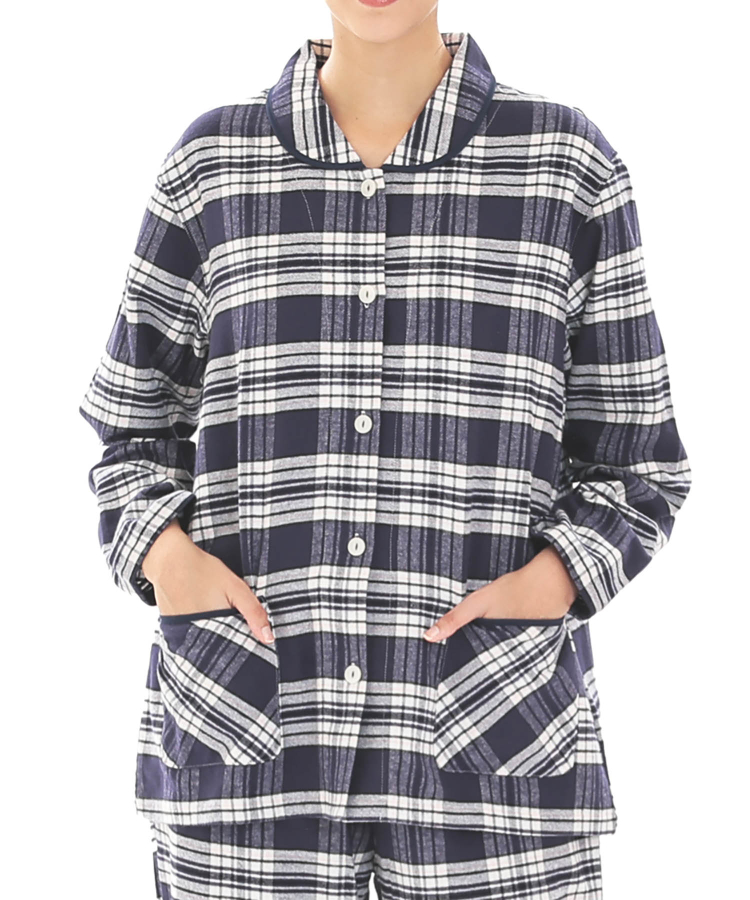 使いやすいベーシックな丸襟のシャツパジャマ。