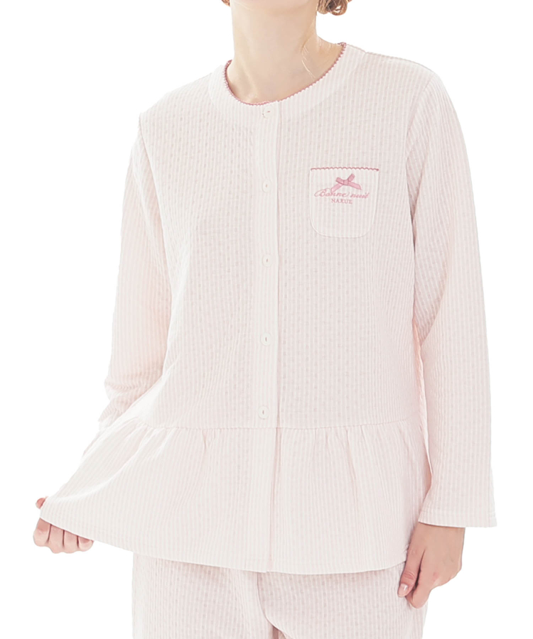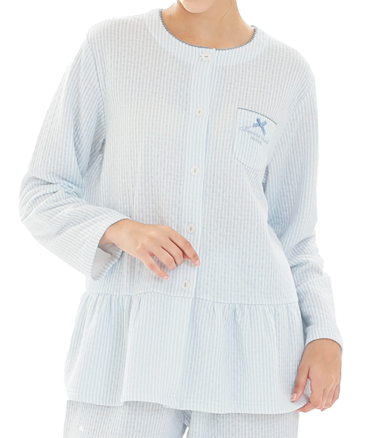 裾に向かってふんわりと広がるペプラムラインが、女性らしいやわらかさを引き立てる前開きパジャマ。