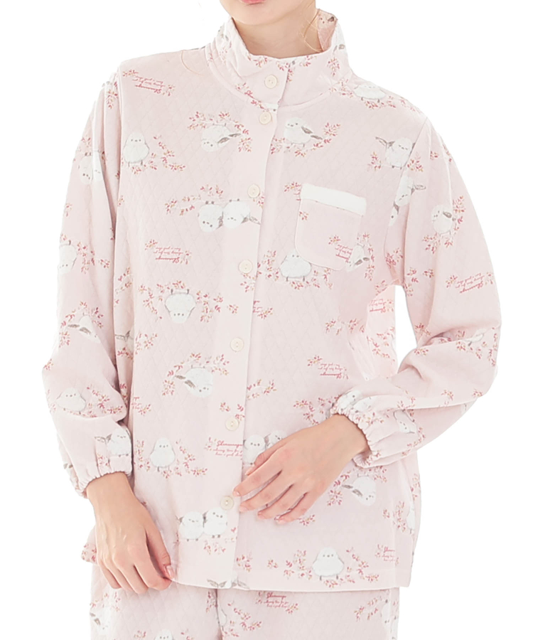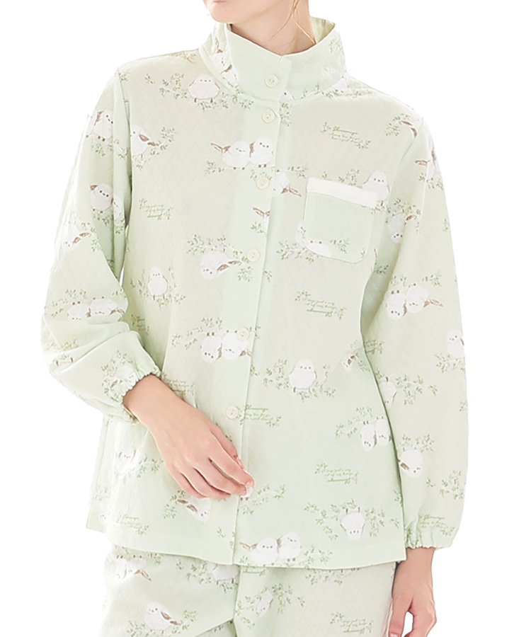 やわらかなカラーをベースに小さな枝にとまるシマエナガたちを散りばめた、癒しのデザイン。