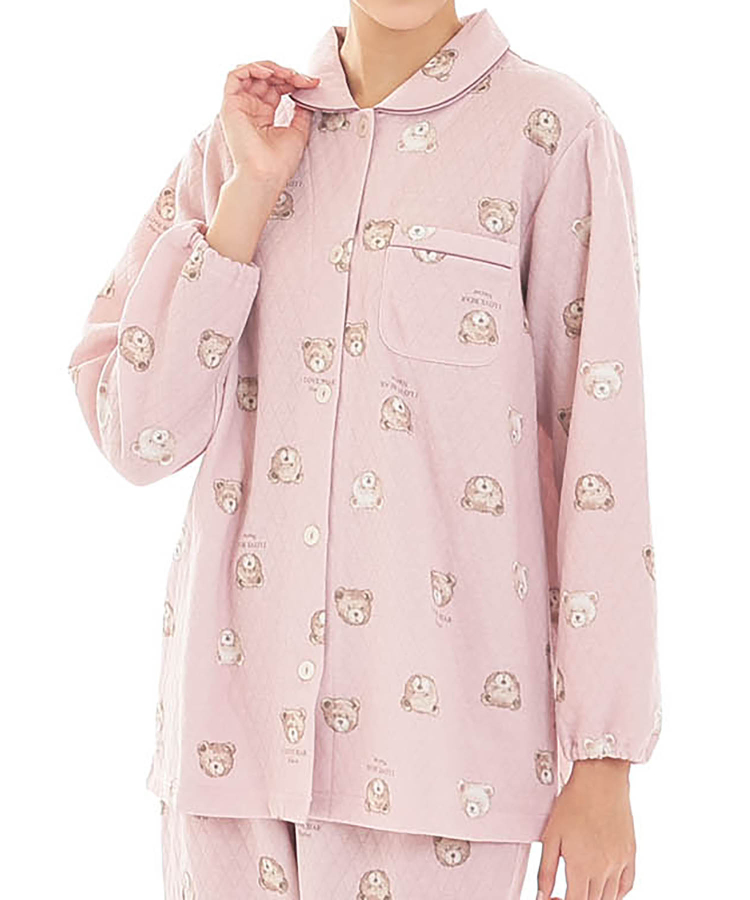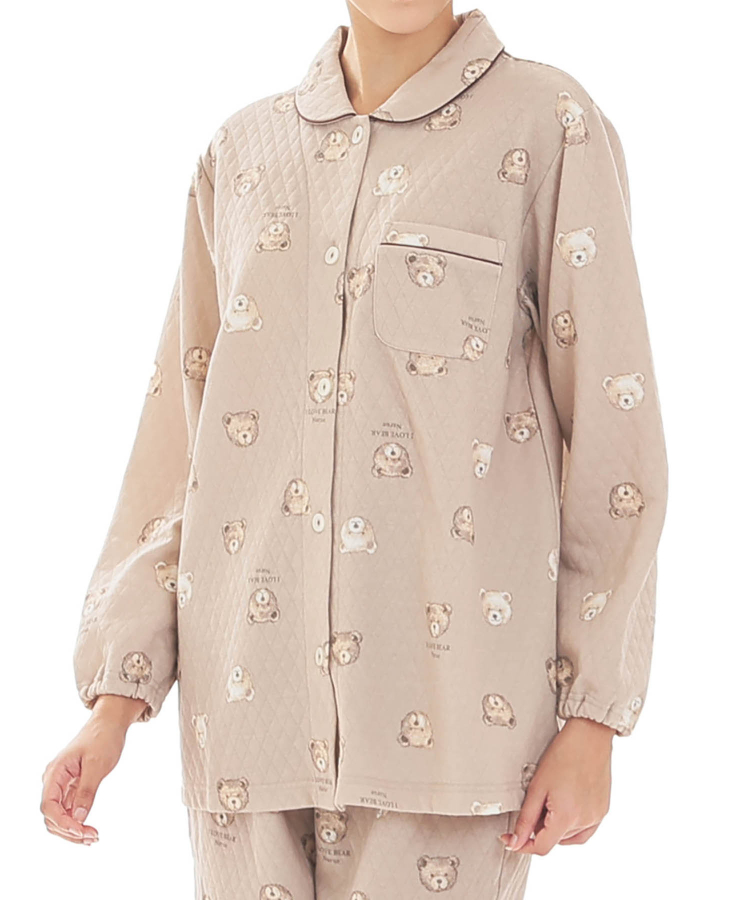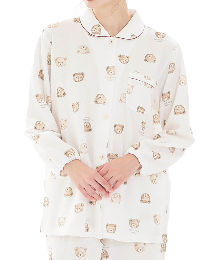 トップスはシャツタイプで、上品な印象に。胸元にはポイントになるポケット付き。小さなベアがのぞく遊び心のあるデザインです。