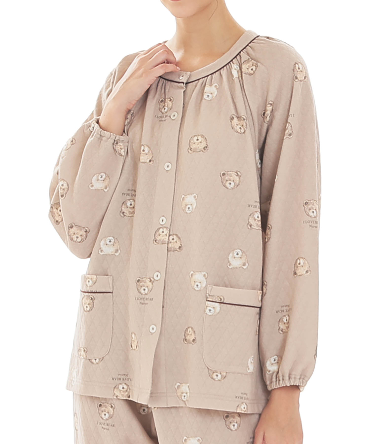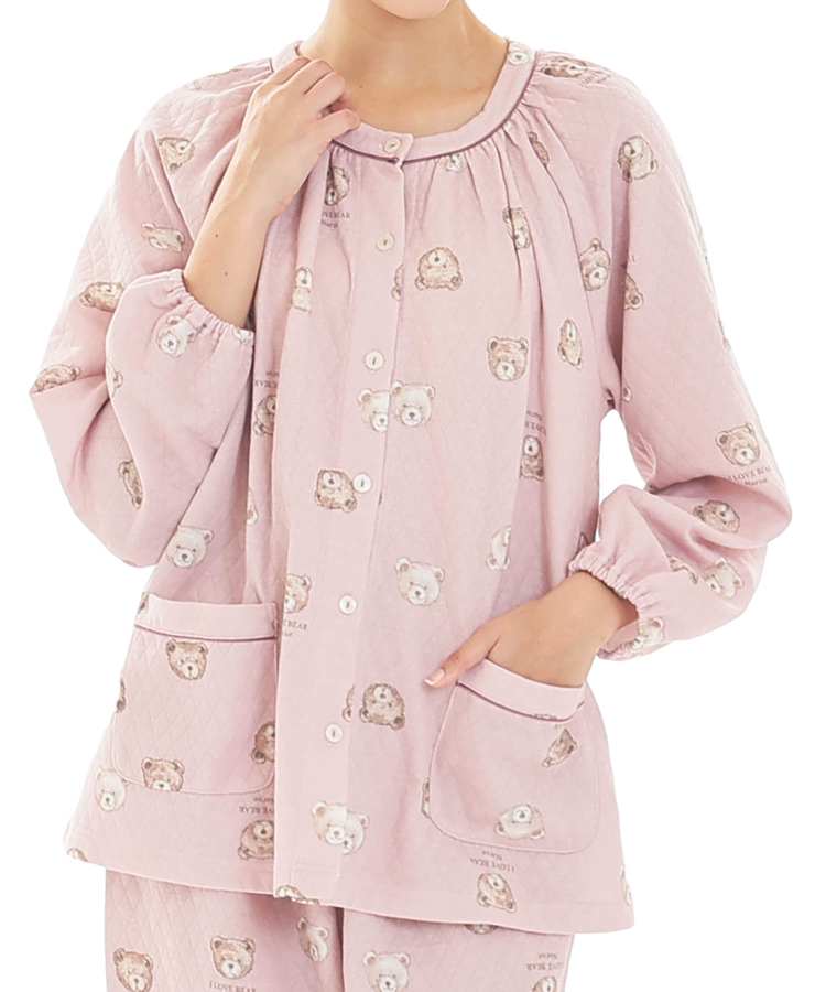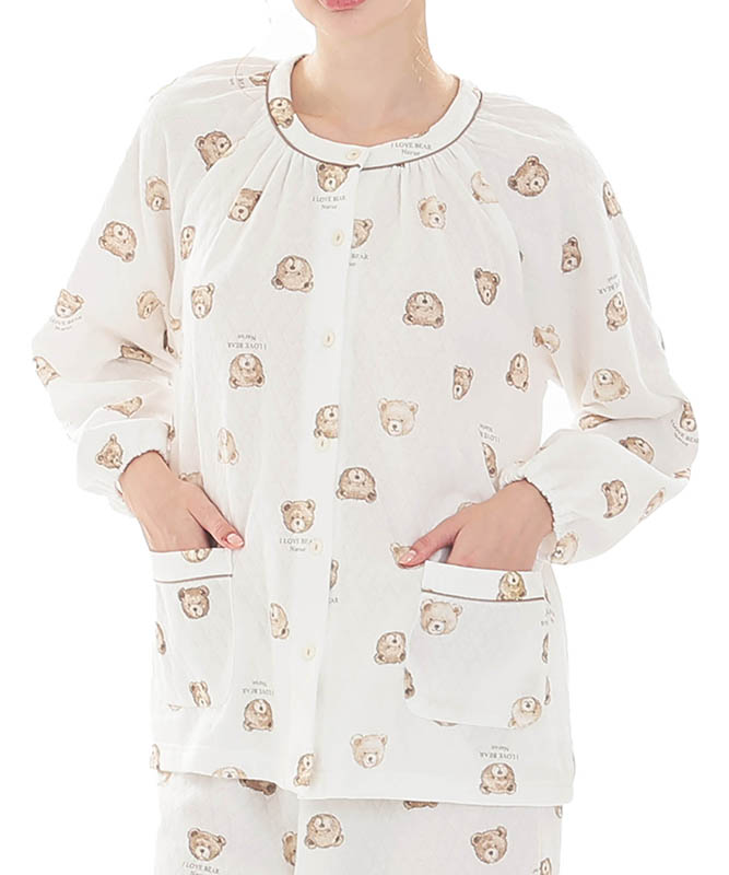 首元にギャザーをたっぷり寄せた丸みのあるシルエットのパジャマ。