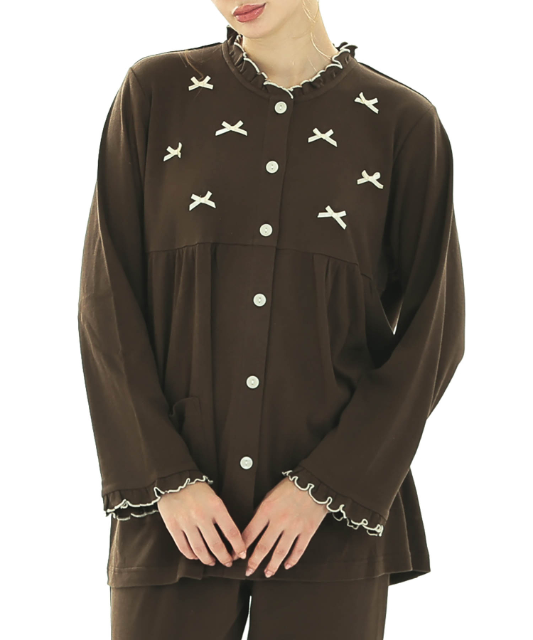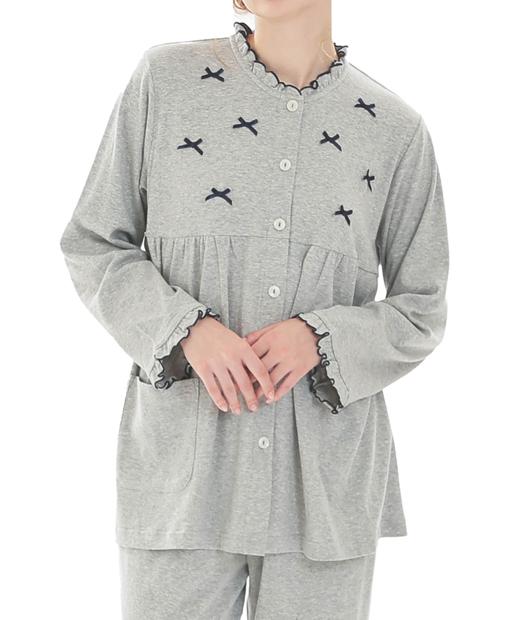 胸元に小さなサテンリボンを散りばめた大人可愛い一着。