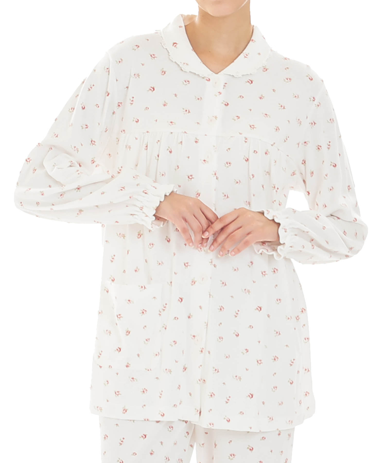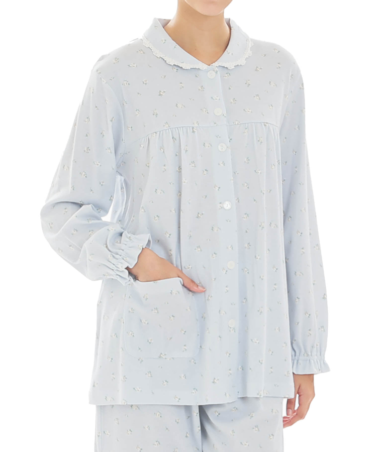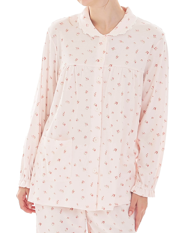 丸襟をお花のレースで縁取り、定番のシャツパジャマのアクセントに。
