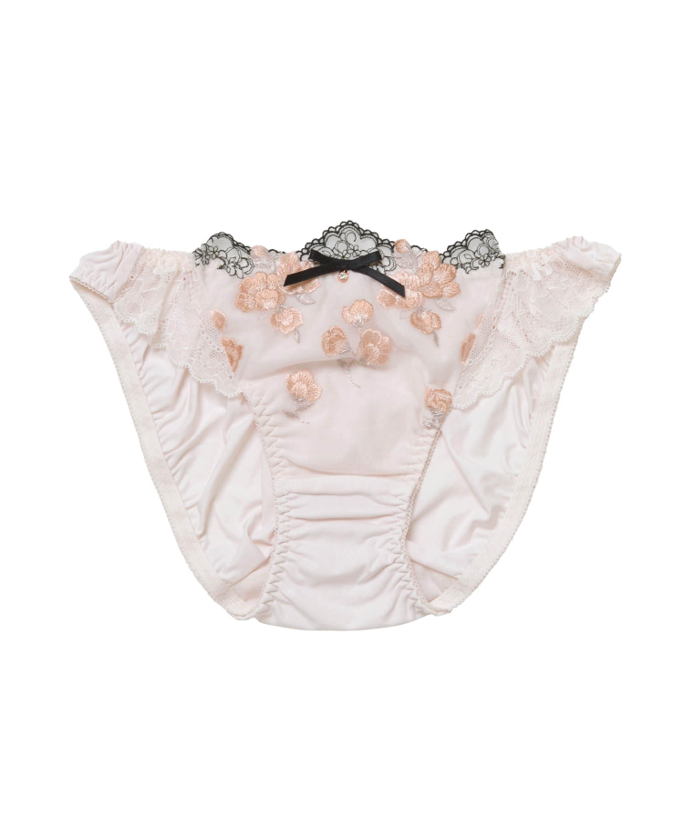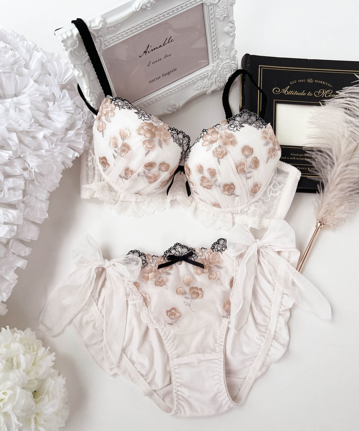 ベージュ:ベージュにブラックのスカラ刺繍が印象的。大人っぽくまとめたフラワー刺繍が際立つ配色に仕上げました。