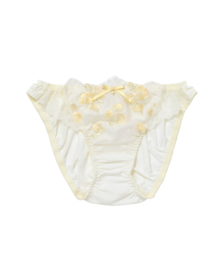 女性らしいフラワー刺繍と幾何学模様をスカラップにほどこし、華やかで印象に残るデザインに。