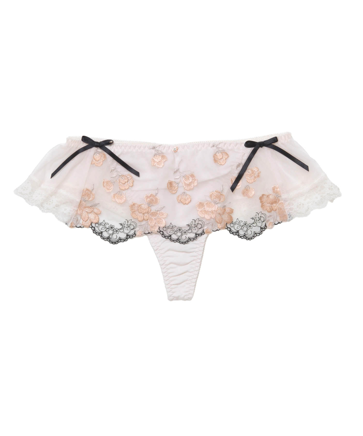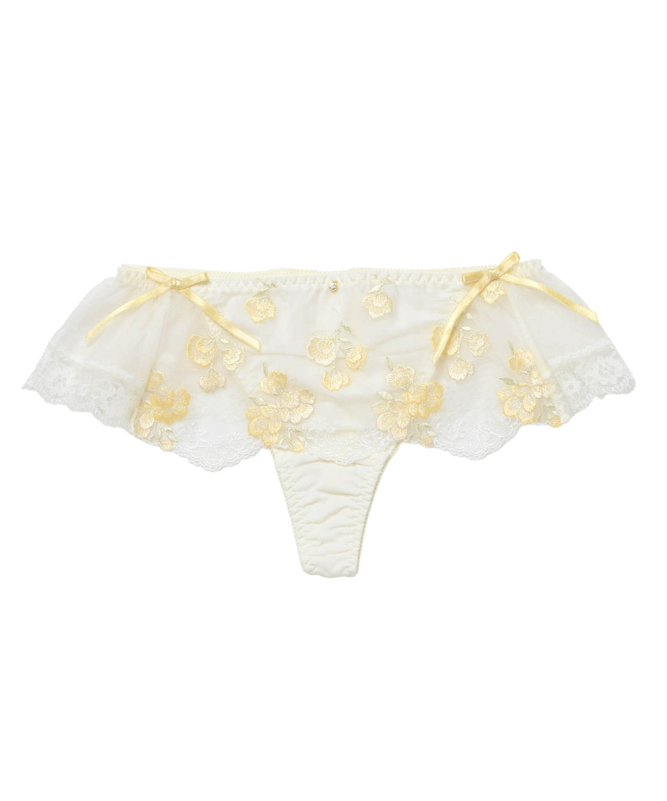 スカートのようなふんわりシルエットに仕上げたTショーツ。後ろ身頃は細幅のチュールレースを使用しました。